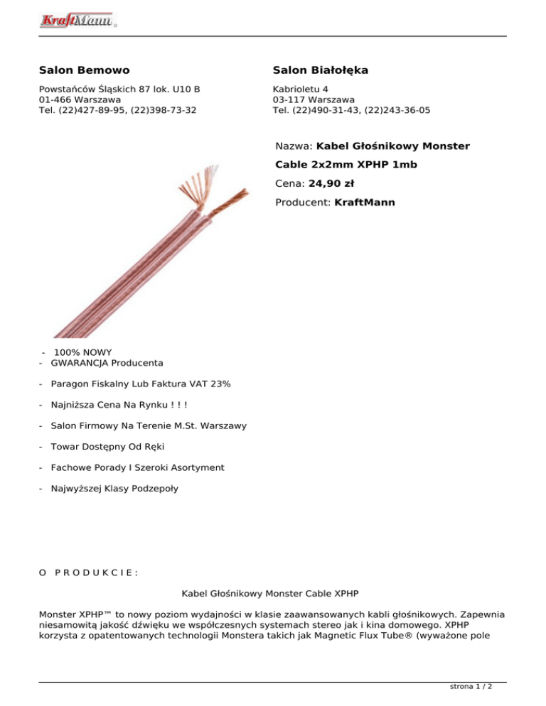 Salon Bemowo Salon Białołęka Powstańców Śląskich 87 lok. U10 B 01-466 Warszawa Tel. (22)427-89-95, (22)398-73-32 Kabrioletu 4 03-117 Warszawa Tel. (22)490-31-43, (22)243-36-05 Nazwa: Kabel Głośnikowy Monster Cable 2x2mm XPHP 1mb Cena: 24,90 zł Producent: KraftMann - 100% NOWY - GWARANCJA Producenta - Paragon Fiskalny Lub Faktura VAT 23% - Najniższa Cena Na Rynku ! ! ! - Salon Firmowy Na Terenie M.St. Warszawy - Towar Dostępny Od Ręki - Fachowe Porady I Szeroki Asortyment - Najwyższej Klasy Podzepoły O PRODUKCIE: Kabel Głośnikowy Monster Cable XPHP Monster XPHP™ to nowy poziom wydajności w klasie zaawansowanych kabli głośnikowych. Zapewnia niesamowitą jakość dźwięku we współczesnych systemach stereo jak i kina domowego. XPHP korzysta z opatentowanych technologii Monstera takich jak Magnetic Flux Tube® (wyważone pole strona 1 / 2 magnetyczne -rozwiązanie zapewniające pełną reprodukcję najniższych partii częstotliwości dzięki czemu otrzymujemy bardziej naturalny dźwięk) oraz Time Correct® (gwarantuje równoczesny przepływ niskich i wysokich częstotliwości). Nad bezpieczeństwem sygnału czuwa dielektryk LPE (Linear Polyethylene) a całość zamknięta jest w elastycznej powłoce zewnętrznej - patent firmy Monster - Duraflex® odpornej na promieniowanie UV, ścieranie i chemiczne zanieczyszczenia. Kabel doskonale nadaje się do układania w podtynkowych instalacjach audio. Monster XPHP™ sprawi, że Twój system audio osiągnie większą przejrzystość dźwięku przy wyższej wydajności oraz głęboki niski bas o niespotykanej dynamice w tak przystępnej cenie! Ogólna charakterystyka produktu: · konstrukcja single wire · kabel wykonany z miedzi beztlenowej (PC OFC) o bardzo wysokim stopniu czystości -99,999% zapewnia praktycznie bezstratne przesłanie oryginalnego materiału audio · przekrój kabla - dwie żyły po 2 mm2 dielektryk LPE (Linear Polyethylene) - redukujący możliwe straty sygnału · Magnetic Flux Tube® - wyważone pole magnetyczne - rozwiązanie zapewniające pełną reprodukcję najniższych partii częstotliwości dzięki czemu otrzymujemy bardziej naturalny dźwięk · · Time Correct® - gwarantuje równoczesny przepływ niskich i wysokich częstotliwości elastyczna powłoka zewnętrzna - patent firmy Monster - Duraflex® odporna na promieniowanie UV, ścieranie i chemiczne zanieczyszczenia Najtaniej W PL strona 2 / 2 Powered by TCPDF (www.tcpdf.org)