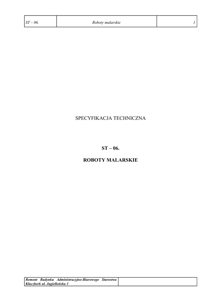 ST – 06. Roboty malarskie SPECYFIKACJA TECHNICZNA ST – 06. ROBOTY MALARSKIE Remont Budynku Administracyjno-Biurowego Starostwa Kluczbork ul. Jagiellońska 3 1 ST – 06. Roboty malarskie 2 1. WSTĘP. 1.1. Przedmiot SST. Przedmiotem niniejszej szczegółowej specyfikacji technicznej (SST) są wymagania dotyczące wykonania i odbioru robót malarskich, realizowanych w ramach projektu „Remont Budynku Administracyjno-Biurowego Starostwa Kluczbork przy ul. Jagiellońskiej 3 w Kluczborku” 1.2. Zakres stosowania SST. Szczegółowa specyfikacja techniczna jest stosowana jako dokument przetargowy i kontraktowy przy zlecaniu i realizacji robót wymienionych w pkt. 1.1. 1.3. Zakres robót objętych SST. Roboty, których dotyczy specyfikacja, obejmują wszystkie czynności umożliwiające i mające na celu wykonanie robót malarskich w obiekcie. 1.4. Określenia podstawowe. Określenia podane w niniejszej SST są zgodne z obowiązującymi odpowiednimi normami i ST – 00.00. 1.5. Ogólne wymagania dotyczące robót. Wykonawca robót jest odpowiedzialny za jakość ich wykonania oraz za zgodność z dokumentacją projektową, SST i poleceniami Inżyniera. 2. MATERIAŁY. 2.1. Rozcieńczalniki W zależności od rodzaju farby należy stosować: − benzynę – do farb i emalii olejnych, − inne rozcieńczalniki przygotowane fabrycznie dla poszczególnych rodzajów farb. Rozcieńczalniki powinny odpowiadać normom państwowym lub mięć cechy techniczne zgodne z zaświadczeniem o jakości wydanym przez producenta oraz z zakresem ich stosowania. 2.2. Farby budowlane gotowe. 2.2.1. Wymagania ogólne. Farby niezależnie od ich rodzaju powinny odpowiadać wymaganiom norm państwowych lub świadectw dopuszczenia do stosowania w budownictwie. 2.2.2. Farby olejne i ftalowe. Farba olejna do gruntowania ogólnego stosowania wg PN-C-81901:2002 − wydajność - 6-8 m2/dm3 − czas schnięcia - 12 h Farby olejne i ftalowe nawierzchniowe ogólnego stosowania wg PN-C-81901/2002 − wydajność - 6-10 m2/dm3 2.2.3. Farby emulsyjne i akrylowe wytwarzane fabrycznie wewnętrzne. Na tynkach można stosować farby emulsyjne, akrylowe i silikatowe zgodnie z zasadami podanymi w normach i świadectwach ich dopuszczenia przez ITB. 3. SPRZĘT. Roboty można wykonać przy użyciu pędzli, wałków lub aparatów natryskowych. Do oczyszczania elementów stalowych należy używać szczotek stalowych. 4. TRANSPORT. Farby należy transportować zgodnie z przepisami obowiązującymi w transporcie kolejowym lub drogowym. Transport farb może odbywać się tylko w opakowaniach zabezpieczającym przed wpływami czynników atmosferycznych. Temperatura transportowania i składowania powinna wynosić od 5 do 25 oC. 5. WYKONANIE ROBÓT. 5.1. Wymagania ogólne Przy malowaniu powierzchni wewnętrznych temperatura nie powinna być niższa niż +8°C. W okresie zimowym pomieszczenia należy ogrzewać. W ciągu 2 dni przed rozpoczęciem malowania pomieszczenia powinny być ogrzane do temperatury co najmniej +8°C. Po zakończeniu malowania można dopuścić do stopniowego obniżania temperatury, jednak przez 3 dni nie może spaść potniej +1°C. Remont Budynku Administracyjno-Biurowego Starostwa Kluczbork ul. Jagiellońska 3 ST – 06. Roboty malarskie 3 W czasie malowania niedopuszczalne jest nawietrzanie malowanych powierzchni ciepłym powietrzem od przewodów wentylacyjnych i urządzeń ogrzewczych. 5.2. Przygotowanie podłoży metalowych. Powierzchnie metalowe powinny być oczyszczone, odtłuszczone zgodnie z wymaganiami normy PN-ISO 85011:1996, dla danego typu farby podkładowej. 5.3. Gruntowanie elementów metalowych. Przy malowaniu farbami olejnymi i syntetycznymi powierzchnie stosuje się odpowiednie farby podkładowe. 5.4. Wykonywania powłok malarskich elementów metalowych. Powłoki z farb i lakierów olejnych i syntetycznych powinny mieć barwę jednolita zgodna ze wzorcem, bez smug, zacieków, uszkodzeń, zmarszczeń, pęcherzy, plam i zmiany odcienia. Powłoki powinny mieć jednolity połysk. Przy malowaniu wielowarstwowym nie należy na poszczególne warstwy stosować farby w różnych odcieniach. 5.5. Przygotowanie podłoży z tynków. Podłoże posiadające drobne uszkodzenia powierzchni powinny być, naprawione przez wypełnienie ubytków zaprawa cementowo-wapienna. Powierzchnie powinny być oczyszczone z kurzu i brudu, wystających drutów, nacieków zaprawy itp. Odstające tynki należy odbić, a rysy poszerzyć i ponownie wypełnić zaprawą cementowowapienną. 5.6. Gruntowanie podłoży z tynków. Przy malowaniu farbami emulsyjnymi do gruntowania stosować farbę emulsyjną tego samego rodzaju z jakiej ma być wykonana powłoka lecz rozcieńczoną woda w stosunku 1:3-5. 5.7. Wykonywania powłok malarskich podłoży z tynków. Powłoki z farb emulsyjnych i akrylowych powinny być niezmywalne, przy stosowaniu środków myjących i dezynfekujących. Powłoki powinny dawać aksamitno-matowy wygląd powierzchni. Barwa powłok powinna być jednolita, bez smug i plam. Powierzchnia powłok bez uszkodzeń, smug, plam i śladów pędzla. 6. KONTROLA JAKOŚCI. 6.1. Powierzchnia do malowania. Kontrola stanu technicznego powierzchni przygotowanej do malowania powinna obejmować: − sprawdzenie wyglądu powierzchni, − sprawdzenie wsiąkliwości, − sprawdzenie wyschnięcia podłoża, − sprawdzenie czystości, Sprawdzenie wyglądu powierzchni pod malowanie należy wykonać przez oględziny zewnętrzne. 6.2. Roboty malarskie. 6.2.1. Badania powłok przy ich odbiorach należy przeprowadzić po zakończeniu ich wykonania nie wcześniej niż po 14 dniach. 6.2.2. Badania przeprowadza się przy temperaturze powietrza nie niższej niż +5°C przy wilgotności powietrza mniejszej od 65%. 6.2.3. Badania powinny obejmować: − sprawdzenie wyglądu zewnętrznego, − sprawdzenie zgodności barwy ze wzorcem, − dla farb olejnych i syntetycznych: sprawdzenie powłoki na zarysowanie i uderzenia, sprawdzenie elastyczności i twardości