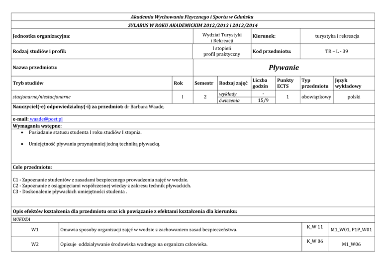 Akademia Wychowania Fizycznego i Sportu w Gdańsku SYLABUS W ROKU AKADEMICKIM 2012/2013 i 2013/2014 Jednostka organizacyjna: Wydział Turystyki i Rekreacji Kierunek: Rodzaj studiów i profil: I stopień profil praktyczny Kod przedmiotu: turystyka i rekreacja TR – L - 39 Pływanie Nazwa przedmiotu: Tryb studiów Rok stacjonarne/niestacjonarne I Semestr 2 Rodzaj zajęć wykłady ćwiczenia Liczba godzin 15/9 Punkty ECTS 1 Typ przedmiotu Język wykładowy obowiązkowy polski Nauczyciel(-e) odpowiedzialny(-i) za przedmiot: dr Barbara Waade, e-mail: [email protected] Wymagania wstępne: • Posiadanie statusu studenta I roku studiów I stopnia. • Umiejętność pływania przynajmniej jedną techniką pływacką. Cele przedmiotu: C1 - Zapoznanie studentów z zasadami bezpiecznego prowadzenia zajęć w wodzie. C2 - Zapoznanie z osiągnięciami współczesnej wiedzy z zakresu technik pływackich. C3 - Doskonalenie pływackich umiejętności studenta . Opis efektów kształcenia dla przedmiotu oraz ich powiązanie z efektami kształcenia dla kierunku: WIEDZA W1 Omawia sposoby organizacji zajęć w wodzie z zachowaniem zasad bezpieczeństwa. W2 Opisuje oddziaływanie środowiska wodnego na organizm człowieka. K_W 11 K_W 06 M1_W01, P1P_W01 M1_W06 UMIEJĘTNOŚCI U1 Organizuje zajęcia zgodnie z zasadami bezpieczeństwa i bezpiecznie porusza się w środowisku wodnym. U2 Demonstruje i pływa współczesnymi sportowymi technikami pływackimi. K_U07 M1_U01, M1_U07, M1_U11 K_U07 M1_U01, M1_U07, M1_U11 KOMPETENCJE K1 Argumentuje znaczenie pływania w dbaniu o poziom sprawności fizycznej niezbędny do pomnażania zdrowia, kształcenia się i wykonywania zadań zawodowych. K2 Wykazuje dbałość o bezpieczeństwo osób uczestniczących w zajęciach rekreacyjnych w wodzie. K_K02 K_K12 M1_K09, M1_K01, S1P_K06 M1_K07, S1P_K04 W1 – kolokwium W2 - kolokwium U1 – Ocena zachowania się studenta i przestrzegania zasad bezpieczeństwa w wodzie w czasie obserwacji przedłużonej. U2 – sprawdzian praktyczny (ocena poziomu sprawności pływackiej mierzona testem Coopera w wodzie). Sprawdzian umiejętności pływania na dystansie 50 m (ocena techniki wybranych, dwóch sportowych technik pływania - do wyboru: styl grzbietowy, dowolny i klasyczny). K1 - przygotowanie autorskiego zestawu ćwiczeń w wodzie z uwzględnieniem poziomu sprawności fizycznej uczestników zajęć. K2 – przygotowanie autorskiego zestawu ćwiczeń z uwzględnieniem dbałości o bezpieczeństwo uczestników zajęć rekreacyjnych w wodzie. Aby uzyskać zaliczenie przedmiotu na ocenę dostateczną student musi osiągnąć wszystkie wymienione w programie efekty kształcenia. Metody i formy realizacji przedmiotu: Ćwiczenia i sprawdziany praktyczne. Metoda syntetyczna, analityczna i kompleksowa Treści kształcenia: Wykłady: brak Ćwiczenia: 1. 2. 3. 4. 5. Bezpieczeństwo i organizacja zajęć w wodzie. Weryfikacja sprawności pływackiej. Technika pływania stylem grzbietowym. Technika pływania stylem dowolnym (kraulem). Technika pływania stylem klasycznym. Forma zaliczenia: zaliczenie na ocenę. Literatura: Podstawowa: 1. Bartkowiak E. 1995. Sportowa technika pływania. Wydawnictwo COS RCMS KF i S, Warszawa. 2. Bartkowiak E. 1999. Pływanie sportowe. Biblioteka trenera. Wydawnictwo COS, Warszawa. 3. Bielec G., Klajman P. 2007. Rekreacja w wodzie nie tylko na ładną pogodę. Wychowanie Fizyczne i Zdrowotne, Nr 2, s. 6-9. 4. Bondarowicz M. 1996. Zabawy i gry ruchowe na cztery pory roku-lato. Wydawnictwo Bellona. Warszawa. 5. Ostrowski A. 2003. Zabawy i rekreacja w wodzie. WSiP, Warszawa. Uzupełniająca: 1. Czabański B., Fiłon M. 1994. Elementy teorii pływania. Wydawnictwo AWF Wrocław. Bilans punktów ECTS (1 pkt ECTS – 25-30 godz. pracy studenta): Obciążenie studenta Studia stacjonarne Aktywność Udział w ćwiczeniach Przygotowanie się do ćwiczeń Konsultacje Samodzielne doskonalenie technik pływackich Całkowite obciążenie pracą studenta Punkty ECTS za przedmiot Studia niestacjonarne 15 godz. 9 godz. 5godz. 5 godz. 3godz. 6 godz. 7 godz. 10 godz. 30 godz. 30 godz. 1 pkt ECTS