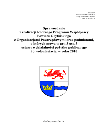 Załącznik do uchwały Nr V/36/2011 Rady Powiatu w Gryfinie z dnia 14.04.2011 r. Sprawozdanie z realizacji Rocznego Programu Współpracy Powiatu Gryfińskiego z Organizacjami Pozarządowymi oraz podmiotami, o których mowa w art. 3 ust. 3 ustawy o działalności pożytku publicznego i o wolontariacie, w roku 2010 Gryfino, marzec 2011 r. I. Wstęp Zgodnie z zapisami ustawy z dnia 24 kwietnia 2003 r. o działalności pożytku publicznego i o wolontariacie, współpraca Powiatu Gryfińskiego z organizacjami pozarządowymi w roku 2010 zaplanowana została w uchwalonym przez Radę Powiatu w dniu 21 grudnia 2009 r. programie współpracy. Uchwała określająca treść programu była wynikiem wspólnej pracy wydziałów merytorycznych Starostwa Powiatowego i jednostek organizacyjnych powiatu. W roku 2010 liczba organizacji pozarządowych na terenie powiatu zarejestrowanych w dokumentach rejestrowych wynosiła 238 (wg zestawienia w tabeli nr 1). Tabela 1 Zestawienie organizacji zarejestrowanych w ewidencji w roku 2010: Rodzaj organizacji Stowarzyszenia kultury fizycznej Uczniowskie kluby sportowe Stowarzyszenia zwykłe Stowarzyszenia zarejestrowane w Krajowym Rejestrze Sądowym Fundacje Stowarzyszenia terenowe RAZEM Tabela 2 Nowopowstałe organizacje w latach 2008-2010: Rok Zakres działania Rodzaj organizacji Stowarzyszenia Stowarzyszenia organizacji Fundacje KRS zwykłe Sport 2 2 Kultura 1 0 Edukacja 0 Gospodarka/ Praca 1 8 Rozwój regionalny Inne 3 Łącznie 6 1 Sport 2 Kultura 4 0 Edukacja 1 0 Gospodarka/ Praca 9 Rozwój regionalny 1 1 Inne 1 Łącznie 7 1 Sport 2 Kultura 1 0 Edukacja 1 1 1 Gospodarka/ Praca 1 0 Rozwój regionalny 1 Inne 1 Łącznie 4 2 Liczba 36 42 15 121 6 18 238 SKF i UKS 8 8 3 3 3 3 Łącznie w roku 10 1 1 3 15 3 4 1 2 1 11 3 1 2 1 1 1 9 Zadania statutowe, wykonywane przez organizacje obejmują wiele dziedzin życia powiatu, ze szczególnym uwzględnieniem sfer, w których występują największe potrzeby społeczności lokalnych (pomoc społeczna, przeciwdziałanie wykluczeniu społecznemu, osoby starsze i niepełnosprawne, aktywność fizyczna dzieci i młodzieży, kultura). II. Realizacja programu współpracy Współpraca Powiatu przy realizacji zadań publicznych odbywała się poprzez stosowanie trybu otwartego konkursu ofert – art. 11 ust. 2 ustawy z dnia 24 kwietnia 2003 r. o działalności pożytku publicznego i o wolontariacie (Dz.U. z 2010 r. Nr 234, poz. 1536) oraz w innych trybach przewidzianych w przepisach. 1. WSPÓŁPRACA FINANSOWA – OTWARTE KONKURSY 1) Zadania z zakresu pomocy społecznej oraz wspierania osób niepełnosprawnych Realizując zadania z zakresu pomocy społecznej Zarząd Powiatu ogłosił konkurs na wspieranie realizacji zadań z zakresu rehabilitacji zawodowej i społecznej osób niepełnosprawnych zlecanych fundacjom oraz organizacjom pozarządowym w 2010 r. Konkurs został ogłoszony w celu realizacji zadań wynikających z art. 36 ust 2 i 3 ustawy z dnia 27 sierpnia 1997r. o rehabilitacji zawodowej i społecznej oraz zatrudnianiu osób niepełnosprawnych (Dz. U. z 2008 r. Nr 14, poz. 92 z późn. zm.) W wyniku rozstrzygnięcia konkursu dotację ze środków PFRON w kwocie 22.000,00 zł otrzymało Polskie Stowarzyszenie na Rzecz Osób z Upośledzeniem Umysłowym Koło w Gryfinie. Zlecone zadanie pozwoliło na objęcie rehabilitacją zawodową i społeczną osoby niepełnosprawne. 2) Zadania z zakresu kultury i sztuki oraz kultury fizycznej i turystyki W roku 2010 ogólna kwota dotacji z budżetu Powiatu na realizację zadań przez organizacje pozarządowe wyniosła 54.379,83 zł. Zarząd Powiatu ogłosił konkurs na wspieranie realizacji zadań z obszaru kultury i sztuki oraz kultury fizycznej i turystyki. W odpowiedzi na ogłoszony konkurs wpłynęło: - 7 ofert z obszaru turystyki, - 1 oferta z obszaru kultury i sztuki, - 25 ofert z obszaru kultury fizycznej. Dotacje na wsparcie realizacji zadań przyznano 17 organizacjom wykazanym w tabeli nr 3. Tabela 3 Wykaz podmiotów, które otrzymały dotację z budżetu Powiatu Gryfińskiego na realizację zadań publicznych w roku 2010 w trybie otwartego konkursu ofert: Nazwa organizacji Nazwa zadania Całkowity koszt zadania, zgodnie ze sprawozdaniem końcowym Kwota przyznanej i wykorzystanej dotacji Środki własne, pochodzące z innych źródeł DZIAŁ 630 - TURYSTYKA Stowarzyszenie na Rzecz Rozwoju Turystyki na Ziemi Bańskiej „BIAŁOSTROŃ” w Baniach Międzyszkolny Klub Sportowy „HERMES” w Gryfinie Stowarzyszenie „TWINNING” w Trzcińsku Zdroju Uczniowski Klub Sportowy „Orlik” w Trzcińsku Zdroju Rajdy rowerowe o zasięgu powiatowym: „Drugie wielkie wiosenne kręcenie” „Drugie wielkie jesienne kręcenie” 1.159,43 1.000,00 159,43 Gryfińskie Rajdy Rowerowe 9.100,00 2.600,00 6.500,00 „Śladami Boga i człowieka, czyli zabytki architektury sakralnej na terenie powiatu gryfińskiego” Rajd rowerowy „Pamięci żołnierzy polskich” związanych z 90 rocznicą bitwy warszawskiej 1920 roku. 1.870,00 800,00 1.070,00 2.238,00 700,00 1.538,00 Nazwa organizacji Regionalne Stowarzyszenie Inicjatyw Obywatelskich „GOGOLANDER” w Trzcińsku Zdroju Całkowity koszt zadania, zgodnie ze sprawozdaniem końcowym Nazwa zadania Kontikowskie jesienne marsze na orientację „Bocianie Gniazdo 2010” Razem Kwota przyznanej i wykorzystanej dotacji Środki własne, pochodzące z innych źródeł 1.714,66 1.000,00 714,66 16.082,09 6.100,00 9.982,09 DZIAŁ 921 – KULTURA I OCHRONA DZIEDZICTWA NARODOWEGO Stowarzyszenie DOUZELAGE w Chojnie Projekt dot. integracji młodzieży szkolnej (polskiej i angielskiej) 3.999,83 3.999,83 0,00 Razem 3.999,83 3.999,83 3.999,83 2.039,44 700,00 1.339,44 929,00 300,00 629,00 2.160,43 800,00 1.360,43 65.508,99 6.000,00 59.508,99 21.100,18 26.974,09 3.300,00 5.080,00 17.800,18 21.894,09 45.005,00 3.000,00 42.005,00 4.181,41 2.100,00 2.081,41 6.964,72 3.000,00 3.964,72 8.124,32 2.000,00 6.124,32 4.919,19 1.500,00 3.419,19 19.240,81 2.000,00 17.240,81