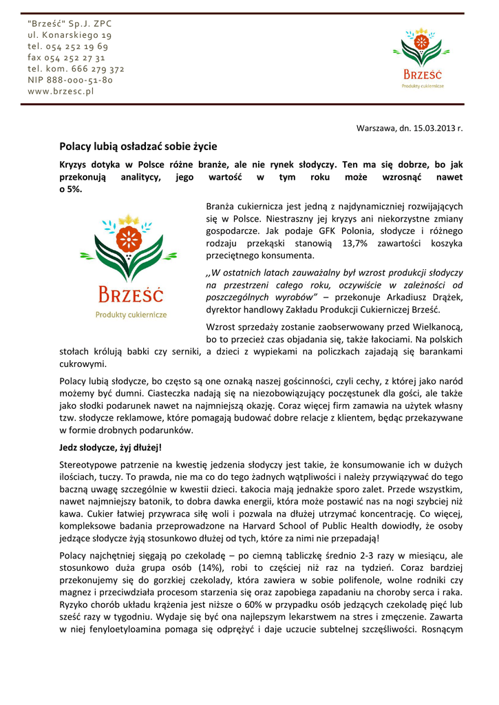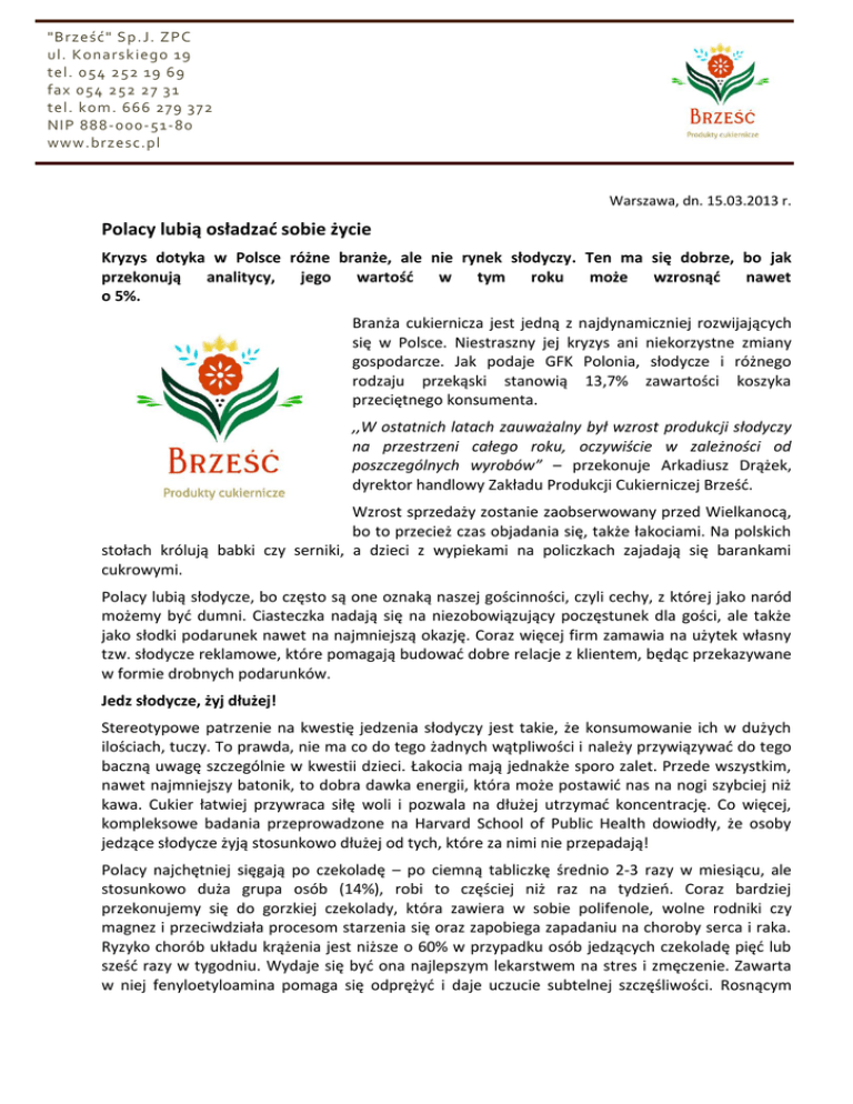 "Brześć" Sp.J. ZPC ul. Konarskiego 19 tel. 054 252 19 69 fax 054 252 27 31 tel. kom. 666 279 3 72 NIP 888-000-51-80 www.brzesc.pl Warszawa, dn. 15.03.2013 r. Polacy lubią osładzać sobie życie Kryzys dotyka w Polsce różne branże, ale nie rynek słodyczy. Ten ma się dobrze, bo jak przekonują analitycy, jego wartość w tym roku może wzrosnąć nawet o 5%. Branża cukiernicza jest jedną z najdynamiczniej rozwijających się w Polsce. Niestraszny jej kryzys ani niekorzystne zmiany gospodarcze. Jak podaje GFK Polonia, słodycze i różnego rodzaju przekąski stanowią 13,7% zawartości koszyka przeciętnego konsumenta. ,,W ostatnich latach zauważalny był wzrost produkcji słodyczy na przestrzeni całego roku, oczywiście w zależności od poszczególnych wyrobów” – przekonuje Arkadiusz Drążek, dyrektor handlowy Zakładu Produkcji Cukierniczej Brześć. Wzrost sprzedaży zostanie zaobserwowany przed Wielkanocą, bo to przecież czas objadania się, także łakociami. Na polskich stołach królują babki czy serniki, a dzieci z wypiekami na policzkach zajadają się barankami cukrowymi. Polacy lubią słodycze, bo często są one oznaką naszej gościnności, czyli cechy, z której jako naród możemy być dumni. Ciasteczka nadają się na niezobowiązujący poczęstunek dla gości, ale także jako słodki podarunek nawet na najmniejszą okazję. Coraz więcej firm zamawia na użytek własny tzw. słodycze reklamowe, które pomagają budować dobre relacje z klientem, będąc przekazywane w formie drobnych podarunków. Jedz słodycze, żyj dłużej! Stereotypowe patrzenie na kwestię jedzenia słodyczy jest takie, że konsumowanie ich w dużych ilościach, tuczy. To prawda, nie ma co do tego żadnych wątpliwości i należy przywiązywać do tego baczną uwagę szczególnie w kwestii dzieci. Łakocia mają jednakże sporo zalet. Przede wszystkim, nawet najmniejszy batonik, to dobra dawka energii, która może postawić nas na nogi szybciej niż kawa. Cukier łatwiej przywraca siłę woli i pozwala na dłużej utrzymać koncentrację. Co więcej, kompleksowe badania przeprowadzone na Harvard School of Public Health dowiodły, że osoby jedzące słodycze żyją stosunkowo dłużej od tych, które za nimi nie przepadają! Polacy najchętniej sięgają po czekoladę – po ciemną tabliczkę średnio 2-3 razy w miesiącu, ale stosunkowo duża grupa osób (14%), robi to częściej niż raz na tydzień. Coraz bardziej przekonujemy się do gorzkiej czekolady, która zawiera w sobie polifenole, wolne rodniki czy magnez i przeciwdziała procesom starzenia się oraz zapobiega zapadaniu na choroby serca i raka. Ryzyko chorób układu krążenia jest niższe o 60% w przypadku osób jedzących czekoladę pięć lub sześć razy w tygodniu. Wydaje się być ona najlepszym lekarstwem na stres i zmęczenie. Zawarta w niej fenyloetyloamina pomaga się odprężyć i daje uczucie subtelnej szczęśliwości. Rosnącym "Brześć" Sp.J. ZPC ul. Konarskiego 19 tel. 054 252 19 69 fax 054 252 27 31 tel. kom. 666 279 3 72 NIP 888-000-51-80 www.brzesc.pl powodzeniem cieszą się również stricte polskie smakołyki jak np. słomka ptysiowa produkowana przez Brześć. Warto od czasu do czasu sięgnąć po ciasto z alkoholem, które paradoksalnie ma dobry wpływ na nasze uzębienie. W cieście tym znajdują się bowiem substancje określane jako poliole, które skutecznie chronią organizm przed różnymi bakteriami, także tymi odpowiedzialnymi za próchnicę. Jak przekonują analitycy, w tym roku rynek słodyczy w Polsce może wzrosnąć od 3 do 5 procent, pomimo spodziewanego spowolnienia gospodarczego. Nic w tym dziwnego, bo chociaż portfele Polaków na przełomie ostatnich miesięcy na pewno się nie powiększyły, to akurat łakoci nie chcemy sobie odmawiać. I słusznie, bo co lepiej osłodzi nam życie niż kostka czekolady czy kruche ciasteczko? Kontakt dla mediów: Korneliusz Smolik [email protected] Tel: +48 510 796 217 ___ "Brześć" Sp.J. ZPC - Rodzinna firma istniejąca od 1984 roku. Brześć specjalizuje się w tradycyjnych, opartych na domowych recepturach wyrobów cukierniczych. Produkty Brześcia są sprzedawane poprzez przedstawicieli i dystrybutorów na terenie całej Polski.