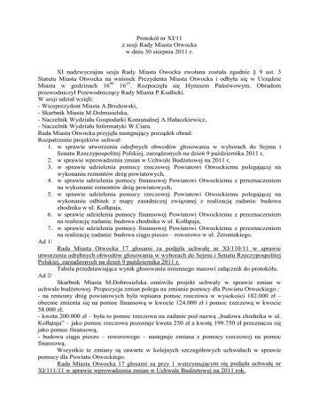 Protokół nr XI/11 z sesji Rady Miasta Otwocka w dniu 30 sierpnia 2011 r. XI nadzwyczajna sesja Rady Miasta Owocka zwołana została zgodnie § 9 ust. 3 Statutu Miasta Otwocka na wniosek Prezydenta Miasta Otwocka i odbyła się w Urzędzie Miasta w godzinach 1600 1615. Rozpoczęła się Hymnem Państwowym. Obradom przewodniczył Przewodniczący Rady Miasta P.Kudlicki. W sesji udział wzięli: - Wiceprezydent Miasta A.Brodowski, - Skarbnik Miasta M.Dobrosielska, - Naczelnik Wydziału Gospodarki Komunalnej A.Hałaczkiewicz, - Naczelnik Wydziału Informatyki W.Ciara. Rada Miasta Otwocka przyjęła następujący porządek obrad: Rozpatrzenie projektów uchwał: 1. w sprawie utworzenia odrębnych obwodów głosowania w wyborach do Sejmu i Senatu Rzeczypospolitej Polskiej, zarządzonych na dzień 9 października 2011 r, 2. w sprawie wprowadzenia zmian w Uchwale Budżetowej na 2011 r, 3. w sprawie udzielenia pomocy rzeczowej Powiatowi Otwockiemu polegającej na wykonaniu remontów dróg powiatowych, 4. w sprawie udzielenia pomocy finansowej Powiatowi Otwockiemu z przeznaczeniem na wykonanie remontów dróg powiatowych, 5. w sprawie udzielenia pomocy rzeczowej Powiatowi Otwockiemu polegającej na wykonaniu odbitek z mapy zasadniczej związanej z realizacją zadania: budowa chodnika w ul. Kołłątaja, 6. w sprawie udzielenia pomocy finansowej Powiatowi Otwockiemu z przeznaczeniem na realizację zadania: budowa chodnika w ul. Kołłątaja, 7. w sprawie udzielenia pomocy finansowej Powiatowi Otwockiemu z przeznaczeniem na realizację zadania: budowa ciągu pieszo – rowerowo w ul. Żeromskiego. Ad 1/ Rada Miasta Otwocka 17 głosami za podjęła uchwałę nr XI/110/11 w sprawie utworzenia odrębnych obwodów głosowania w wyborach do Sejmu i Senatu Rzeczypospolitej Polskiej, zarządzonych na dzień 9 października 2011 r. Tabela przedstawiająca wynik głosowania imiennego stanowi załącznik do protokółu. Ad 2/ Skarbnik Miasta M.Dobrosielska omówiła projekt uchwały w sprawie zmian w uchwale budżetowej. Propozycja zmian polega na zmianie pomocy dla Powiatu Otwockiego.: - na remonty dróg powiatowych była wpisana pomoc rzeczowa w wysokości 182.000 zł – obecnie zmienia się na pomoc finansową w kwocie 124.000 zł i pomoc rzeczową w kwocie 58.000 zł, - kwota 200.000 zł – była to pomoc rzeczowa na zadanie pod nazwą „budowa chodnika w ul. Kołłątaja” – jako pomoc rzeczowa pozostaje kwota 250 zł a kwotę 199.750 zł przeznacza się jako pomoc finansową, - budowa ciągu pieszo – rowerowego – następuje zmiana z pomocy rzeczowej na pomoc finansową. Wszystkie te zmiany są zawarte w kolejnych szczegółowych uchwałach w sprawie pomocy dla Powiatu Otwockiego. Rada Miasta Otwocka 17 głosami za przy 1 wstrzymującym się podjęła uchwałę nr XI/111/11 w sprawie wprowadzenia zmian w Uchwale Budżetowej na 2011 rok. Tabela przedstawiająca wynik głosowania imiennego stanowi załącznik do protokółu. Ad 3/ Rada Miasta Otwocka 17 głosami za przy 1 wstrzymującym się podjęła uchwałę nr XI/112/11 w sprawie udzielenia pomocy rzeczowej Powiatowi Otwockiemu polegającej na wykonaniu remontów dróg powiatowych. Tabela przedstawiająca wynik głosowania imiennego stanowi załącznik do protokółu. Ad 4/ Rada Miasta Otwocka 17 głosami za przy 1 wstrzymującym się podjęła uchwałę nr XI/113/11 w sprawie udzielenia pomocy finansowej Powiatowi Otwockiemu polegającej na wykonaniu remontów dróg powiatowych. Tabela przedstawiająca wynik głosowania imiennego stanowi załącznik do protokółu. Ad 5/ Rada Miasta Otwocka 17 głosami za przy 1 wstrzymującym się podjęła uchwałę nr XI/115/11 w sprawie udzielenia pomocy rzeczowej Powiatowi Otwockiemu polegającej na wykonaniu odbitek z mapy zasadniczej związanej z realizacją zadania: budowa chodnika w ul. Kołłątaja. Tabela przedstawiająca wynik głosowania imiennego stanowi załącznik do protokółu. Ad 6/ Rada Miasta Otwocka 17 głosami za przy 1 wstrzymującym się podjęła uchwałę nr XI/116/11 w sprawie udzielenia pomocy finansowej Powiatowi Otwockiemu z przeznaczeniem na realizację zadania: budowa chodnika w ul. Kołłątaja. Tabela przedstawiająca wynik głosowania imiennego stanowi załącznik do protokółu. Ad 7/ Rada Miasta Otwocka 17 głosami za przy 1 wstrzymującym się podjęła uchwałę nr XI/117/11 w sprawie udzielenia pomocy finansowej Powiatowi Otwockiemu z przeznaczeniem na realizację zadania: budowa ciągu pieszo – rowerowo w ul. Żeromskiego. Tabela przedstawiająca wynik głosowania imiennego stanowi załącznik do protokółu. Obrady zakończone zostały Hymnem Państwowym. Protokółowała E.Lesiak Przewodniczący Rady Miasta Piotr Kudlicki