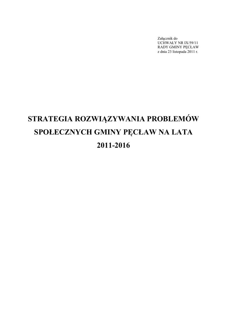 Załącznik do UCHWAŁY NR IX/59/11 RADY GMINY PĘCŁAW z dnia 23 listopada 2011 r. STRATEGIA ROZWIĄZYWANIA PROBLEMÓW SPOŁECZNYCH GMINY PĘCŁAW NA LATA 2011-2016 SPIS TREŚCI 1. WSTĘP .................................................................................................................................................3 1.1. Struktura dokumentu……………………………………………………………………………….5 1.2. Przesłanki wynikające z dokumentów strategicznych……………………………………………..5 1.3. Konkretyzacja Strategii lizbońskiej w obszarze integracji społecznej ……………………………8 2. CHARAKTERYSTYKA GMINY PĘCŁAW ...................................................................................13 2.1. Demografia Gminy Pęcław .............................................................................................................19 2.2. Oświata w Gminie Pęcław...............................................................................................................21 2.3. Bezrobocie .......................................................................................................................................22 2.4. Bezdomność ....................................................................................................................................23 2.5. Alkoholizm i narkomania ................................................................................................................23 2.6. Ubóstwo...........................................................................................................................................25 2.7. Niepełnosprawność .........................................................................................................................26 2.8. Patologie społeczne i przestępczość ................................................................................................27 2.9. Pomoc społeczna .............................................................................................................................29 3. ANALIZA SWOT…………………………………………………………………………………..35 4. WYZNACZONE CELE ROZWIĄZYWANIA PROBLEMÓW SPOŁECZNYCH NE TERENIE GMINY PĘCŁAW .................................................................................................................................38 4.1. Cel strategiczny: Przeciwdziałanie przemocy w rodzinie ...............................................................39 4.1.1. Dzieci ...........................................................................................................................................41 4.1.2. Młode matki z dziećmi .................................................................................................................41 4.1.3. Osoby starsze................................................................................................................................42 4.2. Cel strategiczny: Aktywizacja poszczególnych grup .....................................................................43 4.2.1. Dzieci z rodzin zagrożonych patologią ........................................................................................43 4.2.2. Młode matki .................................................................................................................................45 4.2.3. Osoby powyżej 50 roku życia .....................................................................................................46 5. ZASOBY UMOŻLIWIAJĄCE ROZWIĄZYWANIE PROBLEMÓW SPOŁECZNYCH NA TERENIE GMINY PĘCŁAW ………………………………………………………………………...49 6. MONITORING STRATEGII.............................................................................................................50 ZAKOŃCZENIE ....................................................................................................................................52 Spis tabel i rysunków .............................................................................................................................53 8 KB Pretendent, ul. Kazimierza Wielkiego 65, 50-077 Wrocław, www.pretendent.eu 2 1. WSTĘP Gminna Strategia Rozwiązywania Problemów Społecznych nakreśla kierunki polityki społecznej, jej priorytety oraz ogólne działania mające na celu połączenie programów instytucji, organizacji i administracji wokół problemów społecznych występujących lub mogących wystąpić w przyszłości na terenie Gminy Pęcław. Wskazuje działania, które należy zrealizować aby zapewnić mieszkańcom Gminy jak najkorzystniejsze warunki sprzyjające rozwojowi społecznemu oraz wzrostowi poczucia bezpieczeństwa w wymiarze społecznym. Zachodzące zmiany w kraju, a także na terenie naszej gminy niosą za sobą pozytywne jak i negatywne skutki społeczne. Znaczna grupa osób bezrobotnych, mieszkańców Gminy Pęcław stała się świadczeniobiorcami pomocy społecznej i narażona jest na długotrwałą marginalizację materialno – społeczną. Niewystarczające środki finansowe przeznaczane na pomoc społeczną, zmuszają do poszukiwania jak najefektywniejszych metod działania na rzecz rodzin i osób wymagających wsparcia. Zadaniem gminy jest udzielanie takiego wsparcia osobom i rodzinom, które umożliwi im samodzielną egzystencję, da szansę zaspokojenia podstawowych potrzeb, zapewni skuteczną realizację ról społecznych i stworzy możliwości rozwoju. Skuteczna pomoc, to wyjście z systemu pomocy społecznej, usunięcie bądź ograniczanie występujących dysfunkcji, czy też wyprowadzenie z grupy ryzyka w każdym przypadku, kiedy jest to możliwe. Skuteczność takich działań jest uwarunkowana kompleksowym podejściem do problemów i wprowadzaniem systemowych rozwiązań. Strategia dotyczy lat 2011 – 2016, a więc kolejnych kilku lat wybiegają