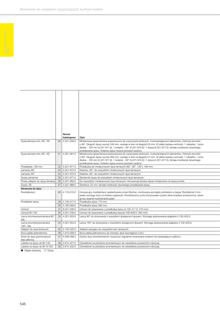 Czyszczenie suchym lodem Akcesoria do urządzeń czyszczących suchym lodem Numer katalogowy Opis Dysza łamana mini, 90°, XS 20 4.321-259.0 Dysza łamana mini, 60°, XS 21 4.321-261.0 Przedłużka, 100 mm 22 5.321-971.0 Miniaturowa dysza łamana przeznaczona do czyszczenia drobnych, trudnodostępnych elementów. Odchyla strumień o 90°. Długość dyszy wynosi 240 mm, wystaje w bok na długość 63 mm. W skład zestawu wchodzi: 1 nakrętka, 1 przedłużka - 100 mm (5.321-971.0), 1 kolanko - 90° (5.321-973.0) i 1 dysza (5.321-977.0). Istnieje możliwość dowolnego przedłużania dyszy. Kolanko dyszy można zamówić osobno. Miniaturowa dysza łamana przeznaczona do czyszczenia drobnych, trudnodostępnych elementów. Odchyla strumień o 60°. Długość dyszy wynosi 260 mm, wystaje w bok na długość 57 mm. W skład zestawu wchodzi: 1 nakrętka, 1 przedłużka - 100 mm (5.321-971.0), 1 kolanko - 60° (5.321-972.0) i 1 dysza (5.321-977.0). Istnieje możliwość dowolnego przedłużania dyszy. Kolanko dyszy można zamówić osobno. Przedłużka do miniaturowych dysz łamanych (60°, 90°, 135°), 100 mm. Łamanie, 90° 23 5.321-973.0 Kolanko, 90°, do wszystkich miniaturowych dysz łamanych. Łamanie, 60° 24 5.321-972.0 Kolanko, 60°, do wszystkich miniaturowych dysz łamanych. Dysza zamienna 25 5.321-977.0 Zamiennik dyszy do wszystkich miniaturowych dysz łamanych. Prosty adapter do dyszy łamanej 26 5.321-992.0 Do wszystkich miniaturowych dysz łamanych. Konwertuje łamane dysze miniaturowe na dysze proste. Dysza, XS 27 4.321-989.0 Średnica: 22 mm. Istnieje możliwość dowolnego przedłużania dyszy. Rozdrabniacz 28 4.110-015.0 Przedłużka dyszy 29 4.130-417.0 Innowacyjny rozdrabniacz opatentowany przez Kärcher, montowany pomiędzy pistoletem a dyszą. Rozdrabnia 3 mm pelety suchego lodu na drobne cząsteczki. Rozdrobniony suchy lód pozwala czyścić silnie wrażliwe powierzchnie. Istnieją trzy stopnie rozdrobnienia pelet. Przedłużka dyszy 170 mm. 30 4.760-658.0 Przedłużka dyszy 300 mm. Uchwyt 31 6.321-206.0 Uchwyt do stosowania z przedłużką dyszy (4.130-417.0, 170 mm). Uchwyt IB 7/40 32 4.321-248.0 Uchwyt do stosowania z przedłużką dyszy(4.760-658.0, 300 mm). Lanca strumieniowa łamana 90°, XXL Lanca strumieniowa łamana 105°, XXL Adapter do dysz łamanych 33 4.321-203.0 Lanca 90° do stosowania z wszystkimi dostępnymi dyszami. Wymaga zastosowania adaptera 4.130-425.0. 34 4.321-204.0 Lanca 105° do stosowania z wszystkimi dostępnymi dyszami. Wymaga zastosowania adaptera 4.130-425.0. 35 4.130-425.0 Adapter pasujący do wszystkich lanc łamanych. Klucz płaski jednostronny 36 7.815-009.0 Klucz płaski jednostronny do montażu dysz (wymagane 2 szt.) Smar do dysz gwintowanych (bez silikonu) Latarka na dyszy do IB 7/40 37 6.288-088.0 Gwinty dysz strumieniowych muszą być regularnie smarowane smarem nie zawierającym sylikonu. 38 2.815-421.0 Oświetlenie na pistolecie strumieniowym do oświetlania powierzchni roboczej. Latarka na dyszy do IB 15/120 39 2.815-422.0 Oświetlenie na pistolecie strumieniowym do oświetlania powierzchni roboczej. Akcesoria do dysz Objęte dostawą Opcja 546