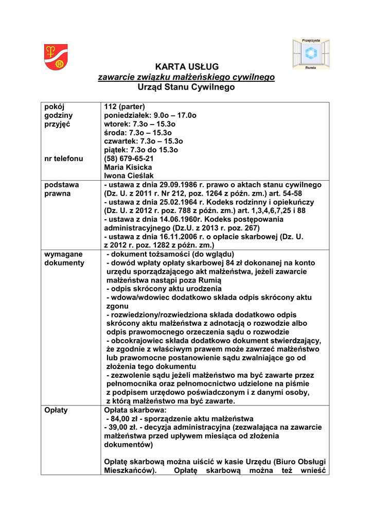 KARTA USŁUG zawarcie związku małżeńskiego cywilnego Urząd Stanu Cywilnego pokój godziny przyjęć nr telefonu podstawa prawna wymagane dokumenty Opłaty 112 (parter) poniedziałek: 9.0o – 17.0o wtorek: 7.3o – 15.3o środa: 7.3o – 15.3o czwartek: 7.3o – 15.3o piątek: 7.3o do 15.3o (58) 679-65-21 Maria Kisicka Iwona Cieślak - ustawa z dnia 29.09.1986 r. prawo o aktach stanu cywilnego (Dz. U. z 2011 r. Nr 212, poz. 1264 z późn. zm.) art. 54-58 - ustawa z dnia 25.02.1964 r. Kodeks rodzinny i opiekuńczy (Dz. U. z 2012 r. poz. 788 z późn. zm.) art. 1,3,4,6,7,25 i 88 - ustawa z dnia 14.06.1960r. Kodeks postępowania administracyjnego (Dz.U. z 2013 r. poz. 267) - ustawa z dnia 16.11.2006 r. o opłacie skarbowej (Dz. U. z 2012 r. poz. 1282 z późn. zm.) - dokument tożsamości (do wglądu) - dowód wpłaty opłaty skarbowej 84 zł dokonanej na konto urzędu sporządzającego akt małżeństwa, jeżeli zawarcie małżeństwa nastąpi poza Rumią - odpis skrócony aktu urodzenia - wdowa/wdowiec dodatkowo składa odpis skrócony aktu zgonu - rozwiedziony/rozwiedziona składa dodatkowo odpis skrócony aktu małżeństwa z adnotacją o rozwodzie albo odpis prawomocnego orzeczenia sądu o rozwodzie - obcokrajowiec składa dodatkowo dokument stwierdzający, że zgodnie z właściwym prawem może zawrzeć małżeństwo lub prawomocne postanowienie sądu zwalniające go od złożenia tego dokumentu - zezwolenie sądu jeżeli małżeństwo ma być zawarte przez pełnomocnika oraz pełnomocnictwo udzielone na piśmie z podpisem urzędowo poświadczonym i z danymi osoby, z którą małżeństwo ma być zawarte. Opłata skarbowa: - 84,00 zł - sporządzenie aktu małżeństwa - 39,00 zł. - decyzja administracyjna (zezwalająca na zawarcie małżeństwa przed upływem miesiąca od złożenia dokumentów) Opłatę skarbową można uiścić w kasie Urzędu (Biuro Obsługi Mieszkańców). Opłatę skarbową można też wnieść termin załatwiania sprawy sposób załatwienia tryb odwoławczy uwagi gotówkowo lub bezgotówkowo (np. w formie elektronicznej) na konto Urzędu Miasta w Rumi nr 47 8351 0003 0000 2394 2000 0160 z zaznaczeniem tytułu opłaty i danych identyfikujących wpłacającego. Oryginał dowodu wpłaty należy przedłożyć przy składaniu dokumentów. Małżeństwo przed kierownikiem Urzędu Stanu Cywilnego nie może być zawarte przed upływem miesiąca od dnia, kiedy osoby złożyły zapewnienia. Kierownik Urzędu Stanu Cywilnego może zezwolić (w formie decyzji administracyjnej) na zawarcie małżeństwa przed upływem tego terminu, jeżeli przemawiają za tym ważne względy - złożenie przed kierownikiem Urzędu Stanu Cywilnego pisemnego zapewnienia, że nie istnieją okoliczności wyłączające zawarcie małżeństwa (osoba, która nie zna języka polskiego składa oświadczenie w obecności tłumacza przysięgłego języka, którym włada) - złożenie przed kierownikiem Urzędu Stanu Cywilnego oświadczeń o wstąpieniu w związek małżeński W przypadku odmowy wydania zaświadczenia, która zostaje przez kierownika Urzędu Stanu Cywilnego wydana w formie pisemnej można w terminie 14 dni licząc od dnia otrzymania pisma wystąpić do Sądu Rejonowego o rozstrzygnięcie czy okoliczności przedstawione przez kierownika uzasadniają odmowę dokonania czynności. - Celem złożenia zapewnienia należy stawić się przed kierownikiem Urzędu Stanu Cywilnego w dowolnym urzędzie stanu cywilnego w Polsce (niezależnie od miejsca stałego zameldowania), a za granicą przed polskim konsulem. - Małżeństwo mogą zawrzeć osoby pełnoletnie, jednakże sąd opiekuńczy może zezwolić na zawarcie małżeństwa kobiecie, która ukończyła 16 lat. - Wszystkie przedkładane odpisy aktów stanu cywilnego powinny być opłacone.