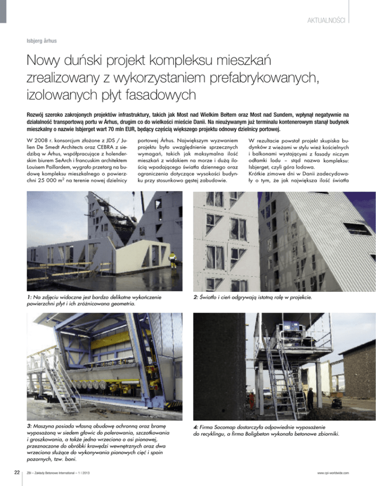 AKTUALNOŚCI Isbjerg a° rhus Nowy duński projekt kompleksu mieszkań zrealizowany z wykorzystaniem prefabrykowanych, izolowanych płyt fasadowych Rozwój szeroko zakrojonych projektów infrastruktury, takich jak Most nad Wielkim Bełtem oraz Most nad Sundem, wpłynął negatywnie na ° działalność transportową portu w Arhus, drugim co do wielkości mieście Danii. Na nieużywanym już terminalu kontenerowym stanął budynek mieszkalny o nazwie Isbjerget wart 70 mln EUR, będący częścią większego projektu odnowy dzielnicy portowej. W 2008 r. konsorcjum złożone z JDS / Julien De Smedt Architects oraz CEBRA z sie° dzibą w Arhus, współpracujące z holenderskim biurem SeArch i francuskim architektem Louisem Paillardem, wygrało przetarg na budowę kompleksu mieszkalnego o powierzchni 25 000 m2 na terenie nowej dzielnicy 22 ° portowej Arhus. Największym wyzwaniem projektu było uwzględnienie sprzecznych wymagań, takich jak maksymalna ilość mieszkań z widokiem na morze i dużą ilością wpadającego światła dziennego oraz ograniczenia dotyczące wysokości budynku przy stosunkowo gęstej zabudowie. W rezultacie powstał projekt skupiska budynków z wieżami w stylu wież kościelnych i balkonami wystającymi z fasady niczym odłamki lodu – stąd nazwa kompleksu: Isbjerget, czyli góra lodowa. Krótkie zimowe dni w Danii zadecydowały o tym, że jak największa ilość światła 1: Na zdjęciu widoczne jest bardzo delikatne wykończenie powierzchni płyt i ich zróżnicowana geometria. 2: Światło i cień odgrywają istotną rolę w projekcie. 3: Maszyna posiada własną obudowę ochronną oraz bramę wyposażoną w siedem głowic do polerowania, szczotkowania i groszkowania, a także jedno wrzeciono o osi pionowej, przeznaczone do obróbki krawędzi wewnętrznych oraz dwa wrzeciona służące do wykonywania pionowych cięć i spoin pozornych, tzw. boni. 4: Firma Socomap dostarczyła odpowiednie wyposażenie do recyklingu, a firma Boligbeton wykonała betonowe zbiorniki. ZBI – Zakłady Betonowe International – 1 | 2013 www.cpi-worldwide.com 15. – 21. kwietnia Monachium KRAJ PARTNERSKI Indonezja Skorzystaj na jednym z najszybciej rozwijaja ˛cych sie ˛ rynków świata! 5: Niebieski odcień uzyskano dzięki szklanym obrzeżom balkonów. dziennego wpadająca do pomieszczeń stała się priorytetem. Oprócz optymalnego ustawienia poszczególnych budynków istotne znaczenie miał dobór kruszywa i wykończenie powierzchni prefabrykowanych, izolowanych płyt fasadowych. Około 80% konstrukcyjnych prefabrykatów betonowych na potrzeby projektu prze° budowy portu w Arhus dostarczy firma A/S Boligbeton z siedzibą w Lo/ sning, opis której był publikowany w ZBI nr 4/2004. Oprócz dostawy sprężonych płyt TT i stropowych sprężonych płyt kanałowych, firma Boligbeton jest w stanie, dzięki odpowiednio wcześniej dokonanej inwestycji w system obróbki powierzchni firmy Socomap, spełnić dodatkowo wszystkie wymagania dotyczące wykończenia płyt fasadowych wykorzystywanych w projekcie. Carsten Varneskov, dyrektor wykonawczy stwierdził: „Wszystkie inwestycje, które zrealizowaliśmy we współpracy firmy Techmart w ciągu ostatnich dziesięciu lat okazały się sukcesem, niemniej jednak Socomap jest jedną z naszych najlepszych inwestycji. Bez tej niewiarygodnej maszyny nie moglibyśmy spełnić wszystkich wymagań dotyczących wykończenia płyt na potrzeby pro° jektu przebudowy portu Arhus.“ Maszyna, przedstawiona na rys. 3 podczas montażu, posiada własną obudowę ochronną oraz ramę wyposażoną w siedem głowic do polerowania, szczotkowania i groszkowania, a także jedno wrzeciono o osi pionowej, przeznaczone do obróbki krawędzi wewnętrznych oraz dwa wrzeciona służące do wykonywania pionowych cięć i spoin pozornych, tzw. boni. Z boku podstawowej konstrukcji maszyny znajduje się brama z dwoma wrzecionami umożliwiającymi wykonywanie cięć i spoin ślepych w poziomie. Jedna z głowic zamontowanych na ramie może obracać się we wszystkich kierunkach tworząc różne efekty artystyczne, np. logo firmowe. Rysunki na płytach fasadowych kompleksu Isbjerget zostały stworzone za pomocą programu PreCAD i przesłane bezpośrednio do maszyny Socomap. Praca maszyny jest całkowicie zautomatyzowana i wymaga nadzoru tylko jednego operatora. Płyty mocuje się na stojaku, a maszyna przesuwa się wzdłuż nich po szynach. W ciągu 10h maszyna poleruje 300 m2 powierzchni płyt. Odzyskiwanie wody, prasy z filtrem i czyste środowisko to bardzo ważne elementy procesu polerowania. Firma Socomap dostarczyła odpowiednie wyposażenie do recyklingu (rys. 4), a firma Boligbeton wykonała betonowe osadniki. Podczas procesu obróbki woda spływa z płyt do zbiornika znajdującego się pod posadzką. Resztki cementu znajdujące się w wodzie są cały czas utrzymywane w postaci zawiesiny. Zawiesina jest pompowana ze zbiornika do prasy z filtrem. Przefiltrowana woda trafia do zbiornika z czystą wodą, skąd jest z powrotem pompowana do maszyny polerującej. Placek filtracyjny jest prasowany i usuwany. Większość kruszywa naturalnego występującego w Danii ma stosunkowo ciemny kolor. Jednym z wymogów projektu było odbijanie światła w różnych warunkach atmosferycznych, więc zdecydowano się sprowadzić białe kruszywo marmurowe z Thassos w Grecji. Większości wydaje się, że góry lodowe są nieskazitelnie białe, choć w rzeczywistości zawierają śladowe Teraz zbadaj puls przyszłości. Targi bauma 2013 czekaja ˛ na Ciebie. Weź udział – w targach superlatyw z blisko: 500.000 odwiedzaja˛cych 3.300 wystawców 570.000 m2 powierzchni wystawienniczej Zgłoś sie˛ online i zaoszcze˛dź! Skorzystaj i zgłoś si˛e bezpośrednio online: www.bauma.de/tickets/en www.cpi-worldwide.com ZBI – Zakłady Betonowe International – 1 | 2013 AKTUALNOŚCI 15.-21.4.2013 Strefa otwarta F 11 Stoisko 1105/1 6: Nawet w ekstremalnych warunkach pogodowych maszyna 