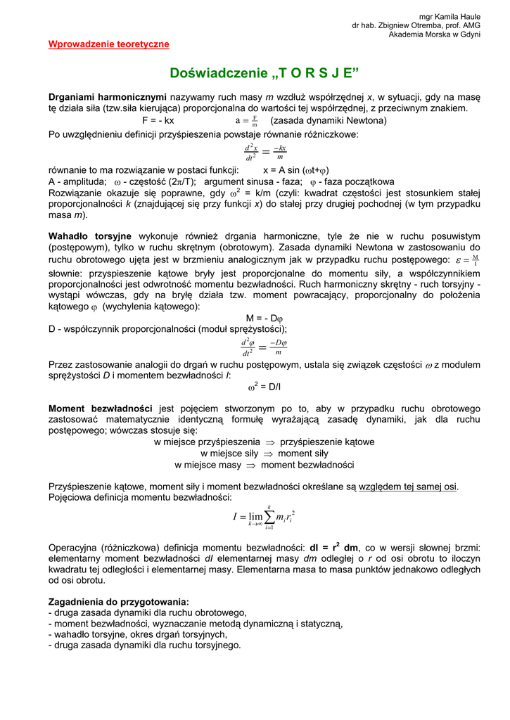 mgr Kamila Haule dr hab. Zbigniew Otremba, prof. AMG Akademia Morska w Gdyni Wprowadzenie teoretyczne Doświadczenie „T O R S J E” Drganiami harmonicznymi nazywamy ruch masy m wzdłuż współrzędnej x, w sytuacji, gdy na masę tę działa siła (tzw.siła kierująca) proporcjonalna do wartości tej współrzędnej, z przeciwnym znakiem. a mF (zasada dynamiki Newtona) F = - kx Po uwzględnieniu definicji przyśpieszenia powstaje równanie różniczkowe: d 2x dt 2 kx m równanie to ma rozwiązanie w postaci funkcji: x = A sin ( t+ ) A - amplituda; - częstość (2 /T); argument sinusa - faza; - faza początkowa Rozwiązanie okazuje się poprawne, gdy 2 = k/m (czyli: kwadrat częstości jest stosunkiem stałej proporcjonalności k (znajdującej się przy funkcji x) do stałej przy drugiej pochodnej (w tym przypadku masa m). Wahadło torsyjne wykonuje również drgania harmoniczne, tyle że nie w ruchu posuwistym (postępowym), tylko w ruchu skrętnym (obrotowym). Zasada dynamiki Newtona w zastosowaniu do M ruchu obrotowego ujęta jest w brzmieniu analogicznym jak w przypadku ruchu postępowego: I słownie: przyspieszenie kątowe bryły jest proporcjonalne do momentu siły, a współczynnikiem proporcjonalności jest odwrotność momentu bezwładności. Ruch harmoniczny skrętny - ruch torsyjny wystąpi wówczas, gdy na bryłę działa tzw. moment powracający, proporcjonalny do położenia kątowego (wychylenia kątowego): M=-D D - współczynnik proporcjonalności (moduł sprężystości); d2 dt 2 D m Przez zastosowanie analogii do drgań w ruchu postępowym, ustala się związek częstości sprężystości D i momentem bezwładności I: 2 = D/I z modułem Moment bezwładności jest pojęciem stworzonym po to, aby w przypadku ruchu obrotowego zastosować matematycznie identyczną formułę wyrażającą zasadę dynamiki, jak dla ruchu postępowego; wówczas stosuje się: w miejsce przyśpieszenia przyśpieszenie kątowe w miejsce siły moment siły w miejsce masy moment bezwładności Przyśpieszenie kątowe, moment siły i moment bezwładności określane są względem tej samej osi. Pojęciowa definicja momentu bezwładności: k I mi ri 2 lim k i 1 Operacyjna (różniczkowa) definicja momentu bezwładności: dI = r2 dm, co w wersji słownej brzmi: elementarny moment bezwładności dI elementarnej masy dm odległej o r od osi obrotu to iloczyn kwadratu tej odległości i elementarnej masy. Elementarna masa to masa punktów jednakowo odległych od osi obrotu. Zagadnienia do przygotowania: - druga zasada dynamiki dla ruchu obrotowego, - moment bezwładności, wyznaczanie metodą dynamiczną i statyczną, - wahadło torsyjne, okres drgań torsyjnych, - druga zasada dynamiki dla ruchu torsyjnego. mgr Kamila Haule dr hab. Zbigniew Otremba, prof. AMG Akademia Morska w Gdyni Szablon metodyczny „T O R S J E” Student 1: Wyznaczanie momentu bezwładności metodą dynamiczną przy pomocy wahadła torsyjnego Student 2: Sprawdzanie zależności okresu drgań wahadła torsyjnego od momentu bezwładności Baza teoretyczna T 2 I D gdzie: I I 0 4md 2 D – moduł sprężystości (związany ze współczynnikiem sprężystości materiału, z jakiego wykonana jest sprężyna i z jej rozmiarami geometrycznymi) I0 – moment bezwładności (z wyłączeniem 4 mas m) samego „krzyżaka” Teoretyczna zależność okresu T drgań wahadła skrętnego od odległości d ciężarków od osi wyraża się następująco: T T2 I 0 4md 2 D 2 4 2 D I0 16 2m 2 d D Zatem, aby wyznaczyć moment bezwładności metodą dynamiczną przy pomocy wahadła torsyjnego należy: Zatem, aby sprawdzić zależność okresu drgań wahadła torsyjnego od momentu bezwładności, należy: - wykonać pomiary zależności okresu wahadła od odległości ciężarków od osi, - sporządzić wykres zależności T2 od d2, - określić liczbowo parametry a-b-c i obliczyć wartość momentu bezwładności Io. - wykonać pomiary zależności okresu wahadła od odległości ciężarków o osi, - sporządzić wykres zależności T2 od d2 - zanalizować jego liniowość. mgr Kamila Haule dr hab. Zbigniew Otremba, prof. AMG Akademia Morska w Gdyni Wskazówki do sprawozdania – wyznaczanie „T O R S J E” Student 1: Wyznaczanie momentu bezwładności metodą dynamiczną przy pomocy wahadła torsyjnego I. Metodyka (ideowy plan ćwiczenia) II. Przebieg ćwiczenia II.1. Przebieg czynności II.2. Szkic układu pomiarowego III. Wyniki III.1. Wyniki pomiarów 1 2 t = 10 T [s] d [m] t = ... d = ... 3 4 5 6 7 8 9 10 m = ... III..2. Obliczenia (przykładowe – odnoszą się np. do pomiaru nr 3) T2 = ... T2 = ... d2 = ... d2 = ... III.3. Wyniki obliczeń 1 T2 [s2] T2 [s2] d2 [m2] [m2] d2 2 3 4 5 6 7 III.4. Wykres (na którym znajdują się wyliczenia) IV. PODSUMOWANIE Wyznaczona wartość momentu bezwładności metodą dynamiczną wynosi ... Dokładność metody: ... Dodatkowe wnioski, spostrzeżenia, przyczyny niepewności pomiarowych, itp 8 9 10 mgr Kamila Haule dr hab. Zbigniew Otremba, prof. AMG Akademia Morska w Gdyni Wskazówki do sprawozdania – sprawdzanie „T O R S J E” Student 2: Sprawdzanie zależności okresu drgań wahadła torsyjnego od momentu bezwładności I. Metodyka (ideowy plan ćwiczenia) II. Przebieg ćwiczenia II.1. Przebieg czynności II.2. Szkic układu pomiarowego III. Wyniki III.1.Wyniki pomiarów 1 2 t = 10 T [s] d [m] t = ... d = ... 3 4 5 6 7 8 9 10 m = ... III..2. Obliczenia (przykładowe – odnoszą się np. do pomiaru nr 3) T2 = ... T2 = ... d2 = ... d2 = ... III.3. Wyniki obliczeń 1 T2 [s2] T2 [s2] d2 [m2] [m2] d2 2 3 4 5 6 7 8 9 10 III.4. Wykres IV. PODSUMOWANIE Ponieważ na wykresie ... można poprowadzić prostą przechodzącą przez wszystkie prostokąty niepewności pomiarowych, nie ma podstaw do stwierdzenia odstępstwa od ... Ewentualnie: Odstępstwo od liniowości w zakresie ... może wynikać z …. Dodatkowe wnioski, spostrzeżenia, przyczyny niepewności pomiarowych.