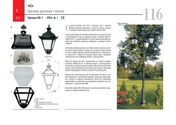 3 Oprawy parkowe i klosze 3.11 Oprawa OS-1 116 IP54, kl. I Czechy, Markvartovice prawa parkowa typu OS-1 wykonana jest z wysokiej jakoÊci tworzyw sztucznych w kolorze czarnym. Oprawa posiada I klas´ izolacji oraz stopieƒ ochrony IP54. O Jest przystosowana do monta˝u bezpoÊrednio na s∏upach typu S z zakoƒczeniem B oraz na uk∏adach ramion i kinkiecie typu KR. Oprawa OS-1 w przeciwieƒstwie do innych opraw parkowych posiada dwa niezale˝ne gniazda do zabudowy na uk∏adach ramion i s∏upach. Konstrukcja oprawy pozwala na monta˝ ramion zarówno do dolnej cz´Êci kosza oprawy (w gór´), jak i do górnej cz´Êci daszka (w dó∏), w efekcie oprawa zawsze ustawiona jest w jednej pozycji. Oprawa OS-1 sk∏ada si´ z korpusu, klosza, p∏yty z osprz´tem elektrycznym oraz ozdobnego daszka z zakoƒczeniem. Oprawa OS-1 375 695 Klosze do opraw typu OS-1 wykonywane sà z dwóch rodzajów materia∏u: PMMA lub PC w kolorach bia∏ym i przezroczystym. W oprawach z kloszem przezroczystym zalecane jest stosowanie rastra ze stali nierdzewnej, który spe∏nia dwie funkcje: kierunkuje Êwiat∏o zapobiegajàc olÊnieniu oraz pe∏ni rol´ dekoracyjnà. Ø60 1. korpus oprawy 2. klosz 3. p∏yta monta˝owa z osprz´tem elektromagnetycznym lub elektronicznym 4. daszek 5. zakoƒczenie Oprawa OS-1 przeznaczona jest do stosowania nie tylko ze słupami stalowymi o zewn´trznej warstwie z tworzywa sztucznego, lecz równie˝ ze słupami aluminiowymi. Mo˝e byç montowana bezpoÊrednio na słupie lub na wysi´gnikach stalowych oraz aluminiowych z zakoƒczeniem Ø60. Dla êródła Êwiatła MH-70W oprawa mo˝e byç opcjonalnie wyposa˝ona w statecznik elektroniczny. Monta˝ na uk∏adzie ramion Krzywa rozsy∏u dla oprawy OS-1 MH-100W klosz przezroczysty z rastrem Krzywa rozsy∏u dla oprawy OS-1 S-70W klosz bia∏y Mocowanie oprawy OS-1 Monta˝ na s∏upie lub uk∏adzie ramion Oprawa OS-1 Kod Typ Oprawy Klosz mleczny Klosz przezroczysty Moc [W] Typ êród∏a Êwiat∏a Ârednica mocowania Waga oprawy brutto [kg] Obj´toÊç jednostkowa [m3] Powierzchnia boczna [m2] PC PMMA PC PMMA OS-1 S-50W 211101 211001 211301 211201 50 sodowe E-27 Ø 60 6,0 0,082 0,15 OS-1 S-70W 211102 211002 211302 211202 70 sodowe E-27 Ø 60 6,3 0,082 0,15 0,15 211307/211320* 211207/211220* 70 metalohalogenkowe E-27 Ø 60 6,3 / 5,1 0,082 OS-1 MH-100W** 211108 - 211308 - 100 metalohalogenkowe E-27 Ø 60 6,3 0,082 0,15 OS-1 MH-150W** 211109 - 211309 - 150 metalohalogenkowe E-27 Ø 60 6,9 0,082 0,15 OS-1 R-80W 211112 211012 211312 211212 80 rt´ciowe E-27 Ø 60 5,8 0,082 0,15 OS-1 MH-70W 211107/211120* 211007/211020* OS-1 R-125W 211113 211013 211313 211213 125 rt´ciowe E-27 Ø 60 6,0 0,082 0,15 OS-1 E/Z 211115 211015 211315 211215 150 ˝arowe i Êwietl. kompaktowe E-27 Ø 60 4,9 0,082 0,15 *Wersja ze statecznikiem elektronicznym **Tylko z kloszami z PC 3 Oprawy parkowe i klosze 3.11 Oprawa OS-1 IP54, kl. I 117