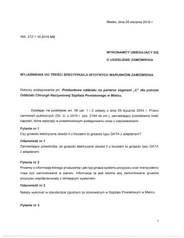 Mielec, dnia 25 sierpnia 2016 r. WA. 272.1.10.2016.MB WYKONAWCY UBIEGAJĄCY SIĘ O UDZIELENIE ZAMÓWIENIA WYJAŚNIENIA DO TREŚCI SPECYFIKACJI ISTOTNYCH WARUNKÓW ZAMÓWIENIA Dotyczy postępowania pn. Przebudowa oddziału na parterze segment „C ” dla potrzeb Oddziału Chirurgii Naczyniowej Szpitala Powiatowego w Mielcu. Działając na podstawie art. 38 ust. 1 i 2 ustawy z dnia 29 stycznia 2004 r. Prawo zamówień publicznych (Dz. U. z 2015 r. poz. 2164 ze zm.), zamawiający przedstawia treść zapytań, które wpłynęły w przedmiotowym postępowaniu wraz z odpowiedziami: Pytanie nr 1 Czy gniazdo elektryczne obwód II z kluczem to gniazdo typu DATA z adapterem? Odpowiedź nr 1 Zamawiający potwierdza, że gniazdo elektryczne obwód II z kluczem to gniazdo typu DATA z adapterem. Pytanie nr 2 Prosimy o informację którego producenta i jaki typ gniazd systemu przyzywu oraz manipulatory maja być zamontowane w panelu. Informacja ta jest istotna aby zamontowane gniazda przyzywu współpracowały z istniejącym systemem. Odpowiedź nr 2 Należy wykonać w standardzie zgodnym ze stosowanym w Szpitalu Powiatowym w Mielcu. Pytanie nr 3 1 Prosimy o informację w jaki sposób maja być zapalane poszczególne oświetlenia w panelach do sal chorych. Odpowiedź nr 3 Włączanie oświetlenia na panelu. Pytanie nr 4 Czy Zamawiający dopuści panele dla intensywnej opieki medycznej z szynami montowanymi do ściany a nie do panelu? Odpowiedź nr 4 Zamawiający dopuści panele z szynami montowanymi do ściany. Pytanie nr 5 W opisie technicznym zostały wskazane i opisane szczegółowo Strefowe Zespoły Kontroli gazów SZKG produkcji Hydro Gaz Med. Prosimy o potwierdzenie, że zamawiający dopuszcza rozwiązania zamienne innych producentów które to spełniają wszystkie wymagania normy PN EN ISO 7396-1 „Systemy Rurociągowe do gazów med. i Próżni: dotyczące funkcjonowania tego typu urządzeń. Odpowiedź nr 5 Zamawiający dopuści inne równorzędne rozwiązanie SZKG. Pytanie nr 6 Czy Zamawiający przewiduje możliwość płatności częściowych zgodnie z przedstawionym do umowy harmonogramem? Jeżeli tak prosimy o korektę zapisów w paragrafie 13. punt 4. Odpowiedź nr 6 Zamawiający dopuszcza możliwość płatności częściowych zgodnie z przedstawionym przez Wykonawcę i zaakceptowanym przez Zamawiającego Harmonogramem rzeczowo- finansowym. Zamawiający dokonuje zmiany postanowień umownych dotyczących płatności wynagrodzenia należnego Wykonawcy - w § 13 wzoru umowy ustępy 4-7 zastępuję się ustępami 4-8 o następującym brzmieniu: „4. Wykonawca zobowiązany jest niezwłocznie po wykonaniu danego etapu robót określonego w Harmonogramie zgłosić gotowość do odbioru częściowego lub końcowego, złożyć protokół odbioru częściowego lub końcowego i uzgodnić z Zamawiającym zakres wykonanych na danym etapie prac. Zamawiający, w razie braku zastrzeżeń, zatwierdzi złożony przez Wykonawcę protokół odbioru. 5. Wynagrodzenie płatne będzie w terminie 30 dni od dnia wpływu do Zamawiającego 2 prawidłowo wystawionej faktury VAT, której podstawą będzie: 1) zaakceptowany pisemnie przez Zamawiającego bezusterkowy protokół odbioru końcowego robót w przypadku ostatniej faktury, 2) zaakceptowany pisemnie przez Zamawiającego bezusterkowy protokół odbioru częściowego robót w przypadku faktur częściowych wynikających z poszczególnych etapów realizacji robót wskazanych w Harmonogramie, 3) w sytuacji realizowania robót przez Wykonawcę przy udziale Podwykonawcy, oświadczenie Podwykonawcy, lub dalszego Podwykonawcy o uregulowaniu względem nich wszystkich należności przez Wykonawcę lub dowody dotyczące zapłaty wynagrodzenia za poprzedni etap robót. Oświadczenia, podpisane przez osoby upoważnione do reprezentowania składających je Podwykonawców lub dalszych Podwykonawców lub inne dowody na potwierdzenie dokonanej zapłaty wynagrodzenia powinny potwierdzać brak zaległości Wykonawcy, Podwykonawcy lub dalszego Podwykonawcy w uregulowaniu wszystkich wymagalnych w tym okresie wynagrodzeń Podwykonawców lub dalszych Podwykonawców wynikających z Umów o podwykonawstwo. 6 .Datą zapłaty wynagrodzenia jest dzień wydania polecenia przelewu bankowego. 7. Wynagrodzenie płatne będzie na rachunek bankowy Wykonawcy wskazany na fakturze. 8. Zamawiający ma prawo do dokonywana potrąceń wszelkich wierzytelności, jakie przysługują mu z tytułu wykonania niniejszej Umowy, wobec Wykonawcy z wynagrodzenia Wykonawcy, o ile nie sprzeciwia się temu obowiązujące prawo”. 3