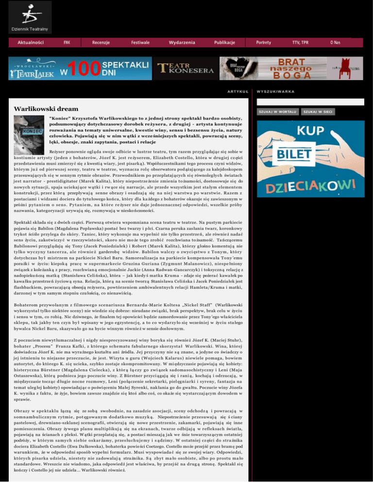 ARTYKU Ł Warlikowski dream "Koniec" Krzysztofa Warlikowskiego to z jednej strony spektakl bardzo osobisty, podsumowujący dotychczasowy dorobek re żysera, z drugiej - artysta kontynuuje rozważania na tematy uniwersalne, kwestie winy, sensu i bezsensu życia, natury człowieka. Pojawiaj ą się w nim w ątki z wcze śniejszych spektakli, powracaj ą sceny, lęki, obsesje, znaki zapytania, postaci i relacje Reżyser ponownie ogl ąda swoje odbicie w lustrze teatru, tym razem przygl ądając si ę sobie w kostiumie artysty (jeden z bohaterów, Józef K. jest re żyserem, Elizabeth Costello, która w drugiej cz ęści przedstawienia musi zmierzy ć się z kwesti ą wiary, jest pisark ą). Współuczestnikami tego procesu czyni widzów, którym ju ż od pierwszej sceny, teatru w teatrze, wyznacza rol ę obserwatora pod ążaj ącego za kalejdoskopem przesuwaj ących si ę w sennym rytmie obrazów. Przewodnikiem po przeplataj ących si ę równoleg łych światach jest narrator - prestidigitator (Marek Kalita), który niepostrze żenie zmienia to żsamości, dostosowuje si ę do nowych sytuacji, spaja uciekaj ące w ątki i rw ące si ę narracje, ale przede wszystkim jest sta łym elementem konstrukcji, przez któr ą przepływaj ą senne obrazy i osadzaj ą się na niej warstwa po warstwie. Razem z postaciami i widzami dociera do tytu łowego końca, który dla ka żdego z bohaterów okazuje si ę zawieszonym w próżn i p y t a n i e m o s e n s . P y t a n i e m , n a k t ó r e r e żyser nie daje jednoznacznej odpowiedzi, wszelkie próby nazwania, kategoryzacji urywaj ą się, rozmywaj ą w niesko ńczoności. Spektakl sk łada si ę z dwóch cz ęści. Pierwsz ą otwiera wspomniana scena teatru w teatrze. Na pustym parkiecie pojawia si ę Babilon (Magdalena Pop ławska) posta ć bez twarzy i p łci. Czarna peruka zas łania twarz, koronkowy trykot ściśle przylega do skóry. Taniec, który wykonuje ma wype łnić nie tylko przestrze ń, ale równie ż nada ć sens życiu, zakotwiczy ć w rzeczywisto ści, skoro nie mo że tego zrobi ć rozchwiana to żsamość. Ta ńczącemu Babilonowi przygl ądają się Tony (Jacek Poniedzia łek) i Robert (Marek Kalita), którzy g łośno komentuj ą nie t ylko wy czy n y t a nc e r za , ale r ó wni e ż garderob ę widzów. Babilon walczy o zwyci ęst wo z To ny m, który dotychczas by ł mistrzem na parkiecie Nickel Baru. Samorealizacja na parkiecie kompensowa ła Tony ’emu porażk i w życiu: kiepsk ą prac ę w supermarkecie Gruzina Guriana (Zygmunt Malanowicz), niespe łniony związek z koleżank ą z pracy, rozchwian ą emocjonalnie Jackie (Anna Radwan -Gancarczyk) i toksyczn ą relacj ę z nadopieku ńczą matk ą (Stanis ława Celi ńska), która – jak kiedy ś matka Kruma - zdaje si ę pożera ć kawa łek po kawa łku przestrze ń ż yciow ą syna. Relacja, któr ą na scenie tworz ą Stanis ława Celi ńska i Jacek Poniedzia łek jest flashbackiem, powracaj ącą obsesją reżysera, powtórzeniem ambiwalentnych relacji Hamleta/Kruma i matki, darzonej w tym samym stopniu czu łością, co nienawi ścią. Bohaterom przywo łanym z filmowego scenariusza Bernarda -Marie Koltesa „Nickel Staff” (Warlikowski wykorzysta ł tylko niektóre sceny) nie wiedzie si ę dobrze: nieudane zwi ązki, brak perspektyw, brak celu w życiu i sensu w tym, co robi ą. Nic dziwnego, że fina łem tej opowie ści b ędzie zamordowanie przez Tony ’ego właściciela sklepu, tak jakby ten czyn by ł wpisany w jego egzystencj ę, a to co wydarzy ło si ę wcześniej w życiu sta łego bywalca Nickel Baru, skazywa ło go na bycie winnym równie ż w sensie dosłownym. Z poczuciem niewyt łumaczalnej i nigdy niesprecyzowanej winy boryka si ę równie ż Józef K. (Maciej Stuhr), bohater „Procesu” Franza Kafki, z którego schematu fabularnego skorzysta ł Warlikowski. Wina, której doświadcza Józef K. nie ma wyra źnego kszta łtu ani źródła. Jej przyczyny nie s ą znane, a jedyne co świadczy o jej istnieniu to niejasne przeczucie, że jest. Wizyta u guru (Wojciech Kalarus) niewiele pomaga, bowiem autorytet, do którego K. si ę ucieka, szybko zostaje skompromitowany. W mi ędzyczasie pojawiaj ą się kobiety: histeryczna Bürstner (Magdalena Cielecka), z któr ą ł ą c z y g o z w i ązek sadomasochistyczny i Leni (Maja Ostaszewska), któr ą podnieca jego poczucie winy. Z Bürstner przyci ągaj ą się i rani ą, kochaj ą i odrzucaj ą, w mi ędzyczasie tocz ąc d ługie nocne rozmowy, Leni (po łą czenie sekretarki, piel ęgniarki i syreny, fantazja na temat uleg łej kobiety) opowiadaj ąc o poświ ęceniu Ma łej Syrenki, nak łania go do gwa łtu. Poczucie winy Józefa K. wynika z faktu, że żyje, bowiem zawsze znajdzie si ę ktoś albo co ś, co okaże się wystarczaj ącym dowodem w sprawie. O b r a z y w s p e k t a k l u łą czą się ze sob ą swobodnie, na zasadzie asocjacji, sceny odchodz ą i powracaj ą w s o m n a m b u l i c z n y m r y t m i e , p o t ęgowanym dodatkowo muzyk ą. Niepostrzeżenie przesuwaj ą się ś ciany pastelowej, drewniano -szklanej scenografii, otwieraj ą się nowe przestrzenie, zakamarki, pojawiaj ą się inne pomieszczenia. Obrazy żywego planu multiplikuj ą się na ekranach, twarze odbijaj ą w refleksach świat ła, pojawiaj ą na ścianach z pleksi. W ątki przeplataj ą się, a postaci mieszaj ą jak we śnie towarzysz ącym ostatniej podróży, w którym samych siebie oskar żamy, przes łu c h u j e m y i s ądzimy. W ostatniej cz ęści do stra żnika dociera Elizabeth Costello (Ewa Da łkowska), bohaterka powie ści Coetzego. Costello mo że przejść przez bram ę pod warunkiem, że w odpowiedni sposób wype łni formularz. Musi wyspowiada ć się ze swojej wiary. Odpowiedzi, których pisarka udziela, niestety nie zadowalaj ą stra żnika. S ą zbyt ma ło osobiste, albo po prostu ma ło standardowe. Wreszcie nie wiadomo, jaka odpowied ź jest w łaściwa, by przej ść na drug ą stron 