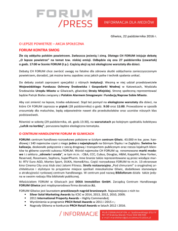 Gliwice, 22 października 2016 r. O LEPSZE POWIETRZE – AKCJA SPOŁECZNA FORUM KONTRA SMOG Źle się oddycha polskim powietrzem. Zwłaszcza jesienią i zimą. Dlatego CH FORUM inicjuje debatę „O lepsze powietrze” na temat tzw. niskiej emisji. Odbędzie się ona 27 października (czwartek) o godz. 17:00 w Scenie FORUM (I p.). Częścią akcji są też ekologiczne warsztaty dla dzieci. Debatą CH FORUM chce zwrócić uwagę na fatalne dla zdrowia skutki oddychania zanieczyszczonym powietrzem, doradzić, jak można temu zapobiec oraz jakich paliw i technik spalania unikać. Do debaty zostali zaproszeni specjaliści z różnych instytucji. Wezmą w niej udział przedstawiciele Wojewódzkiego Funduszu Ochrony Środowiska i Gospodarki Wodnej w Katowicach, Wydziału Środowiska Urzędu Miasta w Gliwicach, gliwickiej Straży Miejskiej. Stronę społeczną reprezentować będzie Patryk Białas związany z Polskim Alarmem Smogowym i Fundacją Napraw Sobie Miasto. Aby coś zmienić na lepsze, trzeba edukować. Stąd też pomysł na ekologiczne warsztaty dla dzieci, na które CH FORUM zaprasza w piątek (28 października) o godz. 9:30 oraz 11:00. Prowadzone w sposób zrozumiały dla maluchów, będą odpowiednie nawet dla przedszkolaków oraz uczniów niższych klas podstawówek. Również w sobotę (29 października, ok. godz.13:30), na warsztatach po kolejnym spektaklu kolektywu „Lufcik na korbkę”, poruszana będzie ekologiczna tematyka. O CENTRUM HANDLOWYM FORUM W GLIWICACH FORUM: centrum handlowo-rozrywkowe położone w ścisłym centrum Gliwic. 43.000 m kw. pow. handlowej i 140 najemców czyni z niego jedno z największych na Górnym Śląsku i w Zagłębiu. Świetna lokalizacja, doskonałe połączenie z siecią drogową i transportem publicznym oraz rzesza lojalnych klientów to główne czynniki sukcesu FORUM. Wśród najemców CH FORUM są renomowane marki modowe i z sektora „zdrowie i uroda”, w tym m.in. : C&A, CCC, Cubus, Douglas, H&M, KappAhl, New Yorker, Reserved, Rossmann, Sephora, SuperPharm. Inne branże także reprezentowane są przez wiodące marki: RTV Euro AGD, Martes Sport, DUKA, Home&You. Część rozrywkowa FORUM to m.in. 13-ekranowe kino Cinema City oraz klub sieci Jatomi Fitness. Strefa restauracyjna „Pod chmurami” o oryginalnej architekturze i stylistyce to przyjemne miejsce spotkań mieszkańców Gliwic, dodatkowo stanowiące o atrakcyjności rynkowej centrum handlowego. W centrum pod nazwą Biblioforum działa także jedyna w swoim rodzaju filia biblioteki publicznej. Właścicielem FORUM w Gliwicach jest DEKA Immobilien GmbH. Zarządcą Centrum Handlowego FORUM Gliwice jest międzynarodowa firma doradcza JLL. FORUM Gliwice jest laureatem prestiżowych nagród branżowych. Najważniejsze z nich to: Silver Solal Marketing Awards by ICSC w 2014, 2013, 2012, 2010, 2009; 2011 International Property Awards – Highly Commended; Wyróżnienia w programie PRCH Retail Awards w 2011 i 2015 r.; Nagrody Główna w konkursie PRCH Retail Awards w latach 2012 i 2016.