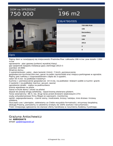 DOM na SPRZEDAŻ 750 000 Łoś 196 m2 336/4790/ODS 750 000 PLN 196 Secondary 1364 196 2012 2 4 Opis Piękny dom w rozwijającej się miejscowości Prażmów.Pow. całkowita 196 m.kw. pow dzialki- 1364 m.kw ogrzewanie - piec gazowy Junkers( wysokiej klasy) gaz (pojemnik Gaspolu-instalacja gazu ziemnego 2013 r) szambo( 10.000) Wnętrze domu; 3 sypialnie(duże) ,salon , dwie łazienki (14m2, 7,5m2), pomieszczenie gospodarcze+kuchnia(14m.kw), garaż na jeden samochódd oraz miejsca parkingowe w ogrodzie. Piękny piec kaflowy z rozprowadzeniem ciepla do 3 sypialni, salon 55 m.kw- na podłodze trawertyn kuchnia + pomieszczenie gospodarcze -14 m.kw, na podlodze i blatach szafek w kuchni -granit. 2 Łazienki ( na podłodze marmur, jacuzzi, sauna) ogrodzenie działki - siatka na podmurówce brama wjazdowa na pilota . Garaż w bryle domu ( drzwi na pilota) dojazd do posesji drogą asfaltową - wjazd bramą otwierana pilotem. Taras wewnętrzny- 48 m. kw, drugi taras przed drzwiami wejściowymi 27m szyby antywłamaniowe firmy Megal ze szprosami, monitoring ogród- zagospodarowany - czarne sosny, modrzewie, brzozy, katalpa, inne drzewa i krzewy ozdobne. Oszczędź czas i pieniądze, załatwiamy za Ciebie wszystkie formalności, otrzymasz bezpłatną obsługę Prawną, pomożemy w udzieleniu kredytu do 100% wartości nieruchomości. Treść niniejszego ogłoszenia nie stanowi oferty handlowej w rozumieniu Kodeksu Cywilnego. Grażyna Antochewicz tel. 606930475 email: [email protected] A.Drągowski Sp. z o.o. Powered by TCPDF (www.tcpdf.org)