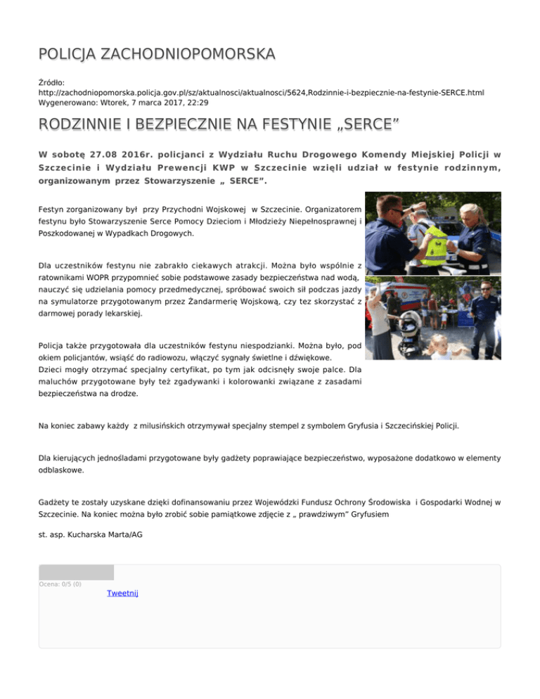 POLICJA ZACHODNIOPOMORSKA Źródło: http://zachodniopomorska.policja.gov.pl/sz/aktualnosci/aktualnosci/5624,Rodzinnie-i-bezpiecznie-na-festynie-SERCE.html Wygenerowano: Wtorek, 7 marca 2017, 22:29 RODZINNIE I BEZPIECZNIE NA FESTYNIE „SERCE” W sobotę 27.08 2016r. policjanci z Wydziału Ruchu Drogowego Komendy Miejskiej Policji w Szczecinie i Wydziału Prewencji KWP w Szczecinie wzięli udział w festynie rodzinnym, organizowanym przez Stowarzyszenie „ SERCE”. Festyn zorganizowany był przy Przychodni Wojskowej w Szczecinie. Organizatorem festynu było Stowarzyszenie Serce Pomocy Dzieciom i Młodzieży Niepełnosprawnej i Poszkodowanej w Wypadkach Drogowych. Dla uczestników festynu nie zabrakło ciekawych atrakcji. Można było wspólnie z ratownikami WOPR przypomnieć sobie podstawowe zasady bezpieczeństwa nad wodą, nauczyć się udzielania pomocy przedmedycznej, spróbować swoich sił podczas jazdy na symulatorze przygotowanym przez Żandarmerię Wojskową, czy tez skorzystać z darmowej porady lekarskiej. Policja także przygotowała dla uczestników festynu niespodzianki. Można było, pod okiem policjantów, wsiąść do radiowozu, włączyć sygnały świetlne i dźwiękowe. Dzieci mogły otrzymać specjalny certyfikat, po tym jak odcisnęły swoje palce. Dla maluchów przygotowane były też zgadywanki i kolorowanki związane z zasadami bezpieczeństwa na drodze. Na koniec zabawy każdy z milusińskich otrzymywał specjalny stempel z symbolem Gryfusia i Szczecińskiej Policji. Dla kierujących jednośladami przygotowane były gadżety poprawiające bezpieczeństwo, wyposażone dodatkowo w elementy odblaskowe. Gadżety te zostały uzyskane dzięki dofinansowaniu przez Wojewódzki Fundusz Ochrony Środowiska i Gospodarki Wodnej w Szczecinie. Na koniec można było zrobić sobie pamiątkowe zdjęcie z „ prawdziwym” Gryfusiem st. asp. Kucharska Marta/AG Ocena: 0/5 (0) Tweetnij