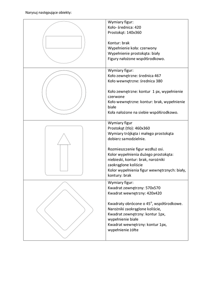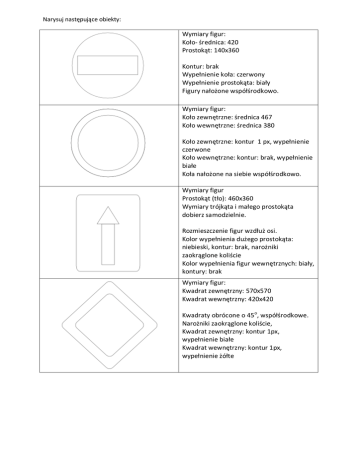 Narysuj następujące obiekty: Wymiary figur: Koło- średnica: 420 Prostokąt: 140x360 Kontur: brak Wypełnienie koła: czerwony Wypełnienie prostokąta: biały Figury nałożone współśrodkowo. Wymiary figur: Koło zewnętrzne: średnica 467 Koło wewnętrzne: średnica 380 Koło zewnętrzne: kontur 1 px, wypełnienie czerwone Koło wewnętrzne: kontur: brak, wypełnienie białe Koła nałożone na siebie współśrodkowo. Wymiary figur Prostokąt (tło): 460x360 Wymiary trójkąta i małego prostokąta dobierz samodzielnie. Rozmieszczenie figur wzdłuż osi. Kolor wypełnienia dużego prostokąta: niebieski, kontur: brak, narożniki zaokrąglone koliście Kolor wypełnienia figur wewnętrznych: biały, kontury: brak Wymiary figur: Kwadrat zewnętrzny: 570x570 Kwadrat wewnętrzny: 420x420 Kwadraty obrócone o 45o, współśrodkowe. Narożniki zaokrąglone koliście, Kwadrat zewnętrzny: kontur 1px, wypełnienie białe Kwadrat wewnętrzny: kontur 1px, wypełnienie żółte Narysuj następujące obiekty: Wymiary figur dobierz samodzielnie. Kontur: brak Wypełnienie kół (od góry): czerwony, żółty, zielony Wypełnienie trójkąta dużego: czerwony Wypełnienie trójkąta małego: żółty Trójkąty nałożone współśrodkowo. Wszystkie figury (koła i trójkąty) wyrównane wzdłuż jednej osi. Koła dodatkowo rozmieszczone równomiernie na osi Y. Wymiary figur: Ośmiokąt zewnętrzny: średnica 510 Ośmiokąt wewnętrzny: średnica 440 Ośmiokąt zewnętrzny: kontur 1 px, wypełnienie białe Ośmiokąt wewnętrzny: kontur: brak, wypełnienie czerwone Tekst: czcionka Sans, rozmiar 150, kolor biały Ośmiokąty nałożone na siebie współśrodkowo. Narysuj następujące flagi korzystając z rysunków i podpisów pod nimi: Flaga Szwajcarii Źródło: http://pl.wikipedia.org/wiki/Plik:Flag_of_Switzerland_at_Sea.png B=320 Kolor krzyża: biały Kolor tła: czerwony Flaga Unii Europejskiej Źródło: http://publications.europa.eu Krótsza krawędź prostokąta =360. Dwanaście złotych gwiazd rozmieszczonych jest w równych odstępach na niewidzialnym okręgu, którego środek znajduje się w punkcie przecięcia przekątnych prostokąta. Promień okręgu wynosi jedną trzecią wysokości flagi. Każda gwiazda ma pięć ramion, których końce tworzą niewidzialny okrąg o promieniu równym jednej osiemnastej wysokości flagi. Wszystkie gwiazdy ustawione są w pozycji pionowej – oznacza to, że jedno ramię skierowane jest pionowo do góry, a dwa leżą na poziomej linii prostopadłej do drzewca flagi. Gwiazdy rozmieszczone są na okręgu tak jak godziny na tarczy zegara. Podpowiedź: Aby wykonać równomierne rozmieszczenie gwiazd na fladze, narysuj 12ramienną gwiazdę. Obróć ją w taki sposób, aby ramiona wskazywały godziny na tarczy zegara. Przykład: