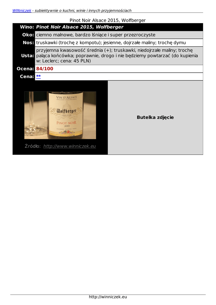 WINniczek - subiektywnie o kuchni, winie i innych przyjemnościach Pinot Noir Alsace 2015, Wolfberger Wino: Pinot Noir Alsace 2015, Wolfberger Oko: ciemno malnowe, bardzo lśniące i super przezroczyste Nos: truskawki (trochę z kompotu); jesienne, dojrzałe maliny; trochę dymu przyjemna kwasowość średnia (+); truskawki, niedojrzałe maliny; trochę Usta: paląca końcówka; poprawnie, drogo i nie będziemy powtarzać (do kupienia w: Leclerc; cena: 45 PLN) Ocena: 84/100 Cena: ** Butelka zdjęcie Źródło: http://www.winniczek.eu http://winniczek.eu