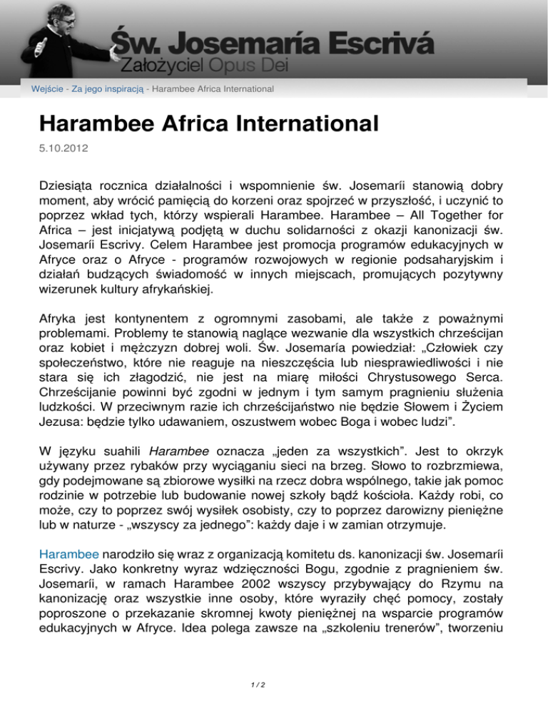 Wejście - Za jego inspiracją - Harambee Africa International Harambee Africa International 5.10.2012 Dziesiąta rocznica działalności i wspomnienie św. Josemaríi stanowią dobry moment, aby wrócić pamięcią do korzeni oraz spojrzeć w przyszłość, i uczynić to poprzez wkład tych, którzy wspierali Harambee. Harambee – All Together for Africa – jest inicjatywą podjętą w duchu solidarności z okazji kanonizacji św. Josemaríi Escrivy. Celem Harambee jest promocja programów edukacyjnych w Afryce oraz o Afryce - programów rozwojowych w regionie podsaharyjskim i działań budzących świadomość w innych miejscach, promujących pozytywny wizerunek kultury afrykańskiej. Afryka jest kontynentem z ogromnymi zasobami, ale także z poważnymi problemami. Problemy te stanowią naglące wezwanie dla wszystkich chrześcijan oraz kobiet i mężczyzn dobrej woli. Św. Josemaría powiedział: „Człowiek czy społeczeństwo, które nie reaguje na nieszczęścia lub niesprawiedliwości i nie stara się ich złagodzić, nie jest na miarę miłości Chrystusowego Serca. Chrześcijanie powinni być zgodni w jednym i tym samym pragnieniu służenia ludzkości. W przeciwnym razie ich chrześcijaństwo nie będzie Słowem i Życiem Jezusa: będzie tylko udawaniem, oszustwem wobec Boga i wobec ludzi”. W języku suahili Harambee oznacza „jeden za wszystkich”. Jest to okrzyk używany przez rybaków przy wyciąganiu sieci na brzeg. Słowo to rozbrzmiewa, gdy podejmowane są zbiorowe wysiłki na rzecz dobra wspólnego, takie jak pomoc rodzinie w potrzebie lub budowanie nowej szkoły bądź kościoła. Każdy robi, co może, czy to poprzez swój wysiłek osobisty, czy to poprzez darowizny pieniężne lub w naturze - „wszyscy za jednego”: każdy daje i w zamian otrzymuje. Harambee narodziło się wraz z organizacją komitetu ds. kanonizacji św. Josemaríi Escrivy. Jako konkretny wyraz wdzięczności Bogu, zgodnie z pragnieniem św. Josemaríi, w ramach Harambee 2002 wszyscy przybywający do Rzymu na kanonizację oraz wszystkie inne osoby, które wyraziły chęć pomocy, zostały poproszone o przekazanie skromnej kwoty pieniężnej na wsparcie programów edukacyjnych w Afryce. Idea polega zawsze na „szkoleniu trenerów”, tworzeniu 1/2 „koła sukcesu”, które będzie stopniowo rozszerzać się obejmując każdą dziedzinę społeczeństwa. Edukacja otwiera drogę do pracy, niezależności oraz postępu materialnego i duchowego. Prawdziwym wyzwaniem dla Afryki jest stworzenie takich możliwości, aby Afrykanie mogli sami zaprojektować i wprowadzić postęp, rozwijając ich własny potencjał. Od 2002 roku Harambee zapuściło korzenie i wyrosło w nowych miejscach. Od powstania udzieliło wsparcia 30 projektom w 18 krajach Afryki Podsaharyjskiej. Główna praca realizowana przez organizację pozarządową Harambee Africa International (HAI) polega na zapewnianiu finansowania dla projektów edukacyjnych w regionie Afryki Podsaharyjskiej, które zostały założone i są prowadzone przez Afrykanów. Ponadto HAI jest sponsorem nagrody w dziedzinie komunikacji międzynarodowej (International Communications prize) za reportaże telewizyjne i filmy dokumentalne o Afryce. HAI prowadzi także inne projekty formacyjne i komunikacyjne, których celem jest propagowanie wyważonego wizerunku Afryki, przełamującego stereotypy. Są to, na przykład, sympozja lub debaty, uroczystości Dnia Harambee, a także zestawy ćwiczeń dla szkół. HAI prowadzi również działalność w zakresie pozyskiwania środków poprzez organizowanie imprez budujących świadomość w szkołach państwowych i publicznych, takich jak koncerty lub przedstawienia itp., przygotowywanie prezentacji dla potencjalnych darczyńców, lunche robocze z osobami wykonującymi różne zawody, apele do banków i przedsiębiorców oraz prezentowanie projektów współpracy organizacjom krajowym i międzynarodowym. Więcej na: www.harambee-africa.org 2/2 Powered by TCPDF (www.tcpdf.org)