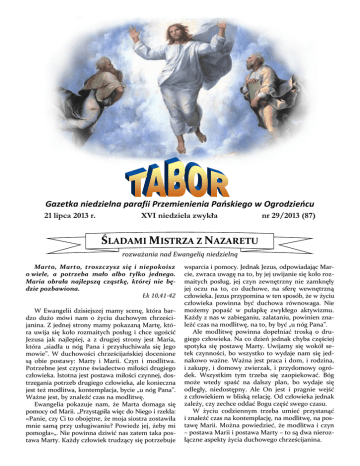 Gazetka niedzielna parafii Przemienienia Pańskiego w Ogrodzieńcu 21 lipca 2013 r. XVI niedziela zwykła nr 29/2013 (87) ŚLADAMI MISTRZA Z NAZARETU rozważania nad Ewangelią niedzielną Marto, Marto, troszczysz się i niepokoisz o wiele, a potrzeba mało albo tylko jednego. Maria obrała najlepszą cząstkę, której nie będzie pozbawiona. Łk 10,41-42 W Ewangelii dzisiejszej mamy scenę, która bardzo dużo mówi nam o życiu duchowym chrześcijanina. Z jednej strony mamy pokazaną Martę, która uwija się koło rozmaitych posług i chce ugościć Jezusa jak najlepiej, a z drugiej strony jest Maria, która „siadła u nóg Pana i przysłuchiwała się Jego mowie”. W duchowości chrześcijańskiej docenione są obie postawy: Marty i Marii. Czyn i modlitwa. Potrzebne jest czynne świadectwo miłości drugiego człowieka. Istotna jest postawa miłości czynnej, dostrzegania potrzeb drugiego człowieka, ale konieczna jest też modlitwa, kontemplacja, bycie „u nóg Pana”. Ważne jest, by znaleźć czas na modlitwę. Ewangelia pokazuje nam, że Marta domaga się pomocy od Marii. „Przystąpiła więc do Niego i rzekła: «Panie, czy Ci to obojętne, że moja siostra zostawiła mnie samą przy usługiwaniu? Powiedz jej, żeby mi pomogła»„. Nie powinna dziwić nas zatem taka postawa Marty. Każdy człowiek trudzący się potrzebuje wsparcia i pomocy. Jednak Jezus, odpowiadając Marcie, zwraca uwagę na to, by jej uwijanie się koło rozmaitych posług, jej czyn zewnętrzny nie zamknęły jej oczu na to, co duchowe, na sferę wewnętrzną człowieka. Jezus przypomina w ten sposób, że w życiu człowieka powinna być duchowa równowaga. Nie możemy popaść w pułapkę zwykłego aktywizmu. Każdy z nas w zabieganiu, zalataniu, powinien znaleźć czas na modlitwę, na to, by być „u nóg Pana”. Ale modlitwę powinna dopełniać troską o drugiego człowieka. Na co dzień jednak chyba częściej spotyka się postawę Marty. Uwijamy się wokół setek czynności, bo wszystko to wydaje nam się jednakowo ważne. Ważna jest praca i dom, i rodzina, i zakupy, i domowy zwierzak, i przydomowy ogródek. Wszystkim tym trzeba się zaopiekować. Bóg może wtedy spaść na dalszy plan, bo wydaje się odległy, niedostępny. Ale On jest i pragnie wejść z człowiekiem w bliską relację. Od człowieka jednak zależy, czy zechce oddać Bogu część swego czasu. W życiu codziennym trzeba umieć przystanąć i znaleźć czas na kontemplację, na modlitwę, na postawę Marii. Można powiedzieć, że modlitwa i czyn – postawa Marii i postawa Marty – to są dwa nierozłączne aspekty życia duchowego chrześcijanina. I co dalej? – sprawa księdza Lemańskiego Aż się nie chce, ale… Co zrobić. Nie sposób dziś uciec w komentarzu od sprawy księdza Lemańskiego. ANDRZEJ MACURA redaktor portalu wiara.pl Chciałbym uchodzić za mędrca, który widzi sprawę najszerzej jak tylko można, który rozważa różne racje, który jest za, a nawet przeciw, ale w tej konkretnej sprawie nie potrafię. Choć z zasady nie lubię się zajmować sprawami w stylu kto co o kim powiedział (zostało mi widać po rozstrzyganiu sporów na naszym czacie). Tej nie znam oczywiście specjalnie dobrze. Nie byłem przy rozmowach arcybiskupa Hosera i innych księży z księdzem Lemańskim, nie czytałem korespondencji między nimi, nie widziałem twarzy rozmówców, nic nie wiem na temat ewentualnych gestów. Ale czytam i oglądam. Wnioski nasuwają się same. Jakie są fakty? Te najistotniejsze? Ano faktem jest, że ks. Lemański kwestionuje nauczanie Kościoła w kwestiach bioetycznych. Bo nie tylko stara się o większą delikatność wobec osób poczętych metodą in vitro czy rodziców, który na ten krok się zdecydowali. Kwestionuje zasadę. Dobrze że ordynariusz warszawsko-praski zareagował. Drugi fakt to jakaś alergia ks.Lemańskiego na arcybiskupa Hosera. Nieprzyjemnych wypowiedzi proboszcza z Jasienicy na jego temat było całkiem sporo. W jednej z nich ks. Lemański posunął się nawet do sugestii, że otrzymał od niego propozycję seksualną. Można kogoś nie lubić, ale bez przesady. To już było przekroczenie granic przyzwoitości w niechęci. Faktem też jest, że czy tego ksiądz Lemański tego chce czy nie, ta jego niechęć wpisuje się w nagonkę na arcybiskupa Hosera, z jaką mamy do czynienia od pewnego czasu. Chodzi nie tylko o krytykę jego stanowiska w kwestii in vitro, ale o oskarżenia tak niedorzeczne, jak obarczanie go odpowiedzialnością za ludobójstwo w Rwandzie (przypomnijmy, w tym czasie nie było go w tym kraju). No i ostatnie, w moim odczuciu najistotniejsze. Ksiądz wciągnął w ten swój spór z biskupem swoją parafię. To najgorsze co mógł zrobić. Bo co będzie z nimi dalej? Bunt będzie trwał? Jak długo? Jak odnajdą się, kiedy w parafii będzie już nowy duszpasterz? Czy już na zawsze ks. Lemański będzie w sercach części parafian jedynym zasługującym na to, by być ich proboszczem? Jest mi smutno. Oglądałem w telewizji przyjęcie, jakie przedstawicielom arcybiskupa (kanclerzowi, dziekanowi i nowemu administratorowi) przygotował w parafii ks. Lemański. Wszystko obliczone było na upokorzenie tych kapłanów. Myślę, że proboszcz z Jasienicy w swoim konflikcie z arcybiskupem strasznie się pogubił. W takich sytuacjach, nawet jeśli się jest przekonanym co do swoich racji, trzeba po prostu wziąć krzyż. I wierzyć, że to cierpienie przyniesie dobre owoce… Przynajmniej tyle w tym dobrego, że ta sprawa wszystkim o tym przypomina… PS. Już po opublikowaniu tego komentarza ks. Lemański powiadomił swoich parafian i opinię publiczną, że postanowił się podporządkować decyzji arcybiskupa Hosera i opuści parafię. Bogu niech będą dzięki. Przyznaję, w moich oczach wiele przez to zyskał. Ks. Wojciech Lemański na swoim blogu poinformował parafian, że postanowił podporządkować się decyzji abp. Henryka Hosera i opuścić par