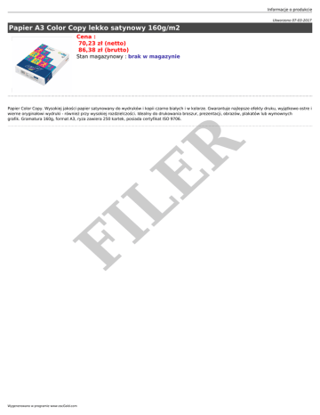 Informacje o produkcie Utworzono 07-03-2017 Papier A3 Color Copy lekko satynowy 160g/m2 Cena : 70,23 zł (netto) 86,38 zł (brutto) Stan magazynowy : brak w magazynie FI LE R Papier Color Copy. Wysokiej jakości papier satynowany do wydruków i kopii czarno białych i w kolorze. Gwarantuje najlepsze efekty druku, wyjątkowo ostre i wierne oryginałowi wydruki - również przy wysokiej rozdzielczości. Idealny do drukowania broszur, prezentacji, obrazów, plakatów lub wymownych grafik. Gramatura 160g, format A3, ryza zawiera 250 kartek, posiada certyfikat ISO 9706. Wygenerowano w programie www.oscGold.com