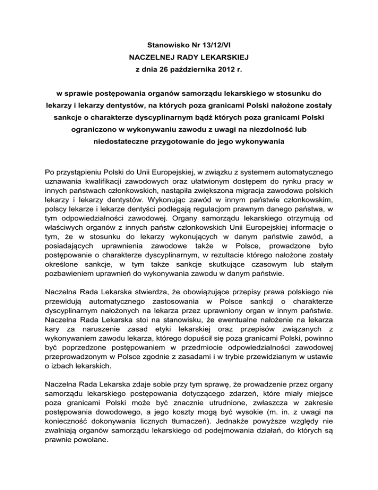 Stanowisko Nr 13/12/VI NACZELNEJ RADY LEKARSKIEJ z dnia 26 października 2012 r. w sprawie postępowania organów samorządu lekarskiego w stosunku do lekarzy i lekarzy dentystów, na których poza granicami Polski nałożone zostały sankcje o charakterze dyscyplinarnym bądź których poza granicami Polski ograniczono w wykonywaniu zawodu z uwagi na niezdolność lub niedostateczne przygotowanie do jego wykonywania Po przystąpieniu Polski do Unii Europejskiej, w związku z systemem automatycznego uznawania kwalifikacji zawodowych oraz ułatwionym dostępem do rynku pracy w innych państwach członkowskich, nastąpiła zwiększona migracja zawodowa polskich lekarzy i lekarzy dentystów. Wykonując zawód w innym państwie członkowskim, polscy lekarze i lekarze dentyści podlegają regulacjom prawnym danego państwa, w tym odpowiedzialności zawodowej. Organy samorządu lekarskiego otrzymują od właściwych organów z innych państw członkowskich Unii Europejskiej informacje o tym, że w stosunku do lekarzy wykonujących w danym państwie zawód, a posiadających uprawnienia zawodowe także w Polsce, prowadzone było postępowanie o charakterze dyscyplinarnym, w rezultacie którego nałożone zostały określone sankcje, w tym także sankcje skutkujące czasowym lub stałym pozbawieniem uprawnień do wykonywania zawodu w danym państwie. Naczelna Rada Lekarska stwierdza, że obowiązujące przepisy prawa polskiego nie przewidują automatycznego zastosowania w Polsce sankcji o charakterze dyscyplinarnym nałożonych na lekarza przez uprawniony organ w innym państwie. Naczelna Rada Lekarska stoi na stanowisku, że ewentualne nałożenie na lekarza kary za naruszenie zasad etyki lekarskiej oraz przepisów związanych z wykonywaniem zawodu lekarza, którego dopuścił się poza granicami Polski, powinno być poprzedzone postępowaniem w przedmiocie odpowiedzialności zawodowej przeprowadzonym w Polsce zgodnie z zasadami i w trybie przewidzianym w ustawie o izbach lekarskich. Naczelna Rada Lekarska zdaje sobie przy tym sprawę, że prowadzenie przez organy samorządu lekarskiego postępowania dotyczącego zdarzeń, które miały miejsce poza granicami Polski może być znacznie utrudnione, zwłaszcza w zakresie postępowania dowodowego, a jego koszty mogą być wysokie (m. in. z uwagi na konieczność dokonywania licznych tłumaczeń). Jednakże powyższe względy nie zwalniają organów samorządu lekarskiego od podejmowania działań, do których są prawnie powołane. Naczelna Rada Lekarska zauważa jednocześnie, że w każdym tego rodzaju przypadku należy dokonać uprzedniej analizy w celu stwierdzenia, jakie postępowanie należałoby w danej sprawie podjąć. Informacja przekazana przez właściwy organ w innym państwie o pozbawieniu w tym państwie lekarza uprawnień do wykonywania zawodu lub nałożeniu ograniczeń w wykonywaniu zawodu może być bowiem w określonych sytuacjach traktowana jako informacja wskazująca na możliwość popełnienia przewinienia zawodowego, o której mowa w art. 67 ustawy o izbach lekarskich, bądź też jako informacja wskazująca na uzasadnione podejrzenie niedostatecznego przygotowania zawodowego lekarza albo jego niezdolności do wykonywania zawodu ze względu na stan zdrowia, tj. sytuacje, o których mowa w art. 11 i 12 ustawy o zawodach lekarza i lekarza dentysty. Naczelna Rada Lekarska podkreśla przy tym, że konieczne jest jak najszybsze odpowiednie, jednoznaczne uregulowanie w przepisach prawa polskiego zasad i sposobu postępowania w tego rodzaju przypadkach. Jest to dodatkowo podyktowane prowadzonymi w Unii Europejskiej pracami legislacyjnych nad nowelizacją dyrektywy 2005/36/WE, w ramach których prawdopodobnie ustanowiony zostanie tzw. mechanizm ostrzegawczy (alert mechanism), oznaczający, że państwa członkowskie Unii Europejskiej będą zobowiązane wzajemnie się informować o każdym przypadku zawieszenia lub pozbawienia uprawnienia do wykonywania zawodu lekarza lub lekarza dentysty. Przyjęte w Polsce regulacje prawne powinny we właściwy sposób uwzględniać zadania samorządu lekarskiego związane ze sprawowaniem pieczy nad należytym i sumiennym wykonywaniem zawodu lekarza, prawa przysługujące lekarzom i lekarzom dentystom oraz celowość i ekonomikę tego rodzaju postępowania. 2