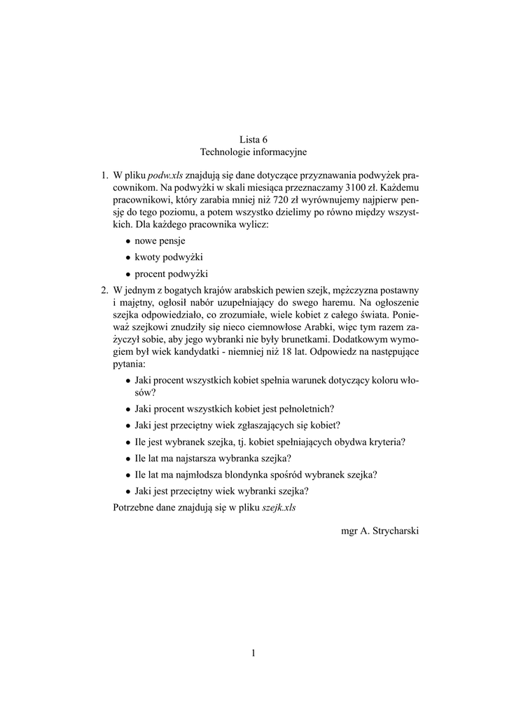Lista 6 Technologie informacyjne 1. W pliku podw.xls znajduja˛ si˛e dane dotyczace ˛ przyznawania podwyżek pracownikom. Na podwyżki w skali miesiaca ˛ przeznaczamy 3100 zł. Każdemu pracownikowi, który zarabia mniej niż 720 zł wyrównujemy najpierw pensj˛e do tego poziomu, a potem wszystko dzielimy po równo mi˛edzy wszystkich. Dla każdego pracownika wylicz: • nowe pensje • kwoty podwyżki • procent podwyżki 2. W jednym z bogatych krajów arabskich pewien szejk, m˛eżczyzna postawny i maj˛etny, ogłosił nabór uzupełniajacy ˛ do swego haremu. Na ogłoszenie szejka odpowiedziało, co zrozumiałe, wiele kobiet z całego świata. Ponieważ szejkowi znudziły si˛e nieco ciemnowłose Arabki, wi˛ec tym razem zażyczył sobie, aby jego wybranki nie były brunetkami. Dodatkowym wymogiem był wiek kandydatki - niemniej niż 18 lat. Odpowiedz na nast˛epujace ˛ pytania: • Jaki procent wszystkich kobiet spełnia warunek dotyczacy ˛ koloru włosów? • Jaki procent wszystkich kobiet jest pełnoletnich? • Jaki jest przeci˛etny wiek zgłaszajacych ˛ si˛e kobiet? • Ile jest wybranek szejka, tj. kobiet spełniajacych ˛ obydwa kryteria? • Ile lat ma najstarsza wybranka szejka? • Ile lat ma najmłodsza blondynka spośród wybranek szejka? • Jaki jest przeci˛etny wiek wybranki szejka? Potrzebne dane znajduja˛ si˛e w pliku szejk.xls mgr A. Strycharski 1