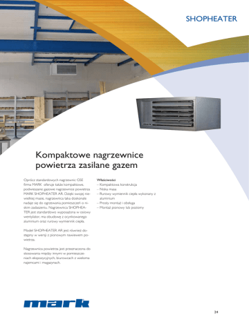 SHOPHEATER Kompaktowe nagrzewnice powietrza zasilane gazem Oprócz standardowych nagrzewnic GSE firma MARK oferuje także kompaktowe, podwieszane gazowe nagrzewnice powietrza MARK SHOPHEATER AR. Dzięki swojej niewielkiej masie, nagrzewnica taka doskonale nadaje się do ogrzewania pomieszczeń o niskim zadaszeniu. Nagrzewnica SHOPHEATER jest standardowo wyposażona w osiowy wentylator, ma obudowę z ocynkowanego aluminium oraz rurowy wymiennik ciepła. Właściwości – Kompaktowa konstrukcja – Niska masa – Rurowy wymiennik ciepła wykonany z aluminium – Prosty montaż i obsługa – Montaż pionowy lub poziomy Model SHOPHEATER AR jest również dostępny w wersji z pionowym nawiewem powietrza. Nagrzewnica powietrza jest przeznaczona do stosowania między innymi w pomieszczeniach ekspozycyjnych, biurowcach z wieloma najemcami i magazynach. 24 Wymiary Typ AR 1.1 G H P F R N E øQ øQ K J 4 x M8 Typ AR 2.1 t/m 5.1 G H P 4 x M8 L 77 M C øQ øQ 95 E S F N R 4 x M8 B Przyłącze gazu ½’’ Typ AR 1.1H AR 2.1H AR 3.1H AR 4.1H AR 5.1H A 805 800 820 820 820 B 878 1130 1130 1139 1139 C 356 460 460 510 569 D 677 677 677 677 677 E 250 380 380 430 490 F 53 40 40 40 40 G 80 100 100 65 100 H 450 677 677 709 677 J 235 235 235 235 235 K 250 250 250 250 250 L 305 325 325 335 335 M 535 765 765 765 765 N 200 185 185 197 229 P 200 213 213 223 229 ØQ 80-120 2x80 2x80 2x80 2x100 R 110 50 50 75 200 S 0 120 120 120 140 Wymiary urządzenia z pionowym nawiewem powietrza są takie same, jak modelu z nawiewem poziomym. 25 Dane techniczne Typ Moc nominalna kW AR 1.1H AR 2.1H AR 3.1H AR 4.1H AR 5.1H 14,2 20 27 34 39 Obciążenie nominalne kW 13,1 18,4 24,8 31,3 35,9 Zużycie gazu GZ50 m3/h 1,5 2,12 2,86 3,6 4,13 Zużycie gazu G31 kg/h 1,11 1,56 2,11 2,66 4,23 Sprawność % >91 >91 >91 >91 >91 Przepływ powietrza (15°C) m3/h 1350 1450 2050 2900 3925 Przepływ powietrza (50°C) m3/h 1500 1650 2300 3250 4400 Zasięg wyrzutu powietrza m 12 12 16 23 25 Napięcie zasilające (50 Hz) V 1~230 1~230 1~230 1~230 1~230 Moc elektryczna W 290 300 310 320 450 Waga urządzenia kg 57 82 90 100 105 Poziom hałasu (w odległości 5 metrów) dB(A) 45 43 44 50 48 Akcesoria — systemy odprowadzenia spalin 1 2 3 4 1 2 3 4 5 5 6 7 8 6 7 8 9 Zestaw rur prostych Kolano 90˚ Kolano 45˚ System odprowadzenia spalin – monokombi ścienne System odprowadzenia spalin – monokombi dachowe Przepust dla dachów pochyłych Przepust dachowy Przepust elastyczny Adaptor koncentryczny dla jednorurowego systemu odprowadzenia spalin C32 C12 9 Akcesoria — sekcje dodatkowe Nagrzewnice powietrza - 26 Automatyka Wyłącznik serwisowy Termostat pomieszczeniowy 30 02 732 Termostat z zegarem 30 02 733 lub Wyłącznik serwisowy Termostat pomieszczeniowy 30 02 732 Wyłącznik serwisowy Wyłącznik serwisowy Termostat z zegarem 30 02 733 lub 27