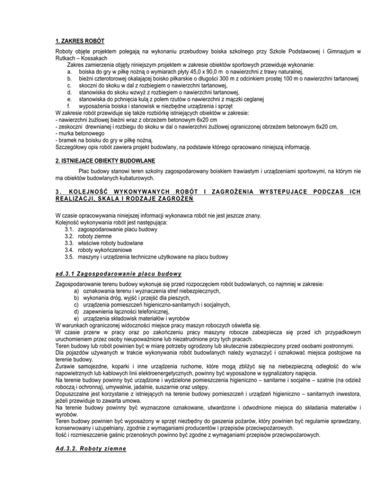 1. ZAKRES ROBÓT Roboty objęte projektem polegają na wykonaniu przebudowy boiska szkolnego przy Szkole Podstawowej i Gimnazjum w Rutkach – Kossakach Zakres zamierzenia objęty niniejszym projektem w zakresie obiektów sportowych przewiduje wykonanie: a. boiska do gry w piłkę nożną o wymiarach płyty 45,0 x 90,0 m o nawierzchni z trawy naturalnej, b. bieżni czterotorowej okalającej boisko piłkarskie o długości 300 m z odcinkiem prostej 100 m o nawierzchni tartanowej c. skoczni do skoku w dal z rozbiegiem o nawierzchni tartanowej, d. stanowiska do skoku wzwyż z rozbiegiem o nawierzchni tartanowej, e. stanowiska do pchnięcia kulą z polem rzutów o nawierzchni z mączki ceglanej f. wyposażenia boiska i stanowisk w niezbędne urządzenia i sprzęt W zakresie robót przewiduje się także rozbiórkę istniejących obiektów w zakresie: - nawierzchni żużlowej bieżni wraz z obrzeżem betonowym 6x20 cm - zeskoczni drewnianej i rozbiegu do skoku w dal o nawierzchni żużlowej ograniczonej obrzeżem betonowym 6x20 cm, - murka betonowego - bramek na boisku do gry w piłkę nożną. Szczegółowy opis robót zawiera projekt budowlany, na podstawie którego opracowano niniejszą informację. 2. ISTNIEJĄCE OBIEKTY BUDOWLANE Plac budowy stanowi teren szkolny zagospodarowany boiskiem trawiastym i urządzeniami sportowymi, na którym nie ma obiektów budowlanych kubaturowych. 3 . K O L E JNO ŚĆ W Y KON Y WAN YC H ROBÓT I Z AG RO ŻEN IA WY ST EP U JĄC E POD CZ A S I CH R EA LIZ AC JI, SK ALA I RODZ AJE ZAGRO ŻE Ń W czasie opracowywania niniejszej informacji wykonawca robót nie jest jeszcze znany. Kolejność wykonywania robót jest następująca: 3.1. zagospodarowanie placu budowy 3.2. roboty ziemne 3.3. właściwe roboty budowlane 3.4. roboty wykończeniowe 3.5. maszyny i urządzenia techniczne użytkowane na placu budowy ad .3.1 Z agospod arowanie p l acu budow y Zagospodarowanie terenu budowy wykonuje się przed rozpoczęciem robót budowlanych, co najmniej w zakresie: a) oznakowania terenu i wyznaczenia stref niebezpiecznych, b) wykonania dróg, wyjść i przejść dla pieszych, c) urządzenia pomieszczeń higieniczno-sanitarnych i socjalnych, d) zapewnienia łączności telefonicznej, e) urządzenia składowisk materiałów i wyrobów W warunkach ograniczonej widoczności miejsce pracy maszyn roboczych oświetla się. W czasie przerw w pracy oraz po zakończeniu pracy maszyny robocze zabezpiecza się przed ich przypadkowym uruchomieniem przez osoby nieupoważnione lub niezatrudnione przy tych pracach. Teren budowy lub robót powinien być w miarę potrzeby ogrodzony lub skutecznie zabezpieczony przed osobami postronnymi. Dla pojazdów używanych w trakcie wykonywania robót budowlanych należy wyznaczyć i oznakować miejsca postojowe na terenie budowy. Żurawie samojezdne, koparki i inne urządzenia ruchome, które mogą zbliżyć się na niebezpieczną odległość do w/w napowietrznych lub kablowych linii elektroenergetycznych, powinny być wyposażone w sygnalizatory napięcia. Na terenie budowy powinny być urządzone i wydzielone pomieszczenia higieniczno – sanitarne i socjalne – szatnie (na odzież roboczą i ochronną), umywalnie, jadalnie, suszarnie oraz ustępy. Dopuszczalne jest korzystanie z istniejących na terenie budowy pomieszczeń i urządzeń higieniczno – sanitarnych inwestora, jeżeli przewiduje to zawarta umowa. Na terenie budowy powinny być wyznaczone oznakowane, utwardzone i odwodnione miejsca do składania materiałów i wyrobów. Teren budowy powinien być wyposażony w sprzęt niezbędny do gaszenia pożarów, który powinien być regularnie sprawdzany, konserwowany i uzupełniany, zgodnie z wymaganiami producentów i przepisów przeciwpożarowych. Ilość i rozmieszczenie gaśnic przenośnych powinno być zgodne z wymaganiami przepisów przeciwpożarowych. Ad .3.2. Robot y ziemn e Zagrożenia występujące przy wykonywaniu robót ziemnych: upadek pracownika lub osoby postronnej do wykopu (brak wygrodzenia wykopu balustradami; brak przykrycia wykopu), zasypanie pracownika w wykopie wąskoprzestrzennym (brak zabezpieczenia ścian wykopu przed obsunięciem się; obciążenie klina naturalnego odłamu gruntu urobkiem pochodzącym z wykopu), potrącenie pracownika lub osoby postronnej łyżką koparki przy wykonywaniu robót na placu budowy lub w miejscu dostępnym dla osób postronnych (brak wygrodzenia strefy niebezpiecznej). Roboty ziemne powinny być prowadzone na podstawie projektu określającego położenie instalacji i urządzeń podziemnych, mogących znaleźć się w zasięgu prowadzonych robót. Wykonywanie robót ziemnych w bezpośrednim sąsiedztwie sieci powinno być poprzedzone określeniem przez kierownika budowy bezpiecznej odległości w jakiej mogą być one wykonywane od istniejącej sieci i sposobu wykonywania tych robót. W czasie wykonywania robót ziemnych miejsca niebezpieczne należy ogrodzić i umieścić napisy ostrzegawcze. W czasie wykonywania wykopów w miejscach dostępnych dla osób niezatrudnionych przy tych robotach, należy wokół wykopów pozostawionych na czas zmroku i w nocy ustawić balustrady zaopatrzone w światło ostrzegawcze koloru czerwonego. Podcinanie lub wycinanie drzew rosnących w pobliżu napowietrznych linii energetycznych, wiatrołomów, drzew spróchniałych, rosnących na stromych skarpach i na terenie zabudowanym wykonuje się pod nadzorem i przez co najmniej dwóch pracowników. Ad .3.3. i 3.4. Robo ty budow lane i robot y wyko ń c ze n iow e Zagrożenia występujące przy wykonywaniu robót budowlanych: - pochwycenie kończyn przez napęd maszyn (brak pełnej osłony napędu), - potrącenie pracownika lub osoby postronnej łyżką koparki przy wykonywaniu robót na placu budowy lub w miejscu dostępnym dla osób postronnych (brak wygrodzenia strefy niebezpiecznej), - potrącenie pracownika przez pojazdy przy dopuszczeniu ruchu - porażenie prądem elektrycznym Przy wykonywaniu robót 