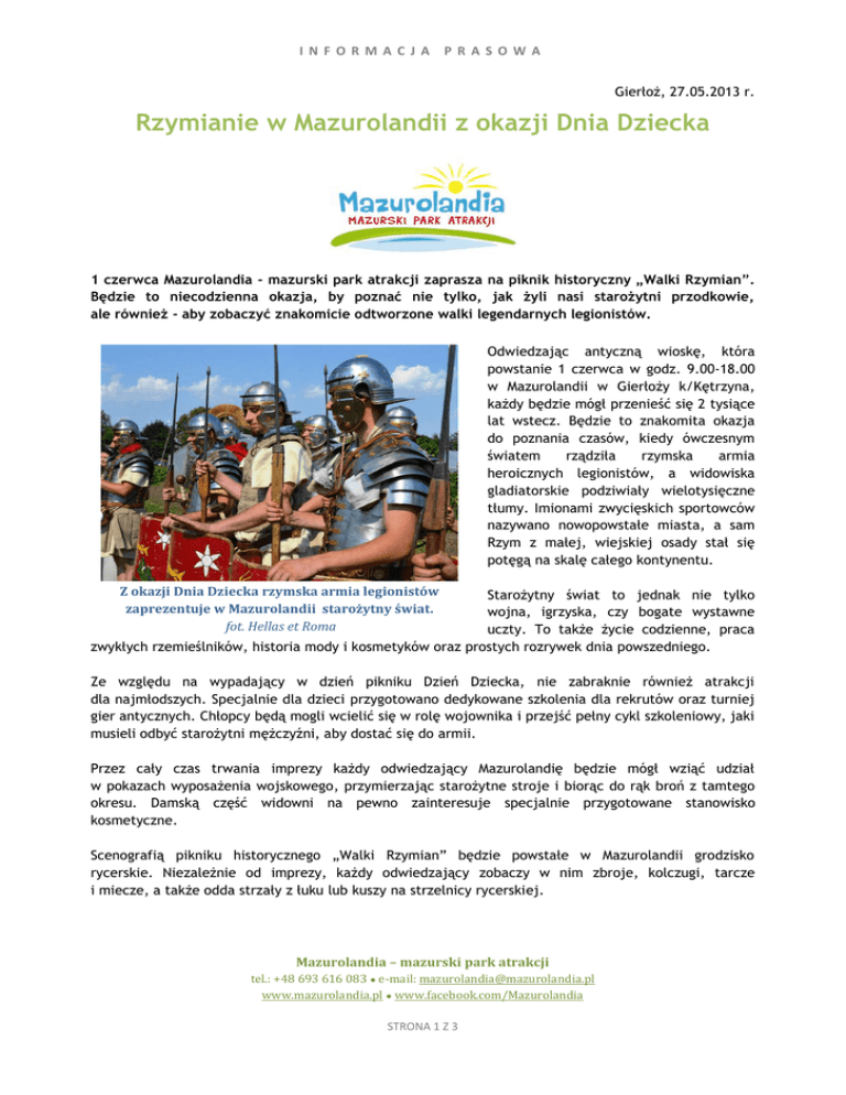 IN F OR M A C J A P R A SO W A Gierłoż, 27.05.2013 r. Rzymianie w Mazurolandii z okazji Dnia Dziecka 1 czerwca Mazurolandia - mazurski park atrakcji zaprasza na piknik historyczny „Walki Rzymian”. Będzie to niecodzienna okazja, by poznać nie tylko, jak żyli nasi starożytni przodkowie, ale również - aby zobaczyć znakomicie odtworzone walki legendarnych legionistów. Odwiedzając antyczną wioskę, która powstanie 1 czerwca w godz. 9.00-18.00 w Mazurolandii w Gierłoży k/Kętrzyna, każdy będzie mógł przenieść się 2 tysiące lat wstecz. Będzie to znakomita okazja do poznania czasów, kiedy ówczesnym światem rządziła rzymska armia heroicznych legionistów, a widowiska gladiatorskie podziwiały wielotysięczne tłumy. Imionami zwycięskich sportowców nazywano nowopowstałe miasta, a sam Rzym z małej, wiejskiej osady stał się potęgą na skalę całego kontynentu. Z okazji Dnia Dziecka rzymska armia legionistów zaprezentuje w Mazurolandii starożytny świat. fot. Hellas et Roma Starożytny świat to jednak nie tylko wojna, igrzyska, czy bogate wystawne uczty. To także życie codzienne, praca zwykłych rzemieślników, historia mody i kosmetyków oraz prostych rozrywek dnia powszedniego. Ze względu na wypadający w dzień pikniku Dzień Dziecka, nie zabraknie również atrakcji dla najmłodszych. Specjalnie dla dzieci przygotowano dedykowane szkolenia dla rekrutów oraz turniej gier antycznych. Chłopcy będą mogli wcielić się w rolę wojownika i przejść pełny cykl szkoleniowy, jaki musieli odbyć starożytni mężczyźni, aby dostać się do armii. Przez cały czas trwania imprezy każdy odwiedzający Mazurolandię będzie mógł wziąć udział w pokazach wyposażenia wojskowego, przymierzając starożytne stroje i biorąc do rąk broń z tamtego okresu. Damską część widowni na pewno zainteresuje specjalnie przygotowane stanowisko kosmetyczne. Scenografią pikniku historycznego „Walki Rzymian” będzie powstałe w Mazurolandii grodzisko rycerskie. Niezależnie od imprezy, każdy odwiedzający zobaczy w nim zbroje, kolczugi, tarcze i miecze, a także odda strzały z łuku lub kuszy na strzelnicy rycerskiej. Mazurolandia – mazurski park atrakcji tel.: +48 693 616 083 ● e-mail: [email protected] www.mazurolandia.pl ● www.facebook.com/Mazurolandia STRONA 1 Z 3 IN F OR M A C J A P R A SO W A Przez cały czas trwania pikniku w godz. 9:00-18:00 będą dostępne następujące stanowiska rzemieślnicze: - obóz wojskowy - stanowisko kosmetyczne - stanowisko wyposażenia wojskowego - szkoła dla rekrutów - turnieje gier antycznych Ponadto w cyklach cogodzinnych odbywać się będą następujące pokazy: - godz. 12.00, 14.00, 16.00: - pokazy musztry legionów rzymskich - pokaz walki legionistów rzymskich - szkolenie rekrutów (zabawa dla dzieci) - pokaz uzbrojenia i wyposażenia Mazurolandia – mazurski park atrakcji otwarty jest codziennie w godzinach 9:00-18:00. Fot.Cena biletów wstępu: 20 zł - normalny, 18 zł - ulgowy, 16 zł - grupowy (od 30 os.), 55 zł - rodzinny 2+1, 70 zł - rodzinny 2+2. www.mazurolandia.pl; www.facebook.com/Mazurolandia Kontakt prasowy: Anna Tadra tel.: +48 693 616 083 e-mail: [email protected] fot. Mazurolandia, Hellas et Roma Mazurolandia – mazurski park atrakcji tel.: +48 693 616 083 ● e-mail: [email protected] www.mazurolandia.pl ● www.facebook.com/Mazurolandia STRONA 2 Z 3 IN F OR M A C J A P R A SO W A Zapraszamy do Mazurolandii w Gierłoży przy drodze Kętrzyn-Węgorzewo, 1 km za Wilczym Szańcem! LOKALIZACJA ODLEGŁOŚCI Kętrzyn – 10 km Ryn – 30 km Giżycko – 35 km Mrągowo – 37 km Mikołajki – 47 km Ełk – 91 km Olsztyn – 97 km Suwałki – 129 km Elbląg – 165 km Białystok – 198 km Gdańsk – 223 km Warszawa – 256 km Bydgoszcz – 308 km Kaliningrad – 122 km Wilno – 354 km CENNIK Bilety - Promocja urodzinowa 2013! Normalny - 26 zł 20 zł Ulgowy (uczniowie, studenci) - 24 zł 18 zł Grupowy (od 30 osób) - 22 zł 16 zł Rodzinny (2 dorosłych + 1 dziecko) - 73 zł 55 zł Rodzinny (2 dorosłych + 2 dzieci) - 95 zł 70 zł Dzieci do lat 2 - bezpłatnie Przewodnicy Język polski (godz./grupa) - 70 zł Język obcy (godz./grupa) - 80 zł Posiłek wojskowy Ognisko z własnym prowiantem (od 20 osób) - 3 zł/os. Ognisko z kiełbaską i dodatkami (od 20 osób) - 8 zł/os. Grochówka - 8 zł/os. Parking Rower - bezpłatnie Samochód osobowy, motocykl - 2 zł Bus - 5 zł Autokar - 20 zł GODZINY OTWARCIA od 27 kwietnia do 28 czerwca – codziennie 9.00-18.00 od 29 czerwca do 1 września – codziennie 9.00-20.00 od 2 września do 30 września – codziennie 9.00-18.00 od 1 października do 31 grudnia – codziennie 9.00 do zmroku Mazurolandia – mazurski park atrakcji tel.: +48 693 616 083 ● e-mail: [email protected] www.mazurolandia.pl ● www.facebook.com/Mazurolandia STRONA 3 Z 3