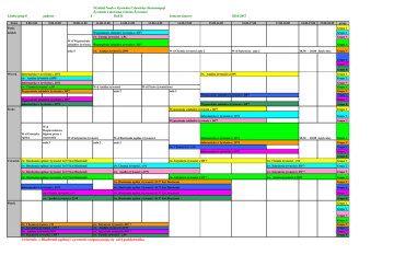 Liczba grup 8 Dzień 8.00-9.00 Wydział Nauk o Żywieniu Człowieka i Konsumpcji Żywienie Człowieka i Ocena Żywności 4 Rok II audytor 9.00-10.00 10.00-11.00 11.00-12.00 12.00-13.00 Semestr zimowy 13.00-14.00 2016/2017 14.00-15.00 15.00-16.00 16.00-17.00 17.00-18.00 18.00-19.00 19.00-20.00 Ponie- grupy Grupa 1 działek Wyposażenie zakładów żywienia s. HP7 Grupa 2 ćw. Chemia żywności . s.94 Grupa 3 W-d Wyposażenie zakładów żywienia Wyposażenie zakładów żywienia s. HP7 aula 4 Grupa 4 ćw. Analiza żywności s.2099 W-d Chemia żywności aula 2 W-d Statystyka aula 2 18,30 - 20,00 Język obcy Grupa 5 Grupa 6 Grupa 7 Grupa 8 Wtorek Informatyka w żywieniu s. 2072 ćw. Analiza żywności s.2099 ćw. Analiza żywności s.2199 Informatyka w żywieniu s. 2072 ćw. Chemia żywności . s.94 W-d Analiza żywności Wyposażenie zakładów żywienia s. HP7 Grupa 1 Grupa 2 Grupa 3 Grupa 4 W-d Prawo żywnościowe aula 2 aula 2 Grupa 5 Grupa 6 Wyposażenie zakładów żywienia s. HP7 Wyposażenie zakładów żywienia s. HP7 Grupa 7 Informatyka w żywieniu s. 2072 Wyposażenie zakładów żywienia s. HP7 Środa Grupa 8 Wyposażenie zakładów żywienia s. HP7 Grupa 1 Informatyka w żywieniu s. 2072 Grupa 2 Wyposażenie zakładów żywienia s. HP7 W-d Genetyka ogólna W-d Bezpieczeństwo, higiena pracy i ergonomia W-d Inżynieria żywności aula 2 aula 2 W-d Biochemia ogólna i żywności Informatyka w żywieniu s. 2072 aula 2 Informatyka w żywieniu s. 2072 Grupa 3 18,30 - 20,00 Język obcy Grupa 4 Grupa 5 ćw. Chemia żyw. s.94 Grupa 6 Informatyka w żywieniu s. 2072 Grupa 7 Grupa 8 Czwartek ćw. Biochemia ogólna i żywności bl 37 Kat Biochemii ćw. Inżynieria żywności s HP 7 ćw. Chemia żywności . s.94 Grupa 1 ćw. Biochemia ogólna i żywności bl 37 Kat Biochemii ćw. Chemia żywności . s.94 ćw. Inżynieria żywności s HP 7 Grupa 2 ćw. Biochemia ogólna i żywności bl 37 Kat Biochemii ćw. Analiza żywności s.2199 ćw. Inżynieria żywności s HP 7 Grupa 3 ćw. Analiza żywności s.2099 Grupa 4 ćw. Biochemia ogólna i żywności bl 37 Kat Biochemii ćw. Inżynieria żywności s HP 7 ćw. Biochemia ogólna i żywności bl 37 Kat Biochemii Grupa 5 ćw. Biochemia ogólna i żywności bl 37 Kat Biochemii Grupa 6 ćw. Chemia żywności. s.94 ćw. Biochemia ogólna i żywności bl 37 Kat Biochemii Grupa 7 ćw. Analiza żywności s.2199 ćw. Biochemia ogólna i żywności bl 37 Kat Biochemii Grupa 8 Informatyka w żywieniu s. 2072 Piątek Grupa 1 Grupa 2 Grupa 3 ćw. Chemia żywności. s.94 ćw. Inżynieria żywności s HP 7 ćw. Analiza żywnościs.2199 ćw. Inżynieria żywności s HP 7 ćw. Inżynieria żywności s HP 7 ćw. Analiza żywności s.2199 ćw. Inżynieria żywności s HP 7 ćw. Chemia żywności . s.94 ćwiczenia z Biochemii ogółnej i żywności rozpoczynają się od 6 października Grupa 4 Grupa 5 Grupa 6 Grupa 7 Grupa 8