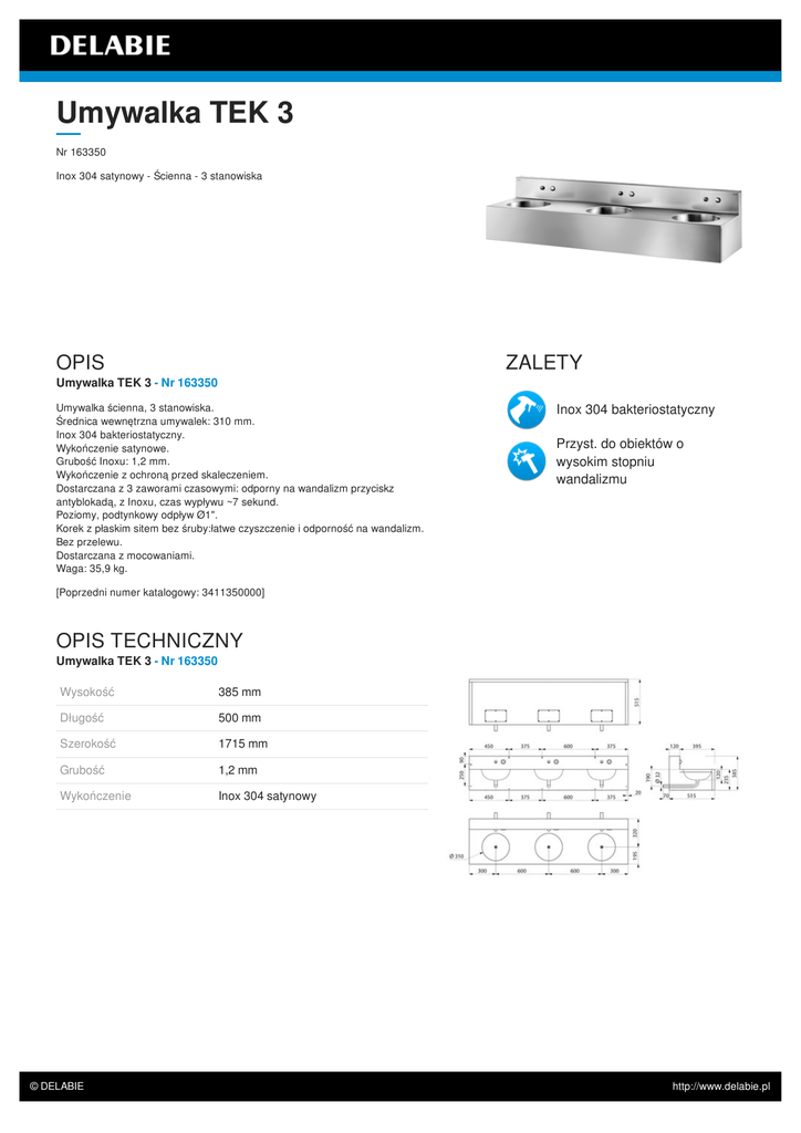 Umywalka TEK 3 Nr 163350 Inox 304 satynowy - Ścienna - 3 stanowiska OPIS ZALETY Umywalka TEK 3 - Nr 163350 Umywalka ścienna, 3 stanowiska. Średnica wewnętrzna umywalek: 310 mm. Inox 304 bakteriostatyczny. Wykończenie satynowe. Grubość Inoxu: 1,2 mm. Wykończenie z ochroną przed skaleczeniem. Dostarczana z 3 zaworami czasowymi: odporny na wandalizm przyciskz antyblokadą, z Inoxu, czas wypływu ~7 sekund. Poziomy, podtynkowy odpływ Ø1". Korek z płaskim sitem bez śruby:łatwe czyszczenie i odporność na wandalizm. Bez przelewu. Dostarczana z mocowaniami. Waga: 35,9 kg. Inox 304 bakteriostatyczny Przyst. do obiektów o wysokim stopniu wandalizmu [Poprzedni numer katalogowy: 3411350000] OPIS TECHNICZNY Umywalka TEK 3 - Nr 163350 Wysokość 385 mm Długość 500 mm Szerokość 1715 mm Grubość 1,2 mm Wykończenie Inox 304 satynowy © DELABIE http://www.delabie.pl