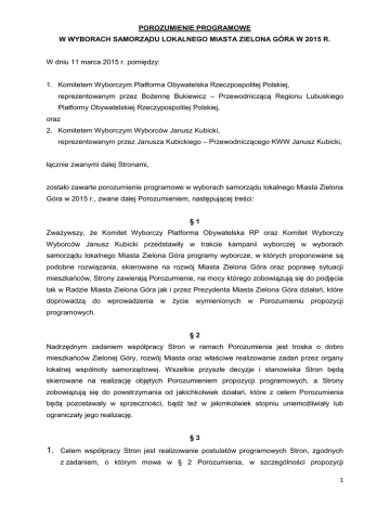 POROZUMIENIE PROGRAMOWE W WYBORACH SAMORZĄDU LOKALNEGO MIASTA ZIELONA GÓRA W 2015 R. W dniu 11 marca 2015 r. pomiędzy: 1. Komitetem Wyborczym Platforma Obywatelska Rzeczpospolitej Polskiej, reprezentowanym przez Bożennę Bukiewicz – Przewodniczącą Regionu Lubuskiego Platformy Obywatelskiej Rzeczypospolitej Polskiej, oraz 2. Komitetem Wyborczym Wyborców Janusz Kubicki, reprezentowanym przez Janusza Kubickiego – Przewodniczącego KWW Janusz Kubicki, łącznie zwanymi dalej Stronami, zostało zawarte porozumienie programowe w wyborach samorządu lokalnego Miasta Zielona Góra w 2015 r., zwane dalej Porozumieniem, następującej treści: §1 Zważywszy, że Komitet Wyborczy Platforma Obywatelska RP oraz Komitet Wyborczy Wyborców Janusz Kubicki przedstawiły w trakcie kampanii wyborczej w wyborach samorządu lokalnego Miasta Zielona Góra programy wyborcze, w których proponowane są podobne rozwiązania, skierowane na rozwój Miasta Zielona Góra oraz poprawę sytuacji mieszkańców, Strony zawierają Porozumienie, na mocy którego zobowiązują się do podjęcia tak w Radzie Miasta Zielona Góra jak i przez Prezydenta Miasta Zielona Góra działań, które doprowadzą do wprowadzenia w życie wymienionych w Porozumieniu propozycji programowych. §2 Nadrzędnym zadaniem współpracy Stron w ramach Porozumienia jest troska o dobro mieszkańców Zielonej Góry, rozwój Miasta oraz właściwe realizowanie zadań przez organy lokalnej wspólnoty samorządowej. Wszelkie przyszłe decyzje i stanowiska Stron będą skierowane na realizację objętych Porozumieniem propozycji programowych, a Strony zobowiązują się do powstrzymania od jakichkolwiek działań, które z celem Porozumienia będą pozostawały w sprzeczności, bądź też w jakimkolwiek stopniu uniemożliwiały lub ograniczały jego realizację. §3 1. Celem współpracy Stron jest realizowanie postulatów programowych Stron, zgodnych z zadaniem, o którym mowa w § 2 Porozumienia, w szczególności propozycji 1 i postulatów przedstawionych w programach wyborczych Komitetu Wyborczego Platforma Obywatelska RP i Komitetu Wyborczego Wyborców Janusz Kubicki podczas wyborów samorządowych w Zielonej Górze w 2015 r. 2. Do zaakceptowanych przez Strony celów programowych, o których mowa w ust. 1 Strony zaliczają w szczególności: 1) realizacja programu wdrożenia zintegrowanego systemu bezemisyjnego transportu publicznego w Zielonej Górze, obejmującego w szczególności wymianę całego taboru Miejskiego Zakładu Komunikacji, 2) poprawa komunikacji drogowej Zielonej Góry, poprzez wykonanie w szczególności zjazdu do drogi S3 na Osiedlu Pomorskim, ulicy Aglomeracyjnej oraz obwodnicy południowej Zielonej Góry o przebiegu w jak największym stopniu chroniącym rekreacyjną funkcję terenów przy Wzgórzach Piastowskich, 3) wdrożenie mechanizmu umożliwiającego sprzedaż lokali mieszkalnych Komunalnego Towarzystwa Budownictwa Społecznego na rzecz ich najemców oraz utrzymanie procesu zbywania z bonifikatą na rzecz najemców lokali komunalnych w budynkach wielorodzinnych, 4) rozszerzenie zakresu pomocy de minimis w zakresie zwolnień od podatku od nieruchomości i podatku od środków transportowych w zamian za inwestycje tworzące miejsca pracy – liberalizacja w zakresie rodzaju i wartości inwestycji, 5) opracowanie programu, w ramach którego radni Miasta Zielona Góra będą, za zgodą zainteresowanych, odwiedzali losowo wybranych przedsiębiorców w celu uzyskania informacji o problemach i bolączkach przedsiębiorców, w których rozwiązaniu samorząd mógłby pomóc, oraz dla podkreślenia znaczenia lokalnego biznesu, 6) szerokie konsultacje projektów planów, bez ograniczania się do wymaganych przepisami komunikatów w prasie czy na stronach internetowych Urzędu Miasta, 7) zwiększanie miejsc parkingowych w centrum Miasta, poprzez budowę parkingów wielopoziomowych i rozbudowę miejsc parkingowych przy drogach, 8) rewitalizacja terenów zielonych, w szczególności Wzgórz Piastowskich (górka Tatrzańska) w celu zwiększenia ich walorów rekreacyjnych i turystycznych (program Zielona Zielona Góra) 9) realizacja programu budowy mieszkań komunalnych i socjalnych, 10) wsparcie finansowe zielonogórskich szpitali, wspieranie utworzenia Wielospecjalistycznego Szpitala Dziecięcego, rozbudowa hospicjum oraz Ośrodka Integracji Społecznej, a także budowa hostelu dla osób niepełnosprawnych, 11) rozszerzanie oferty turystycznej Miasta na bazie odnawiania i promowania tradycji winiarskich oraz wykorzystania walorów turystycznych rzeki Odry, w tym w ramach realizowanych przystani na rzece Odrze, między innymi w Krępie, 12) współdziałanie z samorządem województwa w zakresie wsparcia placówek kulturalnych: Lubuskiego Teatru i Filharmonii Zielonogórskiej, w tym pomoc 2 w realizacji projektów rewitalizacji okolic Teatru z utworzeniem sceny letniej Teatru oraz rozbudowy Filharmonii, 13) współpraca z Uniwersytetem Zielonogórskim, w szczególności w zakresie tworzenia nowych kierunków kształcenia, w tym kierunku lekarskiego, 14) rozwój Parku Naukowo-Technologicznego wraz ze strefą gospodarczą w Nowym Kisielinie oraz nową strefą przy łączniku S3 z osiedlem Pomorskim, 15) dotrzymanie wszystkich zobowiązań podjętych przy połączeniu Miasta i Gminy. §4 1. Porozumienie zobowiązuje Strony do lojalnego współdziałania w realizacji jego postanowień. 2. Porozumienie nie pozbawia możliwości zawierania podobnych porozumień z innymi podmiotami, pod warunkiem ich zgodności z treścią i celami Porozumienia. 3. Jakiekolwiek zmiany w Porozumieniu mogą być wprowadzone wyłącznie za zgodą obu umawiających się Stron. §5 Porozumienie sporządzono w dwóch jednobrzmiących egzemplarzach, po jednym egzemplarzu dla każdej ze stron. Podpisy stron: 1. Bożenna Bukiewicz – Przewodnicząca Regionu Lubuskiego PO RP ………………………………………...... 2. Janusz Kubicki – Przewo