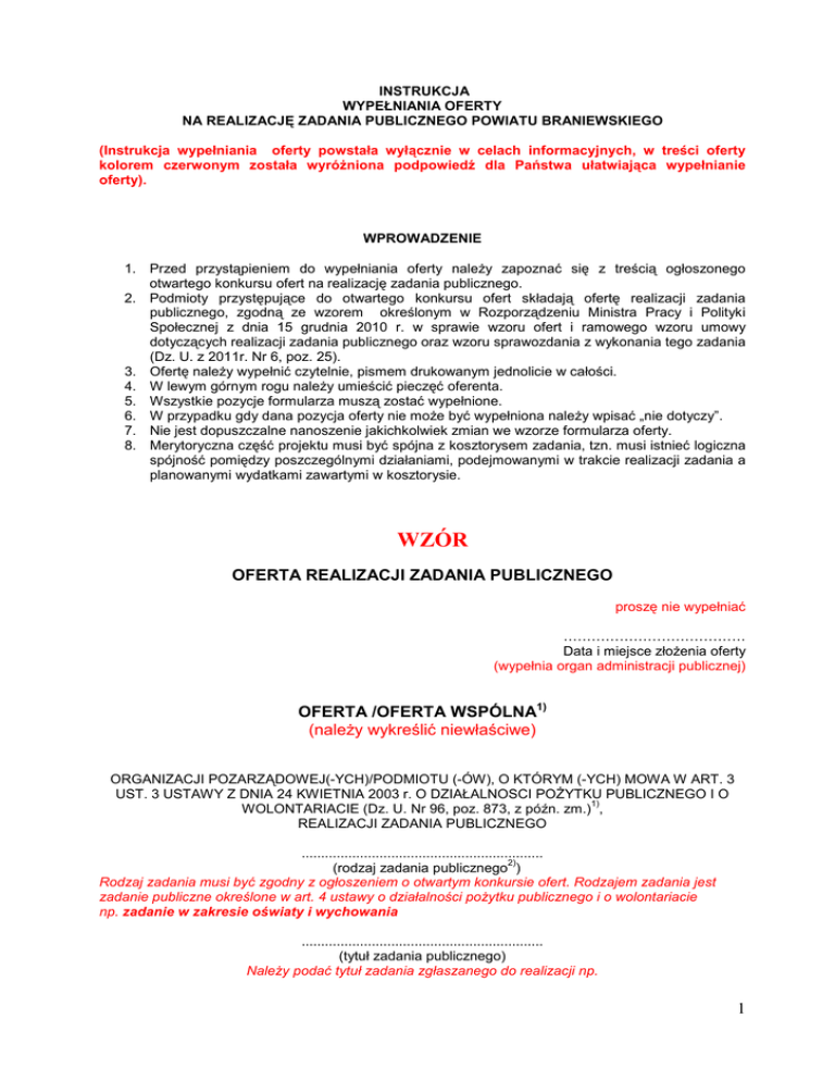 INSTRUKCJA WYPEŁNIANIA OFERTY NA REALIZACJĘ ZADANIA PUBLICZNEGO POWIATU BRANIEWSKIEGO (Instrukcja wypełniania oferty powstała wyłącznie w celach informacyjnych, w treści oferty kolorem czerwonym została wyróŜniona podpowiedź dla Państwa ułatwiająca wypełnianie oferty). WPROWADZENIE 1. Przed przystąpieniem do wypełniania oferty naleŜy zapoznać się z treścią ogłoszonego otwartego konkursu ofert na realizację zadania publicznego. 2. Podmioty przystępujące do otwartego konkursu ofert składają ofertę realizacji zadania publicznego, zgodną ze wzorem określonym w Rozporządzeniu Ministra Pracy i Polityki Społecznej z dnia 15 grudnia 2010 r. w sprawie wzoru ofert i ramowego wzoru umowy dotyczących realizacji zadania publicznego oraz wzoru sprawozdania z wykonania tego zadania (Dz. U. z 2011r. Nr 6, poz. 25). 3. Ofertę naleŜy wypełnić czytelnie, pismem drukowanym jednolicie w całości. 4. W lewym górnym rogu naleŜy umieścić pieczęć oferenta. 5. Wszystkie pozycje formularza muszą zostać wypełnione. 6. W przypadku gdy dana pozycja oferty nie moŜe być wypełniona naleŜy wpisać „nie dotyczy”. 7. Nie jest dopuszczalne nanoszenie jakichkolwiek zmian we wzorze formularza oferty. 8. Merytoryczna część projektu musi być spójna z kosztorysem zadania, tzn. musi istnieć logiczna spójność pomiędzy poszczególnymi działaniami, podejmowanymi w trakcie realizacji zadania a planowanymi wydatkami zawartymi w kosztorysie. WZÓR OFERTA REALIZACJI ZADANIA PUBLICZNEGO proszę nie wypełniać ………………………………… Data i miejsce złoŜenia oferty (wypełnia organ administracji publicznej) OFERTA /OFERTA WSPÓLNA1) (naleŜy wykreślić niewłaściwe) ORGANIZACJI POZARZĄDOWEJ(-YCH)/PODMIOTU (-ÓW), O KTÓRYM (-YCH) MOWA W ART. 3 UST. 3 USTAWY Z DNIA 24 KWIETNIA 2003 r. O DZIAŁALNOSCI POśYTKU PUBLICZNEGO I O 1) WOLONTARIACIE (Dz. U. Nr 96, poz. 873, z późn. zm.) , REALIZACJI ZADANIA PUBLICZNEGO .............................................................. 2) (rodzaj zadania publicznego ) Rodzaj zadania musi być zgodny z ogłoszeniem o otwartym konkursie ofert. Rodzajem zadania jest zadanie publiczne określone w art. 4 ustawy o działalności poŜytku publicznego i o wolontariacie np. zadanie w zakresie oświaty i wychowania .............................................................. (tytuł zadania publicznego) NaleŜy podać tytuł zadania zgłaszanego do realizacji np. 1 Organizowanie czasu wolnego dla dzieci i młodzieŜy pod nazwą – tu naleŜy wpisać nazwę własną zadania, nazwa musi być krótka i identyfikować się z podejmowanymi zadaniami np. „Lato w kolorach tęczy – aktywna młodzieŜ” w okresie od ............ do ............. 2011 (podane daty są datami granicznymi) naleŜy zwrócić uwagę, aby podane daty były zgodne z ogłoszeniem konkursu. NaleŜy podać daty realizacji zadania w układzie dzień/miesiąc/rok. Ogłoszenie wskazuje maksymalny czas realizacji zadania, co oznacza, Ŝe termin realizacji zadania wskazany przez oferenta moŜe być krótszy, albo taki sam jak termin wskazany w ogłoszeniu konkursu, ale nigdy nie dłuŜszy W FORMIE POWIERZENIA REALIZACJI ZADANIA PUBLICZNEGO/WSPIERANIA REALIZACJI ZADANIA PUBLICZNEGO 1) skreślić jedno ze słów (Wspieranie oznacza dofinansowanie części kosztów zadania, zaś powierzenie to sfinansowanie kosztów zadania w 100%) PRZEZ naleŜy wpisać organ, do którego składana jest oferta .............................................................. (organ administracji publicznej) składana na podstawie przepisów działu II rozdziału 2 ustawy z dnia 24 kwietnia 2003 r. o działalności poŜytku publicznego i o wolontariacie 1)3) I. Dane oferenta/oferentów 1) nazwa: .............................................................................................. naleŜy podać pełna nazwę oferenta ubiegającego się o dofinansowanie realizacji zadania publicznego w ramach otwartego konkursu ofert. KaŜdy z oferentów składających ofertę wspólną przedstawia swojedane kolejni oferenci dołączają swoje pola….. 4) 2) forma prawna: Forma prawna oznacza formę działalność organizacji pozarządowej, podmiotu, jednostki organizacyjnej określoną na podstawie obowiązujących przepisów, w szczególności stowarzyszenie i fundacje, osoby prawne i jednostki organizacyjne działające na podstawie przepisów o stosunku Państwa do Kościoła Katolickiego w Rzeczypospolitej Polskiej, o stosunku Państwa do innych kościołów i związków wyznaniowych oraz gwarancjach wolności sumienia i wyznania, jeŜeli ich cele statutowe obejmują prowadzenie działalności poŜytku publicznego, uczniowskie kluby sportowe, ochotnicze straŜe poŜarne oraz inne. NaleŜy zaznaczyć poprzez postawienie „x” odpowiednią formę. ( ) stowarzyszenie ( ) fundacja ( ) kościelna osoba prawna ( ) kościelna jednostka organizacyjna 2 ( ) spółdzielnia socjalna ( ) inna………………………………… 5) 3) numer w Krajowym Rejestrze Sądowym, w innym rejestrze lub ewidencji: NaleŜ podać nazwę właściwego rejestru lub ewidencji np. ewidencja uczniowskich klubów sportowych prowadzona przez starostę właściwego ze względu na siedzibę klubu, dla pozostałych fundacji i stowarzyszeń wypis z Krajowego Rejestru Sądowego, w przypadku kościelnych osób prawnych zaświadczenie o osobowości prawnej parafii/zakonu oraz upowaŜnienie dla proboszcza/przeora do reprezentowania parafii/zakonu i zaciągania zobowiązań finansowych lub dekret powołujący kościelną osobę prawną. 6) 4) data wpisu, rejestracji lub utworzenia: ................................................................................................ naleŜy wpisać dokładną datę pierwszego wpisu, rejestracji lub utworzenia (dd/mm/rr) 5) nr NIP: ............................................................ nr REGON: ..................................................................... 6) ad
