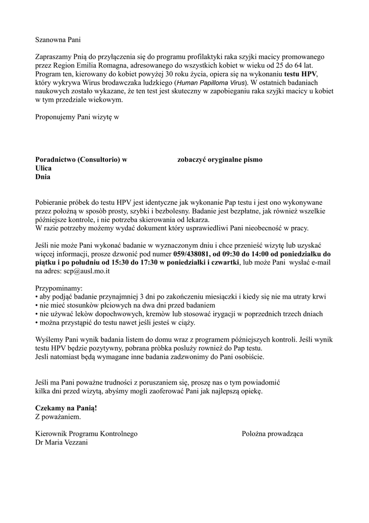 Szanowna Pani Zapraszamy Pnią do przyłączenia się do programu profilaktyki raka szyjki macicy promowanego przez Region Emilia Romagna, adresowanego do wszystkich kobiet w wieku od 25 do 64 lat. Program ten, kierowany do kobiet powyżej 30 roku życia, opiera się na wykonaniu testu HPV, który wykrywa Wirus brodawczaka ludzkiego (Human Papilloma Virus). W ostatnich badaniach naukowych zostało wykazane, że ten test jest skuteczny w zapobieganiu raka szyjki macicy u kobiet w tym przedziale wiekowym. Proponujemy Pani wizytę w Poradnictwo (Consultorio) w Ulica Dnia zobaczyć oryginalne pismo Pobieranie próbek do testu HPV jest identyczne jak wykonanie Pap testu i jest ono wykonywane przez położną w sposòb prosty, szybki i bezbolesny. Badanie jest bezpłatne, jak również wszelkie późniejsze kontrole, i nie potrzeba skierowania od lekarza. W razie potrzeby możemy wydać dokument który usprawiedliwi Pani nieobecność w pracy. Jeśli nie może Pani wykonać badanie w wyznaczonym dniu i chce przenieść wizytę lub uzyskać więcej informacji, prosze dzwonić pod numer 059/438081, od 09:30 do 14:00 od poniedziałku do piątku i po południu od 15:30 do 17:30 w poniedziałki i czwartki, lub może Pani wysłać e-mail na adres: [email protected] Przypominamy: • aby podjąć badanie przynajmniej 3 dni po zakończeniu miesiączki i kiedy się nie ma utraty krwi • nie mieć stosunkòw płciowych na dwa dni przed badaniem • nie używać lekòw dopochwowych, kremòw lub stosować irygacji w poprzednich trzech dniach • można przystąpić do testu nawet jeśli jesteś w ciąży. Wyślemy Pani wynik badania listem do domu wraz z programem późniejszych kontroli. Jeśli wynik testu HPV będzie pozytywny, pobrana pròbka posluży rownież do Pap testu. Jesli natomiast będą wymagane inne badania zadzwonimy do Pani osobiście. Jeśli ma Pani poważne trudności z poruszaniem się, proszę nas o tym powiadomić kilka dni przed wizytą, abyśmy mogli zaoferować Pani jak najlepszą opiekę. Czekamy na Panią! Z poważaniem. Kierownik Programu Kontrolnego Dr Maria Vezzani Polożna prowadząca