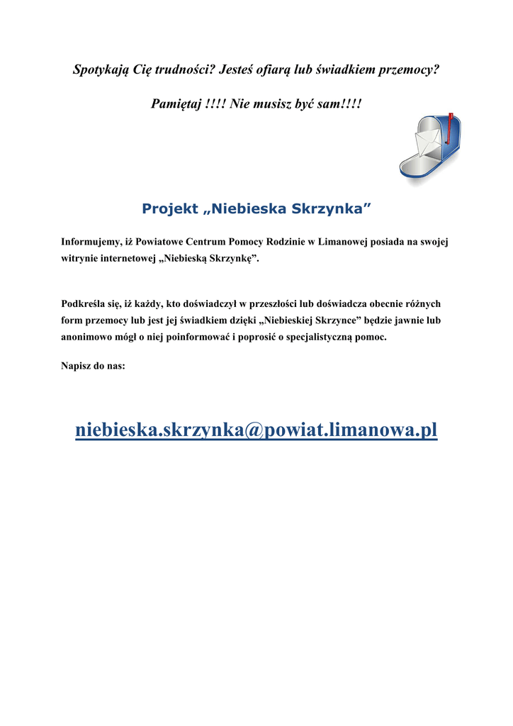 Spotykają Cię trudności? Jesteś ofiarą lub świadkiem przemocy? Pamiętaj !!!! Nie musisz być sam!!!! Projekt „Niebieska Skrzynka” Informujemy, iż Powiatowe Centrum Pomocy Rodzinie w Limanowej posiada na swojej witrynie internetowej „Niebieską Skrzynkę”. Podkreśla się, iż każdy, kto doświadczył w przeszłości lub doświadcza obecnie różnych form przemocy lub jest jej świadkiem dzięki „Niebieskiej Skrzynce” będzie jawnie lub anonimowo mógł o niej poinformować i poprosić o specjalistyczną pomoc. Napisz do nas: [email protected]