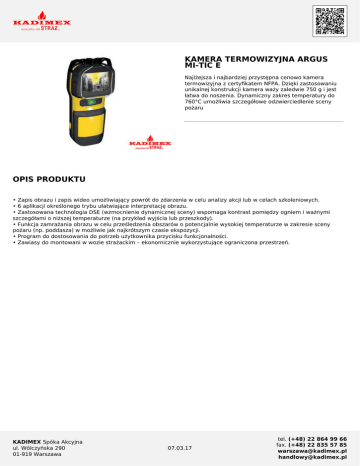 KAMERA TERMOWIZYJNA ARGUS MI-TIC E Najlżejsza i najbardziej przystępna cenowo kamera termowizyjna z certyfikatem NFPA. Dzięki zastosowaniu unikalnej konstrukcji kamera waży zaledwie 750 g i jest łatwa do noszenia. Dynamiczny zakres temperatury do 760°C umożliwia szczegółowe odzwierciedlenie sceny pożaru OPIS PRODUKTU • Zapis obrazu i zapis wideo umożliwiający powrót do zdarzenia w celu analizy akcji lub w celach szkoleniowych. • 6 aplikacji określonego trybu ułatwiające interpretację obrazu. • Zastosowana technologia DSE (wzmocnienie dynamicznej sceny) wspomaga kontrast pomiędzy ogniem i ważnymi szczegółami o niższej temperaturze (na przykład wyjścia lub przeszkody). • Funkcja zamrażania obrazu w celu prześledzenia obszarów o potencjalnie wysokiej temperaturze w zakresie sceny pożaru (np. poddasza) w możliwie jak najkrótszym czasie ekspozycji. • Program do dostosowania do potrzeb użytkownika przycisku funkcjonalności. • Zawiasy do montowani w wozie strażackim – ekonomicznie wykorzystujące ograniczona przestrzeń. KADIMEX Spóka Akcyjna ul. Wólczyńska 290 01-919 Warszawa 07.03.17 tel. (+48) 22 864 99 66 fax. (+48) 22 835 57 85 [email protected] [email protected] Dane techniczne: Warunki termiczne Kamera przystosowana jest do pracy w niżej podanych warunkach: Praca ciągła w zakresie: od –20°C do +85°C - 150°C przez 15 minut - 260°C przez 7 minut Szczelność IP 67 wytrzymuje zanurzenie w wodzie Bezpośredni pomiar temperatury –40°C do 760°C (–40°F do 1400°F) Rozdzielczość 384 x 288 px Spectrum 7.5 – 1,4 um NETD (czułość czujnika) 50 mK (<0,05°C) Odświeżanie 60 Hz Pole widzenia 50° poziomo, 37,5° pionowo Wyświetlacz (rozmiar) 69 mm (2,7 inches) Rodzaj Wysokiej jakości, przemysłowa, aktywna matryca TFT LCD Rozdzielczość QVGA 320 x 240 (każdy piksel w formacie RGB, całkowita ilość pikseli 230, 400) Wymiary kamery (H x W x D) 203 mm x 96 mm x 85 Waga 600 g (765 g z baterią standardową) Obudowa kamery Radel R-5100 i Santoprene Wyświetlacz LCD Ultrason E 2010 HC Pojemość akumulatora 1100 mAh, 6.6 V Czas pracy akumulatora Powyżej 2 godzin w temperaturze 22°C Odporność BS EN 61000-6-2:2005, BS EN 50498:2010 HoHS Wszystkie elementy systemu są zgodne z Dyrektywą EU 2011/65/EC KADIMEX Spóka Akcyjna ul. Wólczyńska 290 01-919 Warszawa 07.03.17 tel. (+48) 22 864 99 66 fax. (+48) 22 835 57 85 [email protected] [email protected] GALERIA ZDJĘĆ kamera-termowizyjna-argus-mi-tic-e-3 kamera-termowizyjna-argus-mi-tic-e-2 KADIMEX Spóka Akcyjna ul. Wólczyńska 290 01-919 Warszawa 07.03.17 tel. (+48) 22 864 99 66 fax. (+48) 22 835 57 85 [email protected] [email protected]