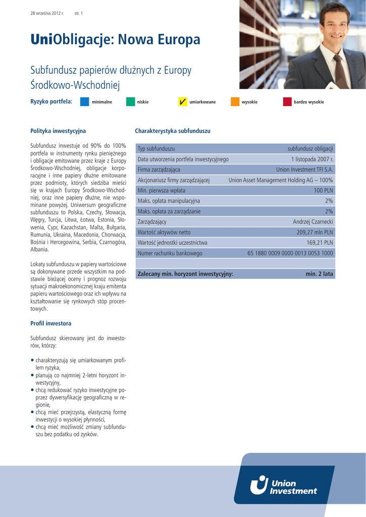 28 września 2012 r. str. 1 UniObligacje: Nowa Europa Subfundusz papierów dłużnych z Europy Środkowo-Wschodniej Ryzyko portfela: minimalne Polityka inwestycyjna Subfundusz inwestuje od 90% do 100% portfela w instrumenty rynku pieniężnego i obligacje emitowane przez kraje z Europy Środkowo-Wschodniej, obligacje korporacyjne i inne papiery dłużne emitowane przez podmioty, których siedziba mieści się w krajach Europy Środkowo-Wschodniej, oraz inne papiery dłużne, nie wspominane powyżej. Uniwersum geograficzne subfunduszu to Polska, Czechy, Słowacja, Węgry, Turcja, Litwa, Łotwa, Estonia, Słowenia, Cypr, Kazachstan, Malta, Bułgaria, Rumunia, Ukraina, Macedonia, Chorwacja, Bośnia i Hercegowina, Serbia, Czarnogóra, Albania. Lokaty subfunduszu w papiery wartościowe są dokonywane przede wszystkim na podstawie bieżącej oceny i prognoz rozwoju sytuacji makroekonomicznej kraju emitenta papieru wartościowego oraz ich wpływu na kształtowanie się rynkowych stóp procentowych. Profil inwestora Subfundusz skierowany jest do inwestorów, którzy: • charakteryzują się umiarkowanym profilem ryzyka, • planują co najmniej 2-letni horyzont inwestycyjny, • chcą redukować ryzyko inwestycyjne poprzez dywersyfikację geograficzną w regionie, • chcą mieć przejrzystą, elastyczną formę inwestycji o wysokiej płynności, • chcą mieć możliwość zmiany subfunduszu bez podatku od zysków. niskie umiarkowane wysokie bardzo wysokie Charakterystyka subfunduszu Typ subfunduszu subfundusz obligacji Data utworzenia portfela inwestycyjnego 1 listopada 2007 r. Firma zarządzająca Akcjonariusz firmy zarządzającej Union Investment TFI S.A. Union Asset Management Holding AG – 100% Min. pierwsza wpłata 100 PLN Maks. opłata manipulacyjna 2% Maks. opłata za zarządzanie 2% Zarządzający Wartość aktywów netto Wartość jednostki uczestnictwa Numer rachunku bankowego Zalecany min. horyzont inwestycyjny: Andrzej Czarnecki 209,27 mln PLN 169,21 PLN 65 1880 0009 0000 0013 0053 1000 min. 2 lata 28 września 2012 r. str. 2 UniObligacje: Nowa Europa Subfundusz papierów dłużnych z Europy Środkowo-Wschodniej Ryzyko portfela: minimalne niskie umiarkowane wysokie bardzo wysokie Wyniki inwestycyjne subfunduszu i benchmarku* 1m 3m 6m 1 rok 2 lata 5 lat 10 lat UniObligacje: Nowa Europa (%) 0,38 2,63 8,40 13,46 17,40 68,53 – Benchmark (%) -0,56 2,17 7,82 7,54 13,43 50,66 – Różnica 0,95 0,47 0,58 5,92 3,98 17,87 – * Stopy zwrotu subfunduszu i benchmarku obliczane są na podstawie ostatnich dni roboczych miesiąca. Zmiana wartości jednostki w porównaniu z benchmarkiem UniObligacje: Nowa Europa Benchmark UniObligacje: Nowa Europa 162 152 142 132 122 112 102 92 Wrz ’07 Kwi ’08 Lis ’08 Maj ’09 Gru ’09 Cze ’10 Sty ’11 Lip ’11 Lut ’12 Wrz ’12 Benchmark1 Alokacja aktywów Bony i obligacje skarbowe Komercyjne instrumenty dłużne 87,39% 12,61% 0 20 40 60 80 Merrill Lynch Poland, Hungary, Czech, Turkey, Slovakia Government Index (w zł) 100 ¹ Wzorcowy portfel, który stanowi punkt odniesienia do dokonywania oceny wyników zarządzania aktywami funduszu. 28 września 2012 r. str. 3 UniObligacje: Nowa Europa Subfundusz papierów dłużnych z Europy Środkowo-Wschodniej Ryzyko portfela: minimalne niskie umiarkowane Alokacja geograficzna portfela Beta do benchmarku – współczynnik ten pokazuje zależność pomiędzy zmianami wartości jednostki funduszu a benchmarku. Wskaźnik beta wynoszący 1 oznacza, że zmiany wartości jednostki funduszu są takie same jak benchmarku, co sugeruje, że skład instrumentów funduszu jest tożsamy ze składem instrumentów w benchmarku. Beta o wartości mniejszej niż 1 oznacza, że wzrost (spadek) benchmarku o 1% jest zazwyczaj powiązany ze wzrostem (spadkiem) wartości jednostki funduszu o mniej niż 1%. Wartość beta większa niż 1 oznacza, że wzrost (spadek) benchmarku o 1% jest zazwyczaj powiązany ze wzrostem (spadkiem) wartości jednostki funduszu o więcej niż 1%. Węgry 10,99% Czechy 0,19% Turcja 22,81% Inne 5,15% Struktura walutowa PLN TRY HUF EUR USD CZK 64,23% 22,81% 10,01% 2,45% 0,30% 0,20% 20 Współczynniki ryzyka 12 m Beta do benchmarku 0,62 Beta do WIG 0,09 Information ratio 1,58 Tracking error 0,04 Współczynnik Sharpe’a 2,07 Odchylenie standardowe 4,24% Duration (w latach)* * Dane na dzień 30.06.2012 r. 4,66 bardzo wysokie Słowniczek Polska 60,86% 0 wysokie 40 60 80 100 Beta do WIG – współczynnik ten pokazuje zależność pomiędzy zmianami wartości jednostki funduszu a zmianami indeksu WIG. Wskaźnik beta wynoszący 1 oznacza, że zmiany wartości jednostki funduszu są takie same jak indeksu WIG. Beta o wartości mniejszej niż 1 oznacza, że wzrost (spadek) benchmarku o 1% jest zazwyczaj powiązany ze wzrostem (spadkiem) wartości indeksu WIG o mniej niż 1%. Wartość beta większa niż 1 oznacza, że wzrost (spadek) indeksu WIG o 1% jest zazwyczaj powiązany ze wzrostem (spadkiem) wartości jednostki funduszu o więcej niż 1%. Information ratio – współczynnik ten pokazuje, jak opłacalne jest ryzyko, jakie ponosi fundusz w stosunku do swojego benchmarku. Im wyższy poziom wskaźnika information ratio, tym przy niższym nakładzie ryzyka w stosunku do benchmarku został osiągnięty wynik funduszu. Fundusz, który osiąga information ratio powyżej 0,3, uważany jest za efektywnie zarządzany. Tracking error – współczynnik ten pokazuje, jak ryzykowny jest dany fundusz w stosunku do swojego benchmarku. Im wyższy wskaźnik, tym bardziej agresywnie zarządzany jest fundusz w stosunku do swojego benchmarku. Wskaźnik stosuje się do porównywania ryzyka funduszy o podobnym profilu (np. funduszy akcyjnych). 28 września 2012 r. str. 4 UniObligacje: Nowa Europa Subfundusz papierów dłużnych z Europy Środkowo-Wschodniej Ryzyko portfela: minimalne niskie umiarkowane Przedstawiane informacje finansowe dotyczą wskazanego okresu i nie gwarantują podobnych wyników w przyszłości. Br