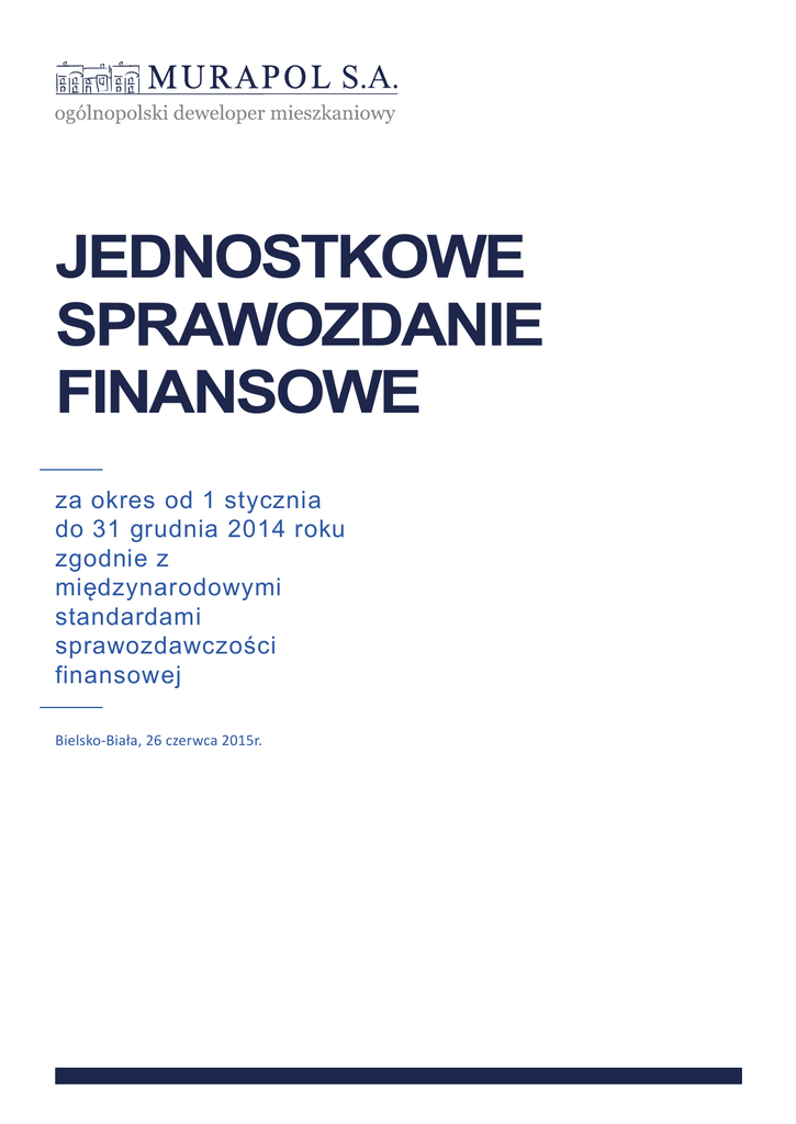 JEDNOSTKOWE SPRAWOZDANIE FINANSOWE za okres od 1 stycznia do 31 grudnia 2014 roku zgodnie z międzynarodowymi standardami sprawozdawczości finansowej Bielsko-Biała, 26 czerwca 2015r. SPRAWOZDANIE FINANSOWE MURAPOL S.A. ZA OKRES OD 01.01 DO 31.12.2014r. STRONA 2 SPRAWOZDANIE FINANSOWE MURAPOL S.A. ZA OKRES OD 01.01 DO 31.12.2014r. Spis treści A WPROWADZENIE DO SPRAWOZDANIA FINANSOWEGO 1. 2. 5 5 10 Informacje ogólne Stosowane zasady rachunkowości B. SPRAWOZDANIE FINANSOWE 24 1. 2. 3. 4. 24 25 27 29 Sprawozdanie z całkowitych dochodów Sprawozdanie z sytuacji finansowej Sprawozdanie z przepływów pieniężnych Sprawozdanie ze zmian w kapitale własnym C. NOTY OBJAŚNIAJĄCE DO SPRAWOZDANIA FINANSOWEGO 31 1. 2. 3. 4. 5. 6. 7. 8. 9. 10. 11. 12. 13. 14. 15. 16. 17. 18. 19. 20. 21. 22. 23. 24. 25. 26. 27. 28. 29. 30. 31. 32. 33. 31 32 33 Wartości niematerialne w okresie od 01.01 do 31.12.2014r. - NOTA NR 1 Rzeczowe aktywa trwałe w okresie od 01.01 do 31.12.2014r. - NOTA NR 2 Nieruchomości inwestycyjne w okresie od 01.01 do 31.12.2014r. - NOTA NR 3 Inwestycje w jednostkach zależnych objętych konsolidacją oraz inwestycje w pozostałych jednostkach powiązanych nie objętych konsolidacją w okresie od 01.01 do 31.12.2014r. - NOTA NR 4 Aktywa finansowe dostępne do sprzedaży na dzień 31.12.2014r. - NOTA NR 5 Aktywa finansowe wyceniane w wartości godziwej przez wynik finansowy - NOTA NR 6 Instrumenty finansowe - porównanie wartości bilansowych i wartości godziwych na dzień 31.12.2014r - NOTA NR 7 Rodzaje ryzyk - NOTA NR 8 Informacje na temat podmiotów powiązanych za okres od 01.01 do 31.12.2014r - NOTA NR 9 Nabycie spółki zależnej za okres od 01.01 do 31.12.2014r. - NOTA NR 10 Zapasy na dzień 31.12.2014r. - NOTA NR 11 Zapasy w okresie od 01.01 do 31.12.2014r. - NOTA NR 12 Należności z tytułu dostaw i usług oraz pozostałe należności na dzień 31.12.2014r. - NOTA NR 13 Rozliczenia międzyokresowe na dzień 31.12.2014r. - NOTA NR 14 Środki pieniężne i ich ekwiwalenty na dzień 31.12.2014r. - NOTA NR 15 Kapitał podstawowy na dzień 31.12.2014r. - NOTA NR 16 Zmiany kapitału podstawowego w okresie od 01.01 do 31.12.2014r. - NOTA NR 17 Kapitał zapasowy na dzień 31.12.2014r. - NOTA NR 18 Kapitał rezerwowy na dzień 31.12.2014r. - NOTA NR 19 Zmiany pozostałych kapitałów w okresie od 01.01 do 31.12.2014r. - NOTA NR 20 Rezerwy na świadczenia emerytalne i podobne w okresie od 01.01 do 31.12.2014r. - NOTA NR 21 Pozostałe rezerwy w okresie od 01.01 do 31.12.2014r. - NOTA NR 22 Zobowiązania z tytułu dostaw i usług oraz pozostałe zobowiązania krótkoterminowe na dzień 31.12.2014r. - NOTA NR 23 Kredyty i pożyczki na dzień 31.12.2014r. - NOTA NR 24 Struktura zapadalności kredytów, pożyczek i obligacji na dzień 31.12.2014r. - NOTA NR 25 Kredyty, pożyczki i obligacje w podziale na waluty na dzień 31.12.2014r. - NOTA NR 26 Zobowiązania z tytułu umów leasingu operacyjnego na dzień 31.12.2014r. - NOTA NR 27 Zobowiązania z tytułu umów leasingu finansowego na dzień 31.12.2014r. - NOTA NR 28 Przedmioty leasingu na dzień 31.12.2014r. - NOTA NR 29 Zobowiązania warunkowe na dzień 31.12.2014r. - NOTA NR 30 Podatek dochodowy za okres od 01.01 do 31.12.2014r. - NOTA NR 31 Odroczony podatek dochodowy w okresie od 01.01 do 31.12.2014r. - NOTA NR 32 Przychody ze sprzedaży w okresie od 01.01 do 31.12.2014r. - NOTA NR 33 34 36 37 41 42 44 45 45 46 46 47 47 48 48 48 49 49 50 50 51 52 58 59 59 59 60 60 61 62 63 STRONA 3 SPRAWOZDANIE FINANSOWE MURAPOL S.A. ZA OKRES OD 01.01 DO 31.12.2014r. 34. 35. 36. 37. 29. 39. 40. 41. 42. 43. 44. 45. 46. Koszty według rodzaju w okresie od 01.01 do 31.12.2014r. - NOTA NR 34 Pozostałe przychody i koszty w okresie od 01.01 do 31.12.2014r. - NOTA NR 35 Przychody i koszty finansowe w okresie od 01.01 do 31.12.2014r. - NOTA NR 36 Zysk/strata z tytułu różnic kursowych - netto w okresie od 01.01 do 31.12.2014r. - NOTA NR 37 Wynik działalności zaniechanej za okres od 01.01 do 31.12.2014r. - NOTA NR 38 Zysk przypadający na jedną akcję za okres od 01.01 do 31.12.2014r. - NOTA NR 39 Segmenty działalności w okresie od 01.01 do 31.12.2014r. - NOTA NR 40 informacje o łącznej wartości wynagrodzeń i nagród (w pieniądzu i w naturze), wypłaconych lub należnych, odrębnie dla osób zarządzających i nadzorujących emitenta w przedsiębiorstwie emitenta, bez względu na to, czy były one zaliczane w koszty, czy też wynikały z podziału zysku, a w przypadku, gdy emitentem jest jednostka dominująca lub znaczący inwestor - oddzielnie informacje o wartości wynagrodzeń i nagród otrzymanych z tytułu pełnienia funkcji we władzach jednostek zależnych, współzależnych i stowarzyszonych; dodatkowo należy podać informacje o wynagrodzeniach, łącznie z wynagrodzeniami z zysku, wypłaconych lub zależnych osobom wchodzącym w skład organów zarządzających i nadzorujących spółek handlowych (dla każdej grupy osobno) - NOTA NR 41 Zdarzenia po dacie bilansu - NOTA NR 42 Zmiany zasad rachunkowości w okresie od 01.01 do 31.12.2014r. - NOTA NR 43 Objaśnienia dotyczące rachunku przepływów pieniężnych w okresie od 01.01 do 31.12.2014r. - NOTA NR 44 Ujawnienie elementów pozostałych dochodów całkowitych w okresie od 01.01 do 31.12.2014r. - NOTA NR 45 Wybrane dane finansowe wraz z przeliczeniem na euro - NOTA NR 46 63 65 65 66 66 67 68 68 69 71 71 71 72 STRONA 4 SPRAWOZDANIE FINANSOWE MURAPOL S.A. ZA OKRES OD 01.01 DO 31.12.2014r. Sprawozdanie finansowe za okres od 01.01 do 31.12.2014 r. Wszystkie kwoty wyrażone są w tysiącach złotych polskich (o ile nie wskazano inaczej) Waluta sprawozdawcza: złoty polski (PLN) A WPROWADZENIE DO SPRAWOZDANIA FINANSOWEGO 1. INFORMACJE OGÓLNE Informacje o Spółce Emitent został utworzony na podstawie umowy Spółki, sporządzonej w formie aktu notarialnego przed Notariuszem Dariuszem Wojciechem Rzadkowskim i Jarosławem Stejskalem w Kancelarii Notarialnej w Bielsku-Białej, w dniu 2