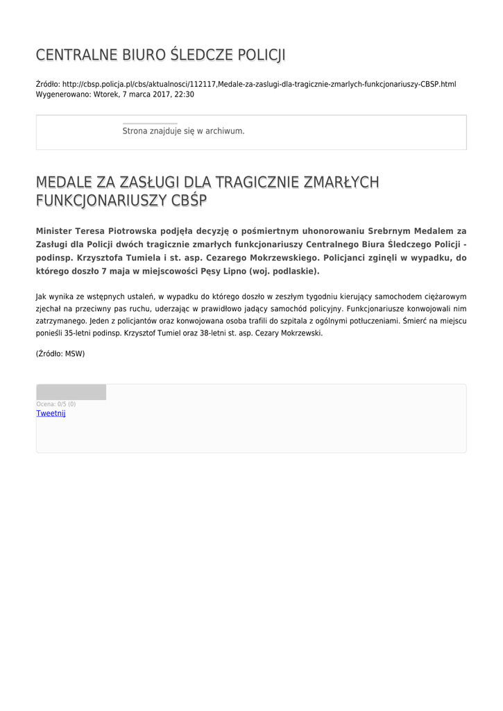 CENTRALNE BIURO ŚLEDCZE POLICJI Źródło: http://cbsp.policja.pl/cbs/aktualnosci/112117,Medale-za-zaslugi-dla-tragicznie-zmarlych-funkcjonariuszy-CBSP.html Wygenerowano: Wtorek, 7 marca 2017, 22:30 Strona znajduje się w archiwum. MEDALE ZA ZASŁUGI DLA TRAGICZNIE ZMARŁYCH FUNKCJONARIUSZY CBŚP Minister Teresa Piotrowska podjęła decyzję o pośmiertnym uhonorowaniu Srebrnym Medalem za Zasługi dla Policji dwóch tragicznie zmarłych funkcjonariuszy Centralnego Biura Śledczego Policji podinsp. Krzysztofa Tumiela i st. asp. Cezarego Mokrzewskiego. Policjanci zginęli w wypadku, do którego doszło 7 maja w miejscowości Pęsy Lipno (woj. podlaskie). Jak wynika ze wstępnych ustaleń, w wypadku do którego doszło w zeszłym tygodniu kierujący samochodem ciężarowym zjechał na przeciwny pas ruchu, uderzając w prawidłowo jadący samochód policyjny. Funkcjonariusze konwojowali nim zatrzymanego. Jeden z policjantów oraz konwojowana osoba trafili do szpitala z ogólnymi potłuczeniami. Śmierć na miejscu ponieśli 35-letni podinsp. Krzysztof Tumiel oraz 38-letni st. asp. Cezary Mokrzewski. (Źródło: MSW) Ocena: 0/5 (0) Tweetnij