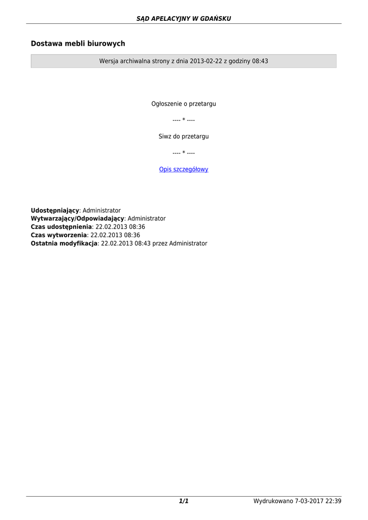 SĄD APELACYJNY W GDAŃSKU Dostawa mebli biurowych Wersja archiwalna strony z dnia 2013-02-22 z godziny 08:43 Ogłoszenie o przetargu ---- * ---Siwz do przetargu ---- * ---Opis szczegółowy Udostępniający: Administrator Wytwarzający/Odpowiadający: Administrator Czas udostępnienia: 22.02.2013 08:36 Czas wytworzenia: 22.02.2013 08:36 Ostatnia modyfikacja: 22.02.2013 08:43 przez Administrator 1/1 Wydrukowano 7-03-2017 22:39