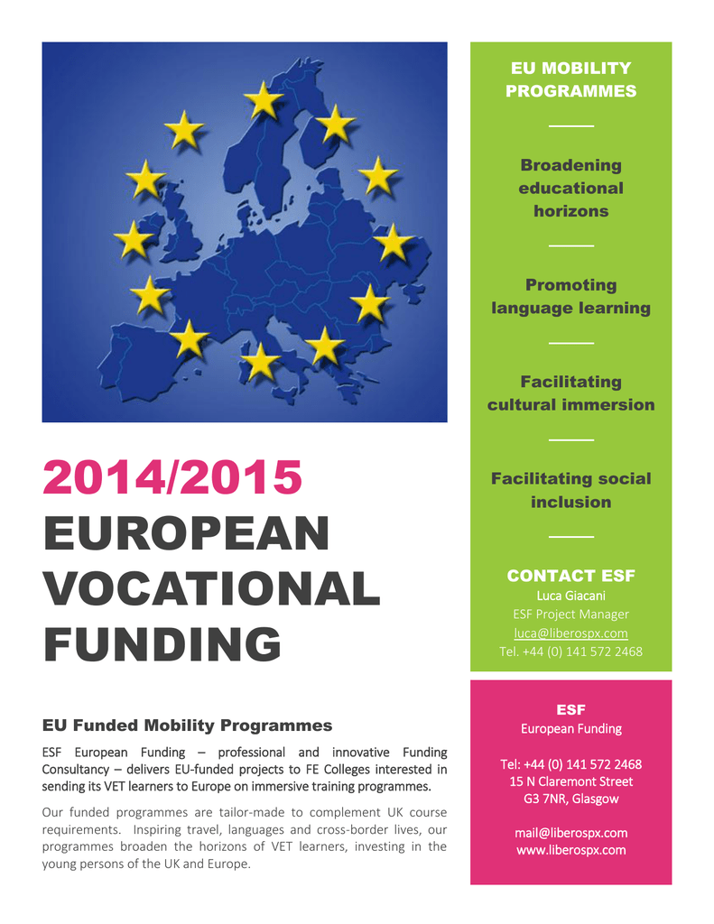 EU MOBILITY PROGRAMMES Broadening educational horizons Promoting language learning Facilitating cultural immersion 2014/2015 EUROPEAN VOCATIONAL FUNDING EU Funded Mobility Programmes ESF European Funding – professional and innovative Funding Consultancy – delivers EU-funded projects to FE Colleges interested in sending its VET learners to Europe on immersive training programmes. Our funded programmes are tailor-made to complement UK course requirements. Inspiring travel, languages and cross-border lives, our programmes broaden the horizons of VET learners, investing in the young persons of the UK and Europe. Facilitating social inclusion CONTACT ESF Luca Giacani ESF Project Manager [email protected] Tel. +44 (0) 141 572 2468 ESF European Funding Tel: +44 (0) 141 572 2468 15 N Claremont Street G3 7NR, Glasgow [email protected] www.liberospx.com mail@liberos px. co m European Vocational Funding ESF organises mobility projects involving young European VET learners from all over Europe, in long and short-term exchange projects. ESF is specialised in designing, drafting and project managing educational programme for VET students enrolled in UK Further Education Colleges. International mobility is becoming a must worldwide for students seeking to enter increasingly competitive higher educational and employment markets. WHAT WE DO Evaluate course objectives and identify the funding programme most suitable for participant needs; Identify appropriate partners, drawing upon excellent contact network; Negotiate contractual agreement with partners and provide ad hoc legal support; Design, draft and submit the final funding application to the European Commission; Manage full administrative workload throughout, during and following the application process; Broker final agreement with ECORYS UK, national funding agency upon project approval; Fully organise, project and event-manage implementation of final approved project. OUR GOALS To broaden the educational horizons of young VET learners, combining technical, professional and social education to offer effective, course-focussed vocational training programmes; To promote language learning, enabling young VET learners to traverse communicative barriers, tackling ignorance and xenophobia and fostering mutual understanding; To facilitate cultural immersion, enabling young VET learners to learn from persons and organisations of cultures and backgrounds different from their own; To facilitate social inclusion, nurturing the free movement of VET learners throughout all Member States of the European Union and European Economic Area (EEA). KEY PERSONNEL Kenneth Moyes – Managing Director Luca Giacani – EU Project Manager William Davidson – Contracts Manager, Paralegal Francesca Lorenzet – Brand Marketing Manager ESF European Funding Tel: +44 (0) 141 572 2468 – Fax: +44 (0) 141 572 0821 15 North Claremont Street, G3 7 NR, Glasgow, Scotland [email protected] - www.liberospx.com