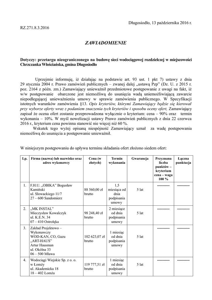 Długosiodło, 13 października 2016 r. RZ.271.8.3.2016 ZAWIADOMIENIE Dotyczy: przetargu nieograniczonego na budowę sieci wodociągowej rozdzielczej w miejscowości Chrzczanka Włościańska, gmina Długosiodło Uprzejmie informuję, iż działając na podstawie art. 93 ust. 1 pkt 7) ustawy z dnia 29 stycznia 2004 r. Prawo zamówień publicznych – zwanej dalej „ustawą Pzp” (Dz. U. z 2015 r. poz. 2164 z późn. zm.) Zamawiający unieważnił przedmiotowe postępowanie z uwagi na fakt, iż w/w postępowanie obarczone jest niemożliwą do usunięcia wadą uniemożliwiającą zawarcie niepodlegającej unieważnieniu umowy w sprawie zamówienia publicznego. W Specyfikacji istotnych warunków zamówienia §13. Opis kryteriów, którymi Zamawiający będzie się kierował przy wyborze oferty wraz z podaniem znaczenia tych kryteriów i sposobu oceny ofert, Zamawiający zapisał że ocena ofert zostanie przeprowadzona wyłącznie o kryterium: cena – 90% oraz termin wykonania – 10%. W myśl nowelizacji ustawy Prawo zamówień publicznych z dnia 22 czerwca 2016 r., kryterium cena powinna stanowić nie więcej niż 60 %. Wskutek tego wyżej opisaną niespójność Zamawiający uznał za wadę postępowania niemożliwą do usunięcia a postępowanie unieważnił. W niniejszym postępowaniu do upływu terminu składania ofert złożono siedem ofert: Lp. Firma (nazwa) lub nazwisko oraz adres wykonawcy 1. 2. 3. 4. Cena (w złotych) Termin wykonania F.H.U. „OBIKA” Bogusław Kamiński ul. Słowackiego 11/7 27 – 600 Sandomierz 88 560,00 zł brutto „MK INSTAL” Mieczysław Kowalczyk ul. K.E.N. 34 07 – 410 Ostrołęka 98 248,40 zł brutto 2 miesiące od dnia podpisania umowy 102 623,07 zł brutto 1 miesiąc od dnia podpisania umowy 119 777,51 zł brutto 1 miesiąc od dnia podpisania umowy Zakład Projektowo – Wykonawczy WOD-KAN, CO, Gazu „ART-HAUS” Artur Hausman ul. Okólna 33 06 – 500 Mława Wodociągi Wiejskie Sp. z o. o. w Łomży ul. Akademicka 18 18 – 402 Łomża 1,5 miesiąca od dnia podpisania umowy Gwarancja Przyznana Łączna liczba punktacja punktów – kryterium cena – waga 100 % ---------- ---------- ---------- ---------- ---------- ---------- ---------- ---------- 5 lat 5 lat 5 lat 5 lat 5. 6. 7. Przedsiębiorstwo Inżynierii Sanitarnej „ENERGAS” s.c. Paweł i Andrzej Ochenkowscy ul. Warszawska 2 07 – 410 Ostrołęka Przedsiębiorstwo Usługowo – Handlowe „WODMEL” Sp. z o. o. ul. Zambrowska 8 18 – 200 Wysokie Mazowieckie MULTIKOM Andrzej Nakielski ul. Kolejowa 103 07 – 410 Ostrołęka 91 214,52 zł brutto 117 154,67 zł brutto 89 812,03 zł brutto 1 miesiąc od dnia podpisania umowy 2 miesiące od dnia podpisania umowy 1 miesiąc od dnia podpisania umowy ---------- ---------- ---------- ---------- ---------- ---------- 5 lat 5 lat 5 lat Na podstawie art. 46 ust. 1 ustawy Prawo zamówień publicznych zwracam wadium wniesione w formie gwarancji ubezpieczeniowej (gwarancji bankowej). Zgodnie z art. 179 – 180 ustawy Pzp wykonawca, a także inny podmiot może wnieść odwołanie, jeżeli ma lub miał interes w uzyskaniu danego zamówienia oraz poniósł lub może ponieść szkodę w wyniku naruszenia przez zamawiającego przepisów ustawy. Wójt Gminy /-/ Stanisław Jastrzębski