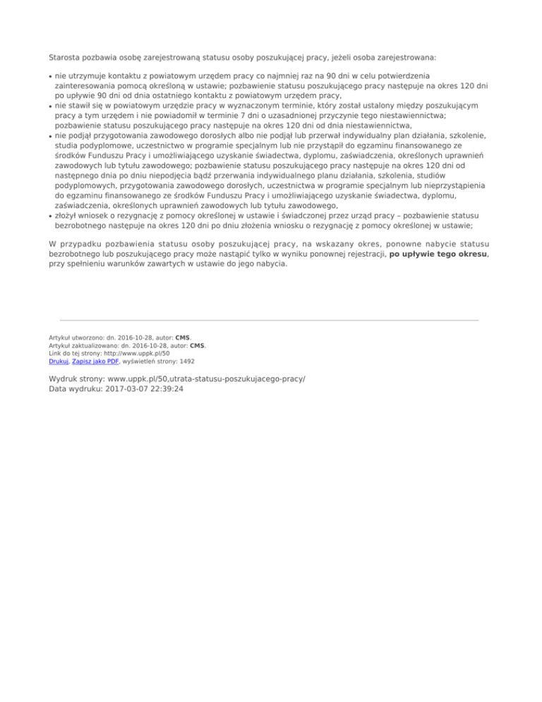 Starosta pozbawia osobę zarejestrowaną statusu osoby poszukującej pracy, jeżeli osoba zarejestrowana: ● ● ● ● nie utrzymuje kontaktu z powiatowym urzędem pracy co najmniej raz na 90 dni w celu potwierdzenia zainteresowania pomocą określoną w ustawie; pozbawienie statusu poszukującego pracy następuje na okres 120 dni po upływie 90 dni od dnia ostatniego kontaktu z powiatowym urzędem pracy, nie stawił się w powiatowym urzędzie pracy w wyznaczonym terminie, który został ustalony między poszukującym pracy a tym urzędem i nie powiadomił w terminie 7 dni o uzasadnionej przyczynie tego niestawiennictwa; pozbawienie statusu poszukującego pracy następuje na okres 120 dni od dnia niestawiennictwa, nie podjął przygotowania zawodowego dorosłych albo nie podjął lub przerwał indywidualny plan działania, szkolenie, studia podyplomowe, uczestnictwo w programie specjalnym lub nie przystąpił do egzaminu finansowanego ze środków Funduszu Pracy i umożliwiającego uzyskanie świadectwa, dyplomu, zaświadczenia, określonych uprawnień zawodowych lub tytułu zawodowego; pozbawienie statusu poszukującego pracy następuje na okres 120 dni od następnego dnia po dniu niepodjęcia bądź przerwania indywidualnego planu działania, szkolenia, studiów podyplomowych, przygotowania zawodowego dorosłych, uczestnictwa w programie specjalnym lub nieprzystąpienia do egzaminu finansowanego ze środków Funduszu Pracy i umożliwiającego uzyskanie świadectwa, dyplomu, zaświadczenia, określonych uprawnień zawodowych lub tytułu zawodowego, złożył wniosek o rezygnację z pomocy określonej w ustawie i świadczonej przez urząd pracy – pozbawienie statusu bezrobotnego następuje na okres 120 dni po dniu złożenia wniosku o rezygnację z pomocy określonej w ustawie; W przypadku pozbawienia statusu osoby poszukującej pracy, na wskazany okres, ponowne nabycie statusu bezrobotnego lub poszukującego pracy może nastąpić tylko w wyniku ponownej rejestracji, po upływie tego okresu, przy spełnieniu warunków zawartych w ustawie do jego nabycia. Artykuł utworzono: dn. 2016-10-28, autor: CMS. Artykuł zaktualizowano: dn. 2016-10-28, autor: CMS. Link do tej strony: http://www.uppk.pl/50 Drukuj, Zapisz jako PDF, wyświetleń strony: 1492 Wydruk strony: www.uppk.pl/50,utrata-statusu-poszukujacego-pracy/ Data wydruku: 2017-03-07 22:39:24