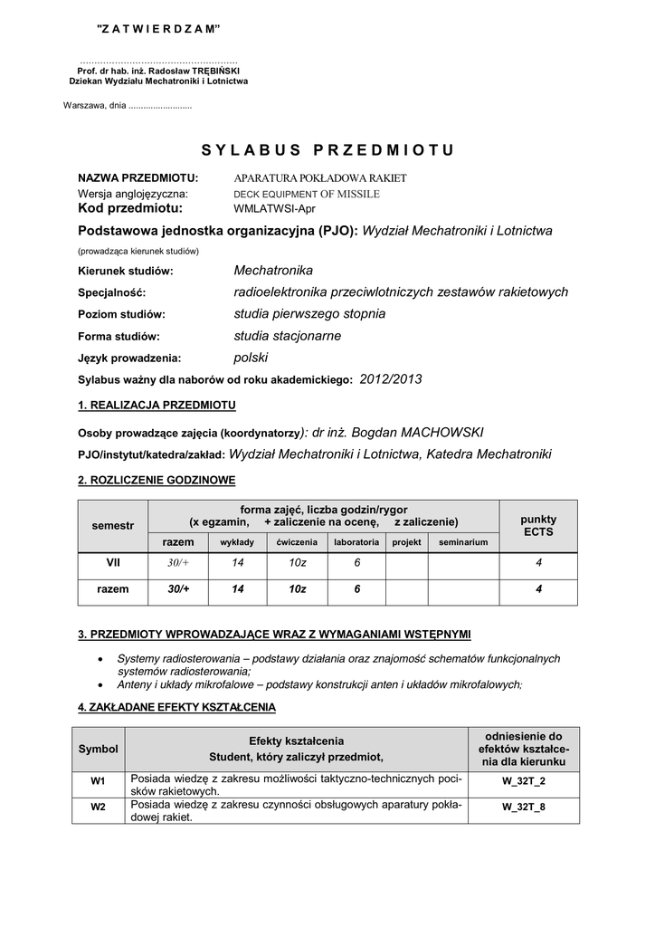"Z A T W I E R D Z A M” ……………………………………………… Prof. dr hab. inż. Radosław TRĘBIŃSKI Dziekan Wydziału Mechatroniki i Lotnictwa Warszawa, dnia .......................... SYLABUS PRZEDMIOTU NAZWA PRZEDMIOTU: Wersja anglojęzyczna: DECK EQUIPMENT OF MISSILE Kod przedmiotu: WMLATWSI-Apr APARATURA POKŁADOWA RAKIET Podstawowa jednostka organizacyjna (PJO): Wydział Mechatroniki i Lotnictwa (prowadząca kierunek studiów) Kierunek studiów: Mechatronika Specjalność: radioelektronika przeciwlotniczych zestawów rakietowych Poziom studiów: studia pierwszego stopnia Forma studiów: studia stacjonarne Język prowadzenia: polski Sylabus ważny dla naborów od roku akademickiego: 2012/2013 1. REALIZACJA PRZEDMIOTU Osoby prowadzące zajęcia (koordynatorzy): dr inż. Bogdan MACHOWSKI PJO/instytut/katedra/zakład: Wydział Mechatroniki i Lotnictwa, Katedra Mechatroniki 2. ROZLICZENIE GODZINOWE forma zajęć, liczba godzin/rygor (x egzamin, + zaliczenie na ocenę, z zaliczenie) semestr punkty ECTS razem wykłady ćwiczenia laboratoria VII 30/+ 14 10z 6 4 razem 30/+ 14 10z 6 4 projekt seminarium 3. PRZEDMIOTY WPROWADZAJĄCE WRAZ Z WYMAGANIAMI WSTĘPNYMI Systemy radiosterowania – podstawy działania oraz znajomość schematów funkcjonalnych systemów radiosterowania; Anteny i układy mikrofalowe – podstawy konstrukcji anten i układów mikrofalowych; 4. ZAKŁADANE EFEKTY KSZTAŁCENIA Symbol W1 W2 Efekty kształcenia Student, który zaliczył przedmiot, odniesienie do efektów kształcenia dla kierunku Posiada wiedzę z zakresu możliwości taktyczno-technicznych pocisków rakietowych. Posiada wiedzę z zakresu czynności obsługowych aparatury pokładowej rakiet. W_32T_2 W_32T_8 W3 W4 U1 U2 Ma podstawową wiedzę w zakresie mechaniki i budowy mechanizmów współdziałających w aparaturze pokładowej rakiet. Ma podstawową wiedzę dotyczącą konstrukcji maszyn wykorzystywanych w aparaturze pokładowej rakiet. Posiada wiedzę z zakresu zwalczania celów powietrznych w różnych warunkach sytuacji powietrznej i radioelektronicznej. Potrafi przeprowadzić analizę schematów funkcjonalnych i ideowych aparatury pokładowej rakiet. W_32T_9 K_W10 U_32T_6 K_U08 5. METODY DYDAKTYCZNE Wykłady ilustrowane prezentacjami komputerowymi w celu dostarczenia i usystematyzowania wiedzy określonej efektami W1, W2, W3 i W4. Ćwiczenia audytoryjne polegające na indywidualnym i grupowym rozwiązywaniu zadań w celu usystematyzowania wiedzy określonej efektami W1, W2, W3 i W4. Ćwiczenia audytoryjne i laboratoria polegające na wykonywaniu przez grupę studentów zadań, teoretycznych i praktycznych w celu opanowania umiejętności U1, U2. 6. TREŚCI PROGRAMOWE liczba godzin lp. 1. 2. 3. 4. 5. tematyka zajęć Konstrukcja RGS. Konstrukcja bloku radiokierowania i radiośledzenia. Konstrukcja pilota automatycznego, Konstrukcja radiozapalnika. Konstrukcja MZW i głowicy bojowej. wykł. ćwicz. lab. 2 2 2 2 2 2 2 2 2 2 2 6. Konstrukcja aparatury pomocniczej i zespołu zasilania pokładu rakiety. 2 2 7. Podłączenie aparatury pokładowej z wyrzutnią oraz stacją kontrolno pomiarową w różnych trybach pracy. 2 2 14 10 Razem 6 TEMATY ĆWICZEŃ RACHUNKOWYCH 1. Analiza schematu funkcjonalnego i ideowego radiozapalnika. 2 2. Analiza schematu funkcjonalnego i ideowego mechanizmu zabezpieczająco-wykonawczego 2 3. Analiza schematu funkcjonalnego i ideowego radiolokacyjnej głowicy samonaprowadzania. 2 4. Analiza schematu funkcjonalnego i ideowego pilota automatycznego rakiety. 2 5. Analiza działania zespołu zasilania pokładowego. 2 Razem - 10 - TEMATY ĆWICZEŃ LABORATORYJNYCH 1. 2. 3. 2 2 2 Rozmieszczenie aparatury na pokładzie rakiet. Pomiar widma sygnału radiozapalnika. Pomiar parametrów ruch obiektu z wykorzystaniem IMU Razem 2 - - 6 proj. semin. 7. LITERATURA podstawowa: B. Machowski i inni „Wyposażenie pokładowe rakiet przeciwlotniczych Cz I” 1989, B. Machowski i inni „Wyposażenie pokładowe rakiet przeciwlotniczych Cz II” 1990, J. Sadowski „Przeciwlotniczy zestaw rakietowy OSA-AK (AKM)”, 2000, OPK „Opis techniczny rakiety 5W27. cz. I i II”, 1975, SSUiE „Przeciwlotnicza rakieta kierowana 9M33M3”, 1985, SSUiE „Przeciwlotnicza rakieta kierowana 9M9”, 1978, SzSUiE „Opis techniczny KIPS 2W8E” 1974, SzSUiE „Album schematów KIPS 2W8E” 1974, SzSUiE „Użytkowanie KIPS 2W8E” 1975, Z Z. Koruba, J. W. Osiecki „Budowa, dynamika i nawigacja wybranych broni precyzyjnego rażenia”, Kielce, 2006 8. SPOSOBY WERYFIKACJI ZAKŁADANYCH EFEKTÓW KSZTAŁCENIA Przedmiot zaliczany jest na podstawie pisemnego testu sprawdzającego z zadaniami zamkniętymi i otwartymi. Warunkiem dopuszczenia do zaliczenia są pozytywne oceny z odpowiedzi na pytania kontrolne i z zadań rachunkowych oraz ćwiczeń praktycznych realizowanych w trakcie zajęć. Efekt W1, W2, W3 i W4 sprawdzane są podczas ćwiczeń rachunkowych i testu sprawdzającego z zadaniami zamkniętymi i otwartymi. Efekt U1, U2 sprawdzany jest w trakcie odpowiedzi, wykonywania zadań na ćwiczeniach rachunkowych i przygotowywania sprawozdań na ćwiczeniach laboratoryjnych. Ocena Opis umiejętności 5,0 Potrafi bezbłędnie wykorzystać wiedzę w zakresie aparatury pokładowej rakiet do analizy (bdb) jej konstrukcji. Potrafi bezbłędnie ocenić przydatność i możliwość wykorzystania nowych osiągnięć w zakresie materiałów, elementów, metod projektowania i wytwarzania do projektowania aparatury pokładowej. Potrafi integrować elementy mechaniczne, elektroniczne i informatyczne w aparaturę pokładową rakiet. 4,0 Potrafi właściwie wykorzystać wiedzę w zakresie aparatury pokładowej rakiet do analizy jej (db) konstrukcji. Potrafi właściwie ocenić przydatność i możliwość wykorzystania nowych osiągnięć w zakresie materiałów, elementów, metod projektowania i wytwarzania do projektowania aparatury pokładowej. Potrafi integrować elementy mechaniczne, elektroniczne i informaty