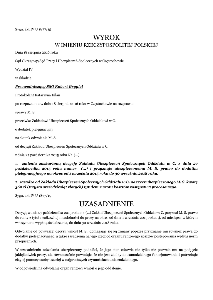 Sygn. akt IV U 1877/15 WYROK W IMIENIU RZECZYPOSPOLITEJ POLSKIEJ Dnia 18 sierpnia 2016 roku Sąd Okręgowy/Sąd Pracy i Ubezpieczeń Społecznych w Częstochowie Wydział IV w składzie: Przewodniczący SSO Robert Grygiel Protokolant Katarzyna Kilan po rozpoznaniu w dniu 18 sierpnia 2016 roku w Częstochowie na rozprawie sprawy M. S. przeciwko Zakładowi Ubezpieczeń Społecznych Oddziałowi w C. o dodatek pielęgnacyjny na skutek odwołania M. S. od decyzji Zakładu Ubezpieczeń Społecznych Oddziału w C. z dnia 27 października 2015 roku Nr (...) 1. zmienia zaskarżoną decyzję Zakładu Ubezpieczeń Społecznych Oddziału w C. z dnia 27 października 2015 roku numer (...) i przyznaje ubezpieczonemu M. S. prawo do dodatku pielęgnacyjnego na okres od 1 września 2015 roku do 30 września 2018 roku. 2. zasądza od Zakładu Ubezpieczeń Społecznych Oddziału w C. na rzecz ubezpieczonego M. S. kwotę 360 zł (trzysta sześćdziesiąt złotych) tytułem zwrotu kosztów zastępstwa procesowego. Sygn. akt IV U 1877/15 UZASADNIENIE Decyzją z dnia 27 października 2015 roku nr (...) Zakład Ubezpieczeń Społecznych Oddział w C. przyznał M. S. prawo do renty z tytułu całkowitej niezdolności do pracy na okres od dnia 1 września 2015 roku, tj. od miesiąca, w którym wstrzymano wypłatę świadczenia, do dnia 30 września 2018 roku. Odwołanie od powyższej decyzji wniósł M. S., domagając się jej zmiany poprzez przyznanie mu również prawa do dodatku pielęgnacyjnego, a także zasądzenia na jego rzecz od organu rentowego kosztów postępowania według norm przepisanych. W uzasadnieniu odwołania ubezpieczony podniósł, że jego stan zdrowia nie tylko nie pozwala mu na podjęcie jakiejkolwiek pracy, ale równocześnie powoduje, że nie jest zdolny do samodzielnego funkcjonowania i potrzebuje ciągłej pomocy osoby trzeciej w najprostszych czynnościach dnia codziennego. W odpowiedzi na odwołanie organ rentowy wniósł o jego oddalenie. Sąd Okręgowy ustalił, co następuje: M. S. urodził się w dniu (...). W okresie do dnia 31 sierpnia 2013 roku ubezpieczony był uprawniony do renty z tytułu częściowej niezdolności do pracy, a następnie do dnia 31 sierpnia 2015 roku do renty z tytułu całkowitej niezdolności do pracy, do której przysługiwało mu prawo do dodatku pielęgnacyjnego. W dniu 1 września 2015 roku odwołujący złożył wniosek o przyznanie mu prawa do renty z tytułu niezdolności do pracy na dalszy okres czasu. Rozpoznając powyższy wniosek organ rentowy skierował wnioskodawcę na badanie przez lekarza orzecznika ZUS, który orzeczeniem z dnia 17 września 2015 roku stwierdził, że badany jest całkowicie niezdolny do pracy na okres do dnia 30 września 2018 roku. Sprzeciw od powyższego orzeczenia wniósł odwołujący, jednakże orzeczeniem z dnia 15 października 2015 roku komisja lekarska przy Oddziale ZUS w C. podtrzymała stanowisko lekarza orzecznika. (v. akta rentowe) Obecnie u ubezpieczonego rozpoznaje się zaburzenia obsesyjno-kompulsywne, którym towarzyszy zespół depresyjny. W badaniu klinicznym uchwytne jest obniżenie funkcji poznawczych odwołującego, szczególnie w zakresie koncentracji uwagi. Wypowiedzi odwołującego są rozwlekłe, drobiazgowe koncentrujące się na myślach i czynnościach natrętnych, które musi stale powtarzać Czynności te i lęki są bardzo nieprzyjemne, wywołują zdenerwowanie i silnie zakłócają jego indywidualne i społeczne funkcjonowanie. Myśli i czynności natrętne, z rozbudowanymi rytuałami obronnymi o bardzo dużym nasileniu, całkowicie zaburzają życie prywatne i zawodowe M. S.. Zaburzenia te wywołują u ubezpieczonego nastrój przygnębienia i zmęczenie, brak inicjatywy, brak pewności siebie, niską samoocenę, powolność i narastającą senność. M. S. nie jest w stanie samodzielnie ubrać się w długie spodnie, posprzątać mieszkania, wynieść śmieci, itp. Aktualne nasilenie występujących u odwołującego zaburzeń psychicznych powoduje konieczność stałej pomocy i opieki innej osoby w zaspokajaniu podstawowych potrzeb życiowych, a jej brak będzie stanowił bezpośrednie zagrożenie dla jego zdrowia, a nawet życia. Powyższe schorzenia czynią badanego całkowicie niezdolnym do pracy i samodzielnej egzystencji z przyczyn psychiatrycznych na okres od 1 września 2013 roku do 30 września 2018 roku. (v. opinia biegłej sądowej z zakresu psychiatrii R. S. k. 15-18) Z powyższą opinią nie zgodził się organ rentowy, zarzucając że jak wynika z jej treści, ubezpieczony samodzielnie dba o higienę, wychodzi z domu, pod nieobecność żony robi zakupy, chodzi na posiłki do punktów gastronomicznych, samodzielnie spożywa posiłki i jest prawidłowo odżywiony. W skali (...) w zakresie czynności, których według biegłej odwołujący nie jest w stanie wykonywać, uzyskał 100 pkt – maksimum. Wskazując na powyższe organ rentowy wniósł o dopuszczenie dowodu z opinii innego biegłego psychiatry. (v. pismo ZUS z dnia 23 marca 2016 roku k. 31-32) Drugi biegły sądowy z zakresu psychiatrii M. M. rozpoznał u odwołującego zaburzenia obsesyjno-kompulsywne ze znacznym ograniczeniem wglądu, którym towarzyszą objawy zespołu depresyjnego. W obrazie klinicznym ubezpieczonego dominują rozbudowane myśli obsesyjne i natrętne czynności, które musi on bezkrytycznie wykonywać w formie rozbudowanych rytuałów, na które poświęca większość swego czasu, mających go zabezpieczyć przed jego obsesjami. Te z kolei mają charakter bardzo silnych doznań lękowych, przede wszystkim skupionych na możliwości zakażenia się zarazkami i brudem, ściśle związanych z poczuciem bezradności i bezbronności wobec przytłaczających go zagrożeń. Powyższe zaburzenia uniemożliwiają odwołującemu samodzielne, normalne funkcjonowanie społeczne i zawodowe. Ubezpieczony jest osobą całkowicie bezradną w prostych nawet czynnościach życiowych i wymaga pomocy osoby drugiej w
