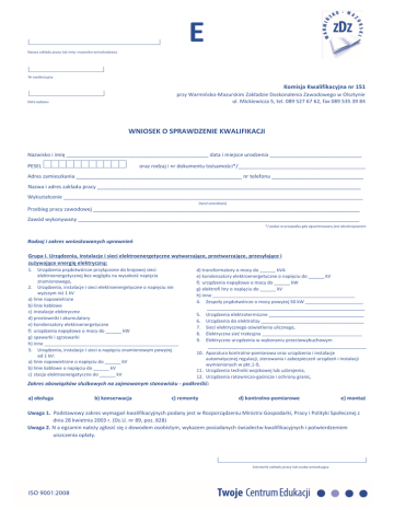 E Nazwa zakładu pracy lub imię i nazwisko wnioskodawcy Nr ewidencyjny Komisja Kwalifikacyjna nr 151 przy Warmińsko-Mazurskim Zakładzie Doskonalenia Zawodowego w Olsztynie ul. Mickiewicza 5, tel. 089 527 67 62, fax 089 535 39 84 Data wpływu WNIOSEK O SPRAWDZENIE KWALIFIKACJI Nazwisko i imię ________________________________________________ data i miejsce urodzenia _______________________________ PESEL oraz rodzaj i nr dokumentu tożsamości*/___________________________________________ Adres zamieszkania ________________________________________________________ nr telefonu _______________________________ Nazwa i adres zakładu pracy _________________________________________________________________________________________ Wykształcenie _____________________________________________________________________________________________________ (tytuł zawodowy) Przebieg pracy zawodowej __________________________________________________________________________________________ Zawód wykonywany _______________________________________________________________________________________________ */ podać w przypadku gdy egzaminowany jest obcokrajowcem Rodzaj i zakres wnioskowanych uprawnień Grupa I. Urządzenia, instalacje i sieci elektroenergetyczne wytwarzające, przetwarzające, przesyłające i zużywające energię elektryczną: 1. Urządzenia prądotwórcze przyłączone do krajowej sieci elektroenergetycznej bez względu na wysokość napięcia znamionowego, 2. Urządzenia, instalacje i sieci elektroenergetyczne o napięciu nie wyższym niż 1 kV a) linie napowietrzne b) linie kablowe c) instalacje elektryczne d) prostowniki i akumulatory e) kondensatory elektroenergetyczne f) urządzenia napędowe o mocy do ______ kW g) spawarki i zgrzewarki h) inne ___________________________________________________ 3. Urządzenia, instalacje i sieci o napięciu znamionowym powyżej od 1 kV: a) linie napowietrzne o napięciu do ______ kV b) linie kablowe o napięciu do ______ kV c) stacje elektroenergetyczne do ______ kV d) transformatory o mocy do ______ kVA e) kondensatory elektroenergetyczne o napięciu do ______ kV f) urządzenia napędowe o mocy do ______ kW g) elektrofi ltry o napięciu do ______ kV h) inne ______________________________________________________ 4. Zespoły prądotwórcze o mocy powyżej 50 kW ______________________ ____________________________________________________________ 5. Urządzenia elektrotermiczne ____________________________________ 6. Urządzenia do elektrolizy _______________________________________ 7. Sieci elektrycznego oświetlenia ulicznego, 8. Elektryczna sieć trakcyjna ______________________________________ 9. Elektryczne urządzenia w wykonaniu przeciwwybuchowym ____________________________________________________________ 10. Aparatura kontrolno-pomiarowa oraz urządzenia i instalacje automatycznej regulacji, sterowania i zabezpieczeń urządzeń i instalacji wymienionych w pkt.1-9, 11. Urządzenia techniki wojskowej lub uzbrojenia, 12. Urządzenia ratowniczo-gaśnicze i ochrony granic, Zakres obowiązków służbowych na zajmowanym stanowisku - podkreślić: a) obsługa b) konserwacja c) remonty d) kontrolno-pomiarowe e) montaż Uwaga 1. Podstawowy zakres wymagań kwalifikacyjnych podany jest w Rozporządzeniu Ministra Gospodarki, Pracy i Polityki Społecznej z dnia 28 kwietnia 2003 r. (Dz.U. nr 89, poz. 828) Uwaga 2. N a egzamin należy zgłosić się z dowodem osobistym, wykazem posiadanych świadectw kwalifikacyjnych i potwierdzeniem uiszczenia opłaty. kierownik zakładu pracy lub osoba wnioskująca E ______________________ dnia ________________________ r. Pieczęć komisji kwalifikacyjnej PROTOKÓŁ Z EGZAMINU Nr ______________________ Nazwisko i imię egzaminowanego ____________________________________________________________________________________ Wyniki egzaminu sprawdzające kwalifikacje do wykonywania pracy na stanowisku eksploatacji: Wiedza z zakresu: Ocena Zasady budowy, działania oraz warunki techniczne obsługi urządzeń, instalacji i sieci energetycznych Zasady eksploatacji oraz instrukcje eksploatacji urządzeń, instalacji i sieci Zasady i warunki wykonywania prac kontrolno-pomiarowych i montażowych Zasady i wymagania bhp i ochrony przeciwpożarowej oraz umiejętności udzielania pierwszej pomocy Instrukcja w razie awarii, pożaru lub innego zagrożenia bezpieczeństwa obsługi urządzeń lub zagrożenia życia, zdrowia i środowiska Ogólna ocena egzaminu W wyniku egzaminu stwierdzono, że egzaminowany spełnia/nie spełnia wymagania kwalifikacyjne do wykonywania pracy na stanowisku: eksploatacji w zakresie obsługi, konserwacji, remontów, kontrolno-pomiarowym, montażowym* dla następujących urządzeń, instalacji i sieci: (*zbędne skreślić) __________________________________________________________________________________________________________________ __________________________________________________________________________________________________________________ __________________________________________________________________________________________________________________ __________________________________________________________________________________________________________________ __________________________________________________________________________________________________________________ __________________________________________________________________________________________________________________ __________________________________________________________________________________________________________________ __________________________________________________________________________________________________________________ __________________________________________________________________________________________________________________ __________________________________________________________________________________________________________________ _____________________________________________________________________