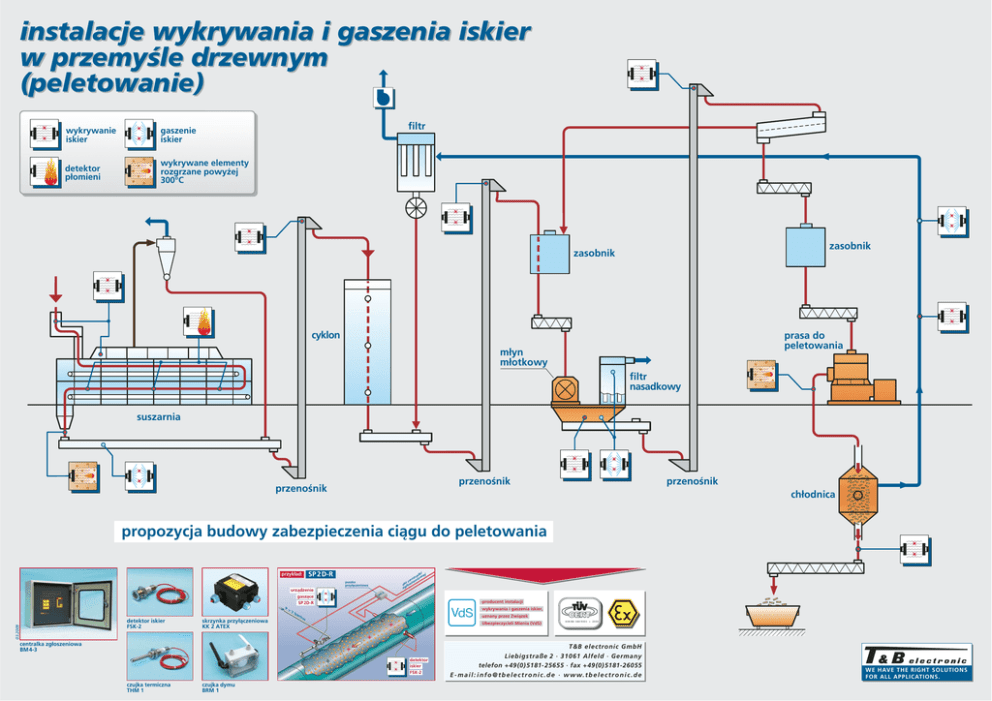 instalacje wykrywania i gaszenia iskier w przemyśle drzewnym (peletowanie) filtr wykrywanie iskier gaszenie gaszenie iskier iskier detektor płomieni wykrywane elementy rozgrzane powyżej 300°C zasobnik zasobnik cyklon prasa do peletowania młyn młotkowy filtr nasadkowy suszarnia przenośnik przenośnik przenośnik chłodnica propozycja budowy zabezpieczenia ciągu do peletowania przykład: SP 2 D-R i lk j ra we nt io cezen o s d ło zg puszka przyłączeniowa urządzenie gaszące SP 2D-R P> 7b KK 2 -producent instalacji VdS ar 03.2009 detektor iskier FSK-2 skrzynka przyłączeniowa KK 2 ATEX ów detektor iskier FSK-2 czujka dymu BRM 1 uznany przez Związek Ubezpieczycieli Mienia (VdS) centralka zgłoszeniowa BM4-3 czujka termiczna THM 1 wykrywania i gaszenia iskier, DIN EN ISO 9001 : 2000 T&B electronic GmbH Liebigstraße 2 · 31061 Alfeld · Germany telefon + 49 (0) 5181-25655 · fax + 49 (0) 5181-26055 E - m a i l : i n f o @ t b e l e c t r o n i c . d e · w w w. t b e l e c t r o n i c . d e WE HAVE THE RIGHT SOLUTIONS FOR ALL APPLICATIONS.