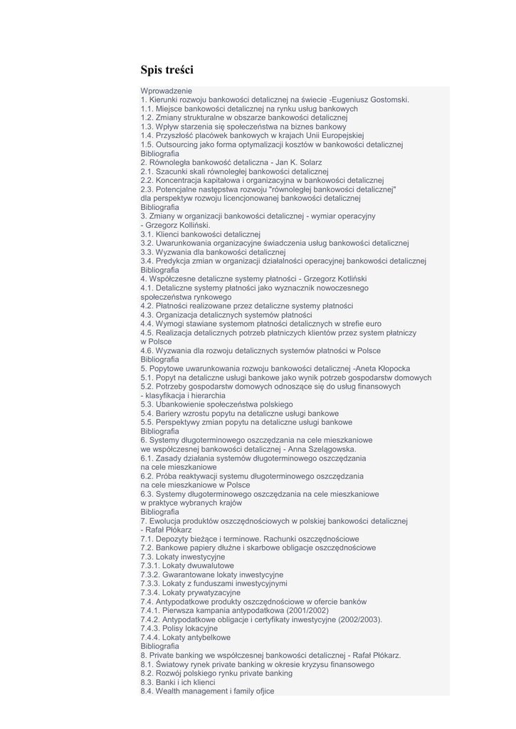 Spis treści Wprowadzenie 1. Kierunki rozwoju bankowości detalicznej na świecie -Eugeniusz Gostomski. 1.1. Miejsce bankowości detalicznej na rynku usług bankowych 1.2. Zmiany strukturalne w obszarze bankowości detalicznej 1.3. Wpływ starzenia się społeczeństwa na biznes bankowy 1.4. Przyszłość placówek bankowych w krajach Unii Europejskiej 1.5. Outsourcing jako forma optymalizacji kosztów w bankowości detalicznej Bibliografia 2. Równoległa bankowość detaliczna - Jan K. Solarz 2.1. Szacunki skali równoległej bankowości detalicznej 2.2. Koncentracja kapitałowa i organizacyjna w bankowości detalicznej 2.3. Potencjalne następstwa rozwoju "równoległej bankowości detalicznej" dla perspektyw rozwoju licencjonowanej bankowości detalicznej Bibliografia 3. Zmiany w organizacji bankowości detalicznej - wymiar operacyjny - Grzegorz Kolliński. 3.1. Klienci bankowości detalicznej 3.2. Uwarunkowania organizacyjne świadczenia usług bankowości detalicznej 3.3. Wyzwania dla bankowości detalicznej 3.4. Predykcja zmian w organizacji działalności operacyjnej bankowości detalicznej Bibliografia 4. Współczesne detaliczne systemy płatności - Grzegorz Kotliński 4.1. Detaliczne systemy płatności jako wyznacznik nowoczesnego społeczeństwa rynkowego 4.2. Płatności realizowane przez detaliczne systemy płatności 4.3. Organizacja detalicznych systemów płatności 4.4. Wymogi stawiane systemom płatności detalicznych w strefie euro 4.5. Realizacja detalicznych potrzeb płatniczych klientów przez system płatniczy w Polsce 4.6. Wyzwania dla rozwoju detalicznych systemów płatności w Polsce Bibliografia 5. Popytowe uwarunkowania rozwoju bankowości detalicznej -Aneta Kłopocka 5.1. Popyt na detaliczne usługi bankowe jako wynik potrzeb gospodarstw domowych 5.2. Potrzeby gospodarstw domowych odnoszące się do usług finansowych - klasyfikacja i hierarchia 5.3. Ubankowienie społeczeństwa polskiego 5.4. Bariery wzrostu popytu na detaliczne usługi bankowe 5.5. Perspektywy zmian popytu na detaliczne usługi bankowe Bibliografia 6. Systemy długoterminowego oszczędzania na cele mieszkaniowe we współczesnej bankowości detalicznej - Anna Szelągowska. 6.1. Zasady działania systemów długoterminowego oszczędzania na cele mieszkaniowe 6.2. Próba reaktywacji systemu długoterminowego oszczędzania na cele mieszkaniowe w Polsce 6.3. Systemy długoterminowego oszczędzania na cele mieszkaniowe w praktyce wybranych krajów Bibliografia 7. Ewolucja produktów oszczędnościowych w polskiej bankowości detalicznej - Rafał Płókarz 7.1. Depozyty bieżące i terminowe. Rachunki oszczędnościowe 7.2. Bankowe papiery dłużne i skarbowe obligacje oszczędnościowe 7.3. Lokaty inwestycyjne 7.3.1. Lokaty dwuwalutowe 7.3.2. Gwarantowane lokaty inwestycyjne 7.3.3. Lokaty z funduszami inwestycyjnymi 7.3.4. Lokaty prywatyzacyjne 7.4. Antypodatkowe produkty oszczędnościowe w ofercie banków 7.4.1. Pierwsza kampania antypodatkowa (2001/2002) 7.4.2. Antypodatkowe obligacje i certyfikaty inwestycyjne (2002/2003). 7.4.3. Polisy lokacyjne 7.4.4. Lokaty antybelkowe Bibliografia 8. Private banking we współczesnej bankowości detalicznej - Rafał Płókarz. 8.1. Światowy rynek private banking w okresie kryzysu finansowego 8.2. Rozwój polskiego rynku private banking 8.3. Banki i ich klienci 8.4. Wealth management i family ofjice 8.5. Oferta produktowa i struktura aktywów polskiej bankowości prywatnej Bibliografia 9. Produkty strukturyzowane na polskim rynku finansowym - Izabela Pruclmkka-Grabias 9.1. Istota i podstawowe rodzaje produktów strukturyzowanych 9.2. Produkty strukturyzowane na rynku pozagiełdowym w Polsce 9.3. Oferta Giełdy Papierów Wartościowych w Warszawie w zakresie produktów strukturyzowanych 9.3.1. Certyfikaty strukturyzowane 9.3.2. Obligacje strukturyzowane 9.4. Najważniejsze problemy rynku produktów strukturyzowanych w Polsce oraz perspektywy jego rozwoju w przyszłości Bibliografia 10. Perspektywy rozwoju kredytowania gospodarstw domowych w Polsce - Mariusz Zygierewicz 10.1. Aktualny rozwój akcji kredytowej dla gospodarstw domowych w Polsce. 10.2. Uwarunkowania ekonomiczne wzrostu działalności kredytowej dla gospodarstw domowych w Polsce 10.3. Rozwiązania regulacyjne Bibliografia 11. Kredyty konsumpcyjne dla gospodarstw domowych i ich warunki finansowe - Maria Magdalena Golec 11.1. Istota i rodzaje kredytów konsumpcyjnych dla gospodarstw domowych 11.2. Koszty kredytów konsumpcyjnych 11.3. Porównanie kosztów kredytów konsumpcyjnych Bibliografia 12. Ustawa antylichwiarska a ochrona interesów kredytobiorców - Urszula Wiśniewska 12.1. Lichwa w teorii 12.2. Ustawa antylichwiarska 12.3. Konsekwencje wprowadzenia ustawy antylichwiarskiej dla sektora bankowego 12.4. Zjawisko lichwy w światowych systemach bankowych Bibliografia 13. Metody pomiaru LGD dla kredytów detalicznych -Anna Matuszyk 13.1. Nowa Umowa Kapitałowa 13.2. Metody pomiaru ryzyka kredytowego 13.2.1. Podejście standardowe 13.2.2. Metoda wewnętrznych ratingów 13.3. Kredyty detaliczne w metodzie zaawansowanej 13.3.1. Wagi ryzyka 13.3.2. Porównanie metod: standardowej oraz ratingów wewnętrznych 13.4. Charakterystyka parametru LGD 13.4.1. Rozkład parametru LGD 13.4.2. Metody liczenia LGD w ramach metody zaawansowanej 13.4.2.1. Metoda wartości odzyskiwanej LGD 13.4.2.1.1. Ujemne wartości LGD (LGD < 0) oraz wartości LGD >1 13.4.2.1.2. Koniec procesu odzysku 13.4.2.2. Metoda rynkowej wartości LGD 13.4.2.3. Metoda implikowanej wartości rynkowej LGD 13.4.2.4. Metoda historycznej implikowanej wartości LGD Bibliografia 14. Fenomen rozwoju Alior Banku SA na polskim rynku usług bankowych - Anna Szdągowska 14.1. Koncepcja utworzenia Alior Banku SA 14.2. Tworzenie wizerunku Alior Banku SA 14.3. Założenia działalności Alior Banku SA w Polsce 14.4. Sieć placówek, zatrudnienie a wyniki finansowe Alior Banku SA Bibliografia 15. Wyłudzenia kredytów samochodowych a przestępczo