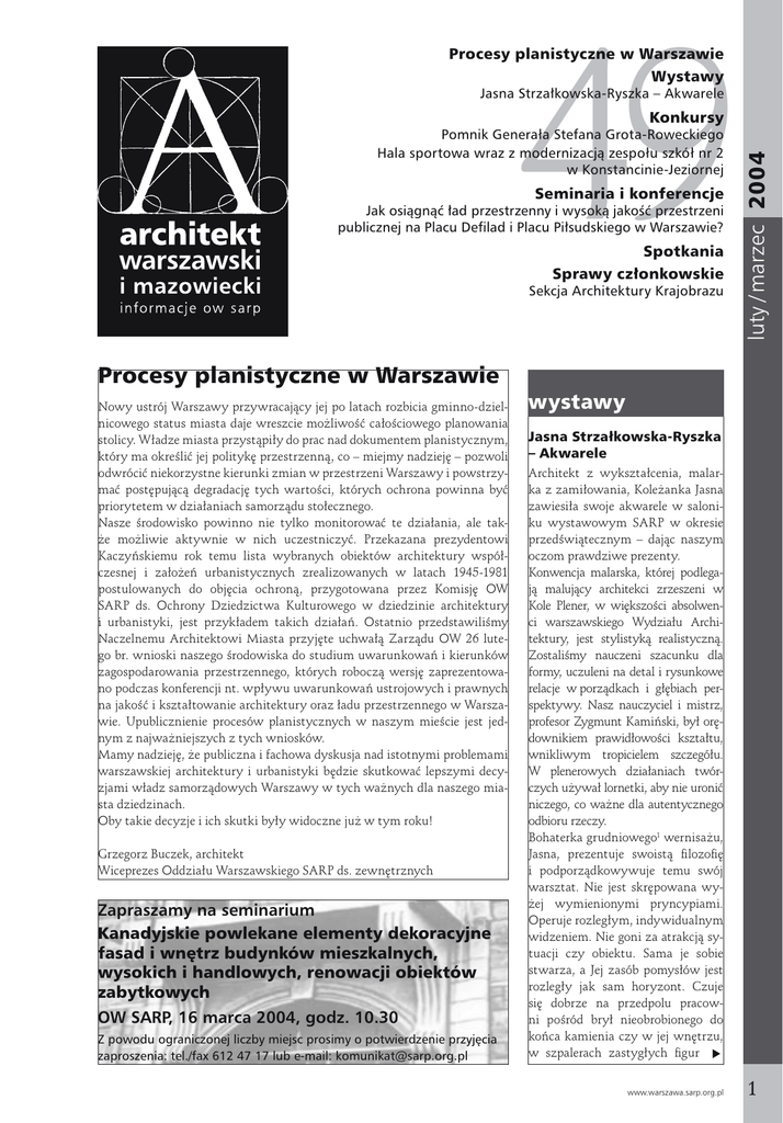 49 Procesy planistyczne w Warszawie Wystawy Jasna Strza∏kowska-Ryszka – Akwarele Seminaria i konferencje Jak osiàgnàç ∏ad przestrzenny i wysokà jakoÊç przestrzeni publicznej na Placu Defilad i Placu Pi∏sudskiego w Warszawie? Spotkania Sprawy cz∏onkowskie Sekcja Architektury Krajobrazu Procesy planistyczne w Warszawie Nowy ustrój Warszawy przywracajàcy jej po latach rozbicia gminno-dzielnicowego status miasta daje wreszcie mo˝liwoÊç ca∏oÊciowego planowania stolicy. W∏adze miasta przystàpi∏y do prac nad dokumentem planistycznym, który ma okreÊliç jej polityk´ przestrzennà, co – miejmy nadziej´ – pozwoli odwróciç niekorzystne kierunki zmian w przestrzeni Warszawy i powstrzymaç post´pujàcà degradacj´ tych wartoÊci, których ochrona powinna byç priorytetem w dzia∏aniach samorzàdu sto∏ecznego. Nasze Êrodowisko powinno nie tylko monitorowaç te dzia∏ania, ale tak˝e mo˝liwie aktywnie w nich uczestniczyç. Przekazana prezydentowi Kaczyƒskiemu rok temu lista wybranych obiektów architektury wspó∏czesnej i za∏o˝eƒ urbanistycznych zrealizowanych w latach 1945-1981 postulowanych do obj´cia ochronà, przygotowana przez Komisj´ OW SARP ds. Ochrony Dziedzictwa Kulturowego w dziedzinie architektury i urbanistyki, jest przyk∏adem takich dzia∏aƒ. Ostatnio przedstawiliÊmy Naczelnemu Architektowi Miasta przyj´te uchwa∏à Zarzàdu OW 26 lutego br. wnioski naszego Êrodowiska do studium uwarunkowaƒ i kierunków zagospodarowania przestrzennego, których roboczà wersj´ zaprezentowano podczas konferencji nt. wp∏ywu uwarunkowaƒ ustrojowych i prawnych na jakoÊç i kszta∏towanie architektury oraz ∏adu przestrzennego w Warszawie. Upublicznienie procesów planistycznych w naszym mieÊcie jest jednym z najwa˝niejszych z tych wniosków. Mamy nadziej´, ˝e publiczna i fachowa dyskusja nad istotnymi problemami warszawskiej architektury i urbanistyki b´dzie skutkowaç lepszymi decyzjami w∏adz samorzàdowych Warszawy w tych wa˝nych dla naszego miasta dziedzinach. Oby takie decyzje i ich skutki by∏y widoczne ju˝ w tym roku! Grzegorz Buczek, architekt Wiceprezes Oddzia∏u Warszawskiego SARP ds. zewn´trznych Zapraszamy na seminarium Kanadyjskie powlekane elementy dekoracyjne fasad i wn´trz budynków mieszkalnych, wysokich i handlowych, renowacji obiektów zabytkowych OW SARP, 16 marca 2004, godz. 10.30 wystawy Jasna Strzałkowska-Ryszka – Akwarele Architekt z wykszta∏cenia, malarka z zami∏owania, Kole˝anka Jasna zawiesi∏a swoje akwarele w saloniku wystawowym SARP w okresie przedÊwiàtecznym – dajàc naszym oczom prawdziwe prezenty. Konwencja malarska, której podlegajà malujàcy architekci zrzeszeni w Kole Plener, w wi´kszoÊci absolwenci warszawskiego Wydzia∏u Architektury, jest stylistykà realistycznà. ZostaliÊmy nauczeni szacunku dla formy, uczuleni na detal i rysunkowe relacje w porzàdkach i g∏´biach perspektywy. Nasz nauczyciel i mistrz, profesor Zygmunt Kamiƒski, by∏ or´downikiem prawid∏owoÊci kszta∏tu, wnikliwym tropicielem szczegó∏u. W plenerowych dzia∏aniach twórczych u˝ywa∏ lornetki, aby nie uroniç niczego, co wa˝ne dla autentycznego odbioru rzeczy. Bohaterka grudniowego1 wernisa˝u, Jasna, prezentuje swoistà filozofi´ i podporzàdkowywuje temu swój warsztat. Nie jest skr´powana wy˝ej wymienionymi pryncypiami. Operuje rozleg∏ym, indywidualnym widzeniem. Nie goni za atrakcjà sytuacji czy obiektu. Sama je sobie stwarza, a Jej zasób pomys∏ów jest rozleg∏y jak sam horyzont. Czuje si´ dobrze na przedpolu pracowni poÊród bry∏ nieobrobionego do koƒca kamienia czy w jej wn´trzu, w szpalerach zastyg∏ych figur ▲ Z powodu ograniczonej liczby miejsc prosimy o potwierdzenie przyj´cia zaproszenia: tel./fax 612 47 17 lub e-mail: [email protected] luty luty/marzec / marzec 2004 Konkursy Pomnik Generała Stefana Grota-Roweckiego Hala sportowa wraz z modernizacjà zespołu szkół nr 2 w Konstancinie-Jeziornej www.warszawa.sarp.org.pl 1 konkursy Pomnik Generała Stefana Grota-Roweckiego w Warszawie pozostawionych w smutku po zmar∏ym m´˝u, artyÊcie rzeêbiarzu. Wybiega w przestrzeƒ rozleg∏ych krajobrazów, zamykajàc je w poetyckim kadrze niedos∏ownoÊci. Nie czyha na s∏oƒce i kontrast cienia, lecz proponuje pejza˝ Êwietlisty we wszystkich aspektach, wykreowujàc zachwyt nad Êwiat∏em w jego codziennoÊci. Wydawaç si´ mo˝e, ˝e do tych akwarelowych obrazów i zbudowanych mokrymi plamami nastrojów u˝ywa tylko sobie znanej mikstury, jakiejÊ niedost´pnej wody. Mo˝e czerpanej z g∏´bi w∏asnym sposobem, oligoceƒskiej, mo˝e przywiezionej prosto z górskich potoków, êródlanej, a na pewno uÊwi´conej w∏asnym talentem. Kiedy spotykamy si´ na dorocznej, poplenerowej wystawie naszego Ko∏a, wieszam swoje obrazy w dobrym samopoczuciu. Lecz gdy ruszam w obchód, aby podglàdnàç konkurencj´, tu i ówdzie trac´ pewnoÊç siebie; przy pracach Jasnej jestem jej prawie pozbawiony. Ten Êwiat subtelnych zestawieƒ barwnych w obszernej aureoli, owe mgielne misterium sà jedynie dost´pne dla nielicznych malujàcych. Wielka szkoda, ˝e jako wieloletni, generalny projektant metra nie zostawi∏a nam wszystkim, warszawiakom i przyjezdnym, choçby jednej stacji we w∏asnej intelektualnej stylistyce, gdzie przemys∏owe, ch∏odne Êciany mog∏yby byç zamienione na Jej krajobrazy, wprowadzajàce w te ludne podziemia namiastk´ urody tajemnych ogrodów. Chocia˝by tak, jak uczyni∏ to swoimi witra˝ami Marc Chagall w gotyckich wn´trzach katedry we francuskim Metz2. W∏odzimierz Karczmarzyk 1 2 2 Wystawa w OW SARP – grudzieƒ 2003 Fragmenty przemówienia na zebraniu Ko∏a Plener 9 grudnia 2003 r. www.warszawa.sarp.org.pl Zarzàd Oddziału Warszawskiego SARP, działajàc na zamówienie Âwiatowego Zwiàzku ˚ołnierzy AK, ogłasza z dniem 23 lutego 2004 roku konkurs SARP nr 929 otwarty, ogólnopolski, realizacyjny, jednoetapowy, nieograniczony na