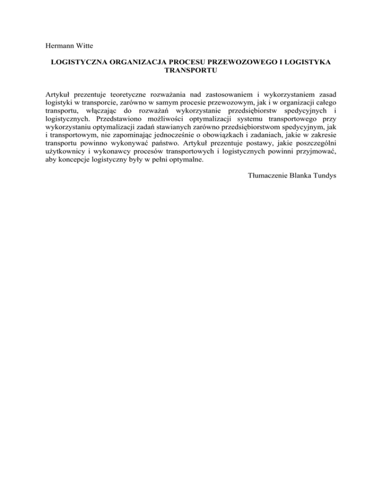 Hermann Witte LOGISTYCZNA ORGANIZACJA PROCESU PRZEWOZOWEGO I LOGISTYKA TRANSPORTU Artykuł prezentuje teoretyczne rozważania nad zastosowaniem i wykorzystaniem zasad logistyki w transporcie, zarówno w samym procesie przewozowym, jak i w organizacji całego transportu, włączając do rozważań wykorzystanie przedsiębiorstw spedycyjnych i logistycznych. Przedstawiono możliwości optymalizacji systemu transportowego przy wykorzystaniu optymalizacji zadań stawianych zarówno przedsiębiorstwom spedycyjnym, jak i transportowym, nie zapominając jednocześnie o obowiązkach i zadaniach, jakie w zakresie transportu powinno wykonywać państwo. Artykuł prezentuje postawy, jakie poszczególni użytkownicy i wykonawcy procesów transportowych i logistycznych powinni przyjmować, aby koncepcje logistyczny były w pełni optymalne. Tłumaczenie Blanka Tundys
