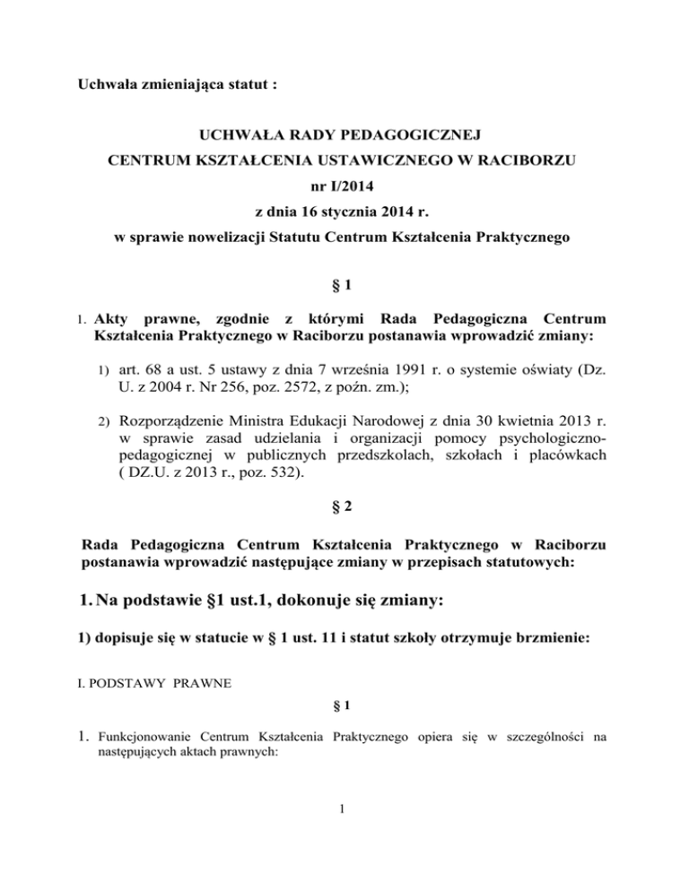 Uchwała zmieniająca statut : UCHWAŁA RADY PEDAGOGICZNEJ CENTRUM KSZTAŁCENIA USTAWICZNEGO W RACIBORZU nr I/2014 z dnia 16 stycznia 2014 r. w sprawie nowelizacji Statutu Centrum Kształcenia Praktycznego §1 1. Akty prawne, zgodnie z którymi Rada Pedagogiczna Centrum Kształcenia Praktycznego w Raciborzu postanawia wprowadzić zmiany: 1) art. 68 a ust. 5 ustawy z dnia 7 września 1991 r. o systemie oświaty (Dz. U. z 2004 r. Nr 256, poz. 2572, z poźn. zm.); 2) Rozporządzenie Ministra Edukacji Narodowej z dnia 30 kwietnia 2013 r. w sprawie zasad udzielania i organizacji pomocy psychologicznopedagogicznej w publicznych przedszkolach, szkołach i placówkach ( DZ.U. z 2013 r., poz. 532). §2 Rada Pedagogiczna Centrum Kształcenia Praktycznego w Raciborzu postanawia wprowadzić następujące zmiany w przepisach statutowych: 1. Na podstawie §1 ust.1, dokonuje się zmiany: 1) dopisuje się w statucie w § 1 ust. 11 i statut szkoły otrzymuje brzmienie: I. PODSTAWY PRAWNE §1 1. Funkcjonowanie Centrum Kształcenia Praktycznego opiera się w szczególności na następujących aktach prawnych: 1 1) Ustawie z dnia 7 września 1991 r. o systemie oświaty (tekst jednolity: Dz. U. nr 256 z 2004 r., poz. 2572 z późn. zm.); 2) Ustawie z dnia 27 sierpnia 2009 r. o finansach publicznych (Dz.U. nr 157 poz. 1240 z późn. zm.); 3) Rozporządzenie Ministra Edukacji Narodowej i Sportu z dnia 15 czerwca 2009 r. (Dz.U. 2009/99/828) w sprawie rodzajów, organizacji oraz sposobu działania publicznych placówek kształcenia ustawicznego i publicznych placówek kształcenia praktycznego, w tym publicznych ośrodków dokształcania i doskonalenia zawodowego; 4) Uchwały Rady Powiatu w Raciborzu Nr IX/65/99 z dnia 29 czerwca 1999 roku w sprawie utworzenia Centrum Kształcenia Praktycznego w Raciborzu, przy ul. Zamkowej 1. 5) Statut Centrum Kształcenia Ustawicznego 6) Dokumenty dotyczące praw dzieci: 1. Konwencja o prawach dziecka przyjęta przez Zgromadzenie Ogólne Narodów Zjednoczonych z 1989 r.; 2. Europejska konwencja o wykonaniu praw dziecka uchwalona przez Radę Europy, 3. Powszechna Deklaracja Praw Człowieka uchwalona przez Zgromadzenie Ogólne ONZ w 1948 r.; 4. Międzynarodowy Pakt Praw Obywatelskich i Politycznych; 5. Konwencja o Ochronie Praw Człowieka i Podstawowych Wolności; 7) Rozporządzenie Ministra Edukacji Narodowej i Sportu z dnia 13 czerwca 2003 r. (Dz. U. 2003/132/1225) w sprawie rodzajów, organizacji oraz sposobu działania publicznych placówek kształcenia ustawicznego i publicznych placówek kształcenia praktycznego, w tym publicznych ośrodków dokształcania i doskonalenia zawodowego. 8) Rozporządzenie Ministra Edukacji Narodowej i Sportu z dnia 13 czerwca 2003 r. (Dz.U 2003/132/1226) w sprawie ramowych statutów: publicznego centrum kształcenia ustawicznego, publicznego ośrodka dokształcania i doskonalenia zawodowego oraz publicznego centrum kształcenia praktycznego. 9) Rozporządzenie Ministra Edukacji Narodowej z dnia 15.12.2010 r. w sprawie praktycznej nauki zawodu (Dz.U nr 244 poz. 1626 z późń. zm.); 10) Ustawa z dnia 06.01.2000 r. (Dz.U 2000/6/69, 2008/214/1345, 2010/107/1307, 182/1228, 2011/168/1004) o Rzeczniku Praw Dziecka; 11) Rozporządzenie Ministra Edukacji Narodowej z dnia 30 kwietnia 2013 r. w sprawie zasad udzielania i organizacji pomocy psychologiczno-pedagogicznej w publicznych przedszkolach, szkołach i placówkach ( DZ.U. z 2013 r., poz. 532); 2. Na podstawie §1 ust.2, dokonuje się zmiany: 1) dopisuje się w statucie w § 18 ust. 19, 20, 21, 22, 23, 24 i statut szkoły otrzymuje brzmienie: 2 § 18 1. Uczeń jest objęty opieką pedagogiczną przez nauczycieli, opiekunów, dyrekcję Centrum. 2. Pomoc psychologiczną i pedagogiczną może uzyskać z inicjatywy własnej, rodziców i nauczycieli; koordynatorem tych działań jest pedagog szkolny szkoły macierzystej ucznia we współpracy z pozaszkolnymi instytucjami wychowawczymi. 3. W Centrum funkcjonuje Zespół Wychowawczy. 4. W Centrum jest opracowany i wdrożony Program Wychowawczy i Profilaktyki. 5. Program Wychowawczy i Profilaktyki jest integralną częścią Statutu Centrum Kształcenia Praktycznego zatwierdzony przez Radę Pedagogiczną. 6. Podczas zajęć edukacyjnych Centrum realizuje zadania wychowawcze. 7. Zadania i działania wychowawczo-profilaktyczne ujęte są w planach pracy Centrum. 8. Głównym celem wychowania jest : a) wspomaganie uczniów i słuchaczy w urzeczywistnieniu w ich życiu szerokiego spektrum wartości społecznych; b) kształtowanie sylwetki absolwenta przygotowanego do pełnienia funkcji rodzinnych, zawodowych i obywatelskich; 9. Działania wychowawcze w Centrum tworzą: a) treści wychowawcze programów poszczególnych zajęć edukacyjnych; b) programy dotyczące promocji zdrowia, kultury życia codziennego, komunikacji społecznej, asertywności, wspierania kariery zawodowej, itp.; 10. Zadania wychowawcze obejmują: a) powinności wychowawcze każdego nauczyciela, b) zadania, treści wychowawcze dla poszczególnych zajęć edukacyjnych 11. Działania wychowawcze Centrum: a) wychowanie do życia w społeczeństwie demokratycznym; b) kształtowanie właściwego stosunku do przyrody i ochrony środowiska; c) rozwijanie samodzielności i samorządności; d) kształtowanie postaw obywatelskich wobec własnego kraju; e) wdrażanie młodzieży do uczestnictwa w podstawowych formach życia kulturalnego, wychowania zdrowotnego; f) przeciwdziałanie niedostosowaniu społecznemu i demoralizacji; 12. Opiekunowie klas, nauczyciele, pracownicy Centrum są zobowiązani do realizacji zadań wychowawczych Centrum. 13. Realizacja zadań z zakresu profilaktyki ma na celu: a) kształtowanie postaw sprzyjających podejmowaniu racjonalnych związanych z potencjalnym uzależnieniami; b) bezpośrednie oddziaływanie na następstwa używania narkotyków, nikotyny, alkoholu; c) promowanie i kształtowanie wzorców w stylu zdrowego życia i spędzania wolnego czasu; 14. Zadania profila