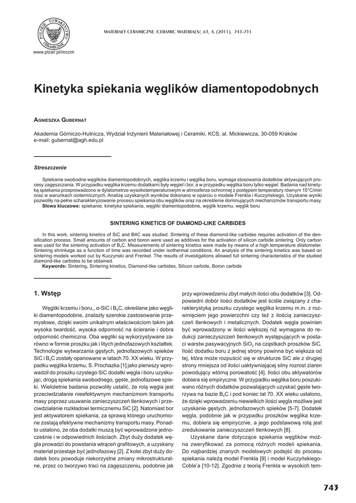 MATERIA£Y CERAMICZNE /CERAMIC MATERIALS/, 63, 4, (2011), 743-751 www.ptcer.pl/mccm Kinetyka spiekania wĊglików diamentopodobnych AGNIESZKA GUBERNAT Akademia Górniczo-Hutnicza, Wydziaá InĪynierii Materiaáowej i Ceramiki, KCS, al. Mickiewicza, 30-059 Kraków e-mail: [email protected] Streszczenie Spiekanie swobodne wĊglików diamentopodobnych, wĊglika krzemu i wĊglika boru, wymaga stosowania dodatków aktywujących procesy zagĊszczania. W przypadku wĊglika krzemu dodatkami byáy wĊgiel i bor, a w przypadku wĊglika boru tylko wĊgiel. Badania nad kinetyką spiekania przeprowadzono w dylatometrze wysokotemperaturowym w atmosferze ochronnej z postĊpem temperatury równym 15°C/min oraz w warunkach izotermicznych. AnalizĊ uzyskanych wyników dokonano w oparciu o modele Frenkla i KuczyĔskiego. Uzyskane wyniki pozwoliáy na peáne scharakteryzowanie procesu spiekania obu wĊglików oraz na okreĞlenie dominujących mechanizmów transportu masy. Sáowa kluczowe: spiekanie, kinetyka spiekania, wĊgliki diamentopodobne, wĊglik krzemu, wĊglik boru SINTERING KINETICS OF DIAMOND-LIKE CARBIDES In this work, sintering kinetics of SiC and B4C was studied. Sintering of these diamond-like carbides requires activation of the densi¿cation process. Small amounts of carbon and boron were used as additives for the activation of silicon carbide sintering. Only carbon was used for the sintering activation of B4C. Measurements of sintering kinetics were made by means of a high temperature dilatometer. Sintering shrinkage as a function of time was recorded under isothermal conditions. An analysis of the sintering kinetics was based on sintering models worked out by Kuczynski and Frenkel. The results of investigations allowed full sintering characteristics of the studied diamond-like carbides to be obtained. Keywords: Sintering, Sintering kinetics, Diamond-like carbides, Silicon carbide, Boron carbide 1. WstĊp WĊgliki krzemu i boru,, Į-SiC i B4C, okreĞlane jako wĊgliki diamentopodobne, znalazáy szerokie zastosowanie przemysáowe, dziĊki swoim unikalnym wáaĞciwoĞciom takim jak wysoka twardoĞü, wysoka odpornoĞü na Ğcieranie i dobra odpornoĞü chemiczna. Oba wĊgliki są wykorzystywane zarówno w formie proszku jak i litych jednofazowych ksztaátek. Technologie wytwarzania gĊstych, jednofazowych spieków SiC i B4C zostaáy opanowane w latach 70. XX wieku. W przypadku wĊglika krzemu, S. Prochazka [1] jako pierwszy wprowadziá do proszku czystego SiC dodatki wĊgla i boru uzyskując, drogą spiekania swobodnego, gĊste, jednofazowe spieki. Wieloletnie badania pozwoliáy ustaliü, Īe rolą wĊgla jest przeciwdziaáanie nieefektywnym mechanizmom transportu masy poprzez usuwanie zanieczyszczeĔ tlenkowych i przeciwdziaáanie rozkáadowi termicznemu SiC [2]. Natomiast bor jest aktywatorem spiekania, za sprawą którego uruchomione zostają efektywne mechanizmy transportu masy. Ponadto ustalono, Īe oba dodatki muszą byü wprowadzone jednoczeĞnie i w odpowiednich iloĞciach. Zbyt duĪy dodatek wĊgla prowadzi do powstania wtrąceĔ gra¿towych, a uzyskany materiaá przestaje byü jednofazowy [2]. Z kolei zbyt duĪy dodatek boru powoduje niekorzystne zmiany mikrostrukturalne, przez co tworzywo traci na zagĊszczeniu, podobnie jak przy wprowadzeniu zbyt maáych iloĞci obu dodatków [3]. Odpowiedni dobór iloĞci dodatków jest ĞciĞle związany z charakterystyką proszku czystego wĊglika krzemu m.in. z rozwiniĊciem jego powierzchni czy teĪ z iloĞcią zanieczyszczeĔ tlenkowych i metalicznych. Dodatek wĊgla powinien byü wprowadzony w iloĞci wiĊkszej niĪ wymagana do redukcji zanieczyszczeĔ tlenkowych wystĊpujących w postaci warstw pasywacyjnych SiO2 na cząstkach proszków SiC. IloĞü dodatku boru z jednej strony powinna byü wiĊksza od tej, która moĪe rozpuĞciü siĊ w strukturze SiC ale z drugiej strony mniejsza od iloĞci uaktywniającej silny rozrost ziaren powodujący wtórną porowatoĞü [4]. IloĞci obu aktywatorów dobiera siĊ empiryczne. W przypadku wĊglika boru poszukiwano róĪnych dodatków pozwalających uzyskaü gĊste tworzywa na bazie B4C i pod koniec lat 70. XX wieku ustalono, Īe dziĊki wprowadzeniu niewielkich iloĞci wĊgla moĪliwe jest uzyskanie gĊstych, jednofazowych spieków [5-7]. Dodatek wĊgla, podobnie jak w przypadku proszków wĊglika krzemu, dobiera siĊ empirycznie, a jego podstawową rolą jest zredukowanie zanieczyszczeĔ tlenkowych [8]. Uzyskane dane dotyczące spiekania wĊglików moĪna zwery¿kowaü za pomocą róĪnych modeli spiekania. Do najbardziej znanych modelowych podejĞü do procesu spiekania naleĪą model Frenkla [9] i model KuczyĔskiegoCoble’a [10-12]. Zgodnie z teorią Frenkla w wysokich tem- 743 A. GUBERNAT peraturach, podczas spiekania ukáadów záoĪonych z ziaren krystalicznych, moĪe wystąpiü páyniĊcie podobne do páyniĊcia lepkoĞciowego związane z nieodwracalną deformacją ukáadu ciaáo staáe-gaz. Praca ta rozpatruje zachowanie ukáadu w skali makroskopowej zgodnie z prawami reologii. Wg Frenkla wzrost skurczu ukáadu zachodzi liniowo z czasem izotermicznego spiekania zgodnie z równaniem: 'V V0 3 'L L0 K J t , KR (1) gdzie: K – staáa, 'L/L0 - skurcz wzglĊdny wybranego parametru liniowego próbki, Ȗ - energia swobodnej powierzchni ziaren, K - lepkoĞü pozorna ukáadu, R – promieĔ ziaren, t – czas spiekania. Jednak podstawowe znaczenie dla rozwoju teorii spiekania miaáy prace Coble’a [10] rozwijane nastĊpnie przez KuczyĔskiego [11, 12]. KuczyĔski podjąá próbĊ oceny wpáywu poszczególnych mechanizmów transportu masy na zmiany morfologii spiekanego ukáadu na uproszczonych ukáadach modelowych. NastĊpnie sformuáowaá i rozwiązaá fenomenologiczne równania transportu masy dla okreĞlonych ukáadów geometrycznych. PostĊp spiekania, w myĞl teorii KuczyĔskiego, moĪna Ğledziü obserwując zmiany skurczu caáego spiekanego ukáadu. Równanie kinetyczne opisujące tĊ zale